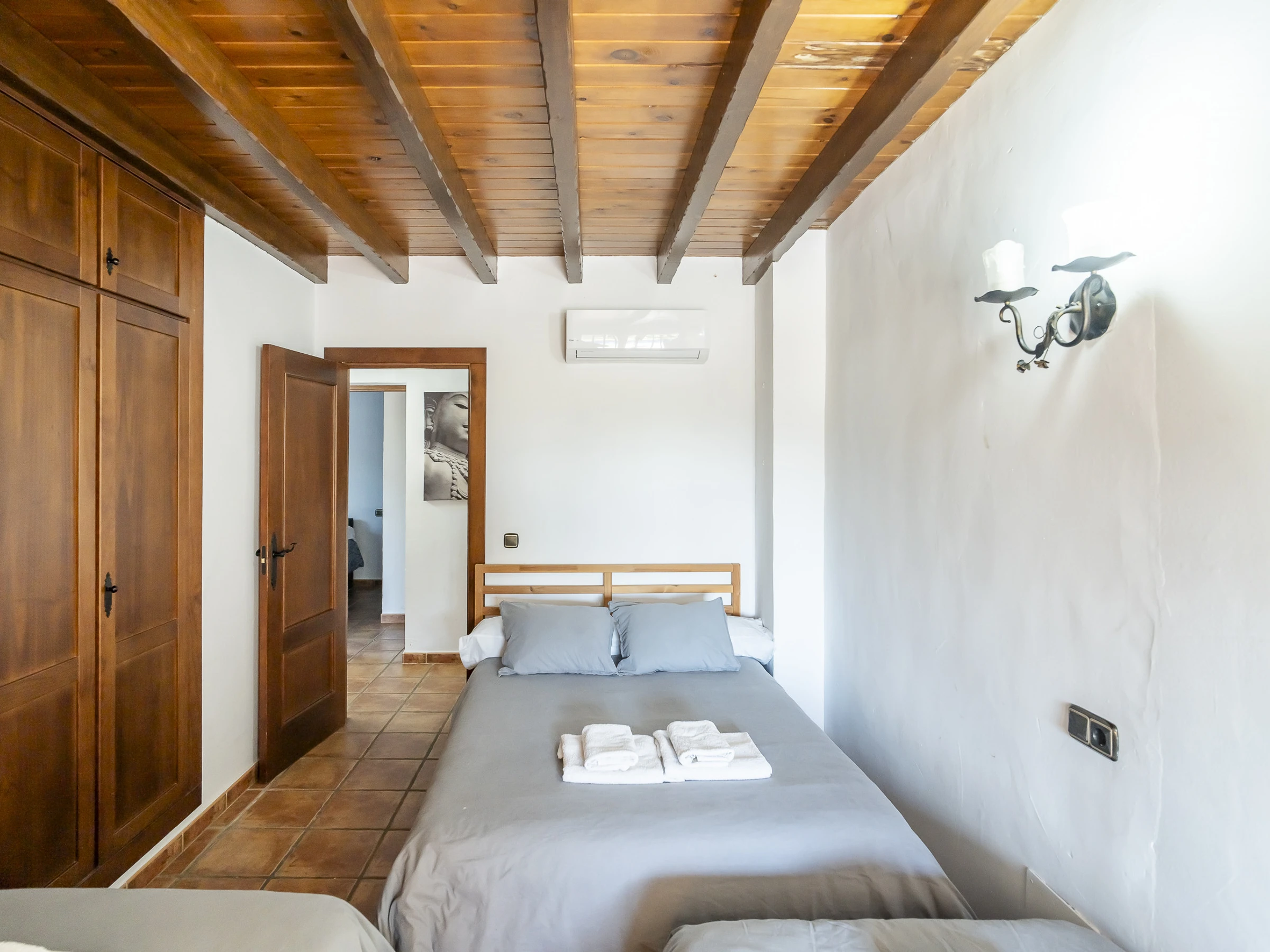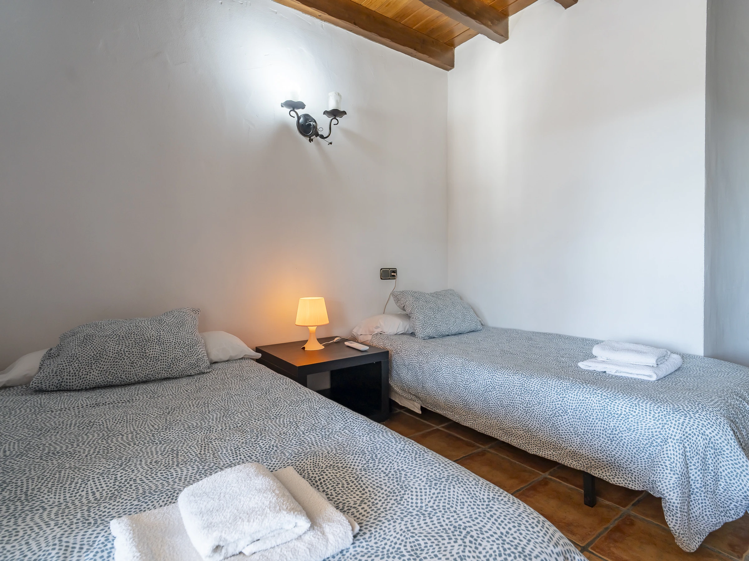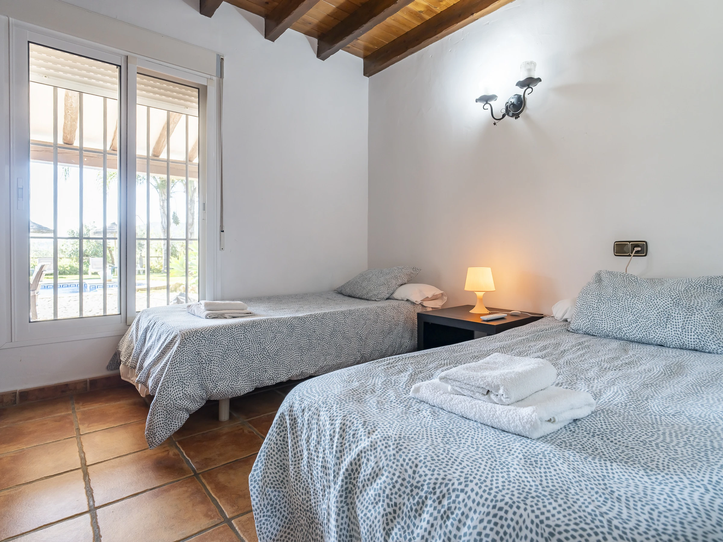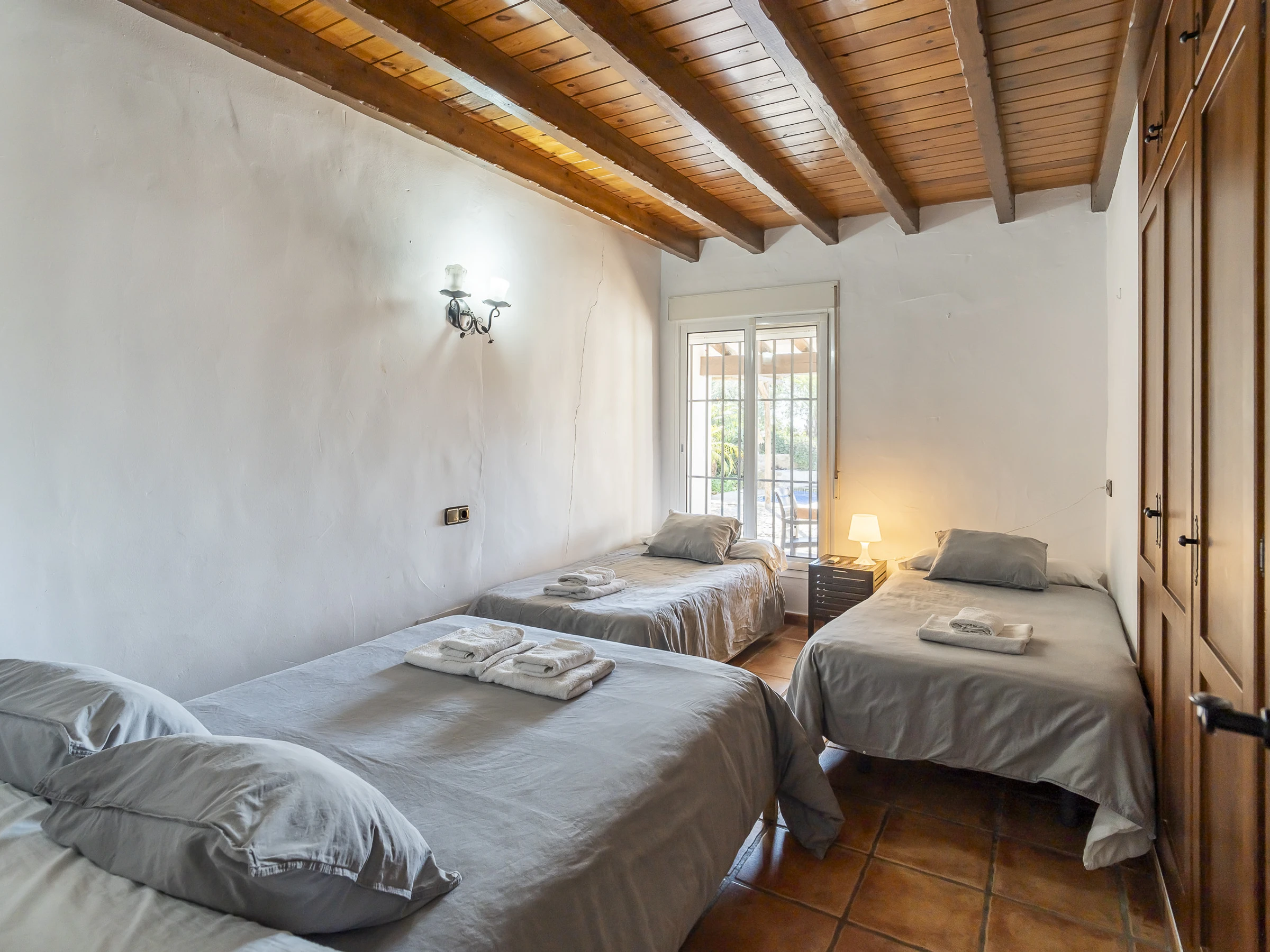 En su interior, la villa ofrece cuatro dormitorios espaciosos: uno con cama de matrimonio y dos camas individuales, dos dormitorios con cama de matrimonio y otro con dos camas individuales. Cuenta con tres baños completos y un aseo adicional, garantizando la máxima comodidad para grupos numerosos.