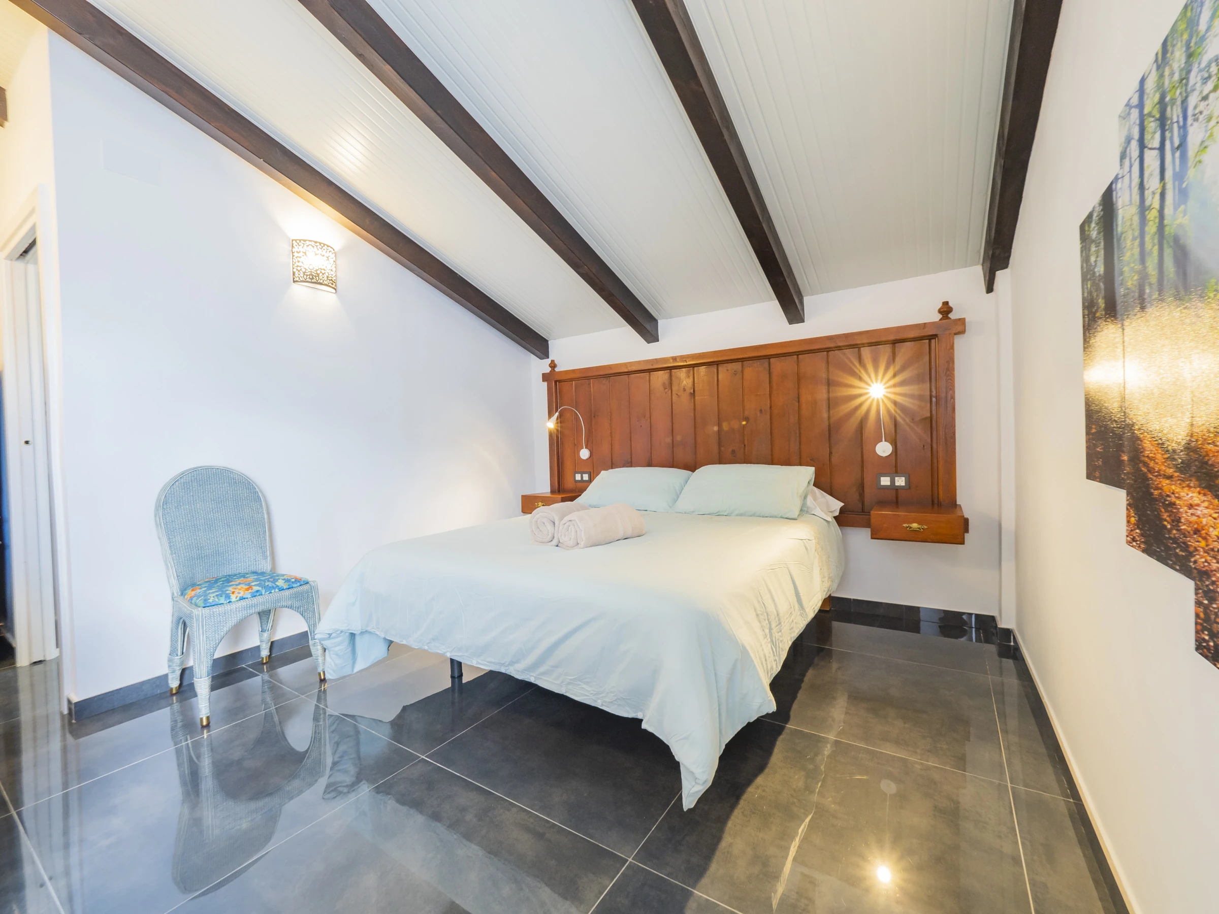 La planta superior alberga cuatro dormitorios dobles, cada uno con cama de matrimonio, baño en suite con plato de ducha, televisión y aire acondicionado con bomba de calor ❄️🔥. Dos dormitorios se orientan al norte y dos al sur, todos con terraza privada equipada para disfrutar de un café o del sol en un ambiente íntimo.