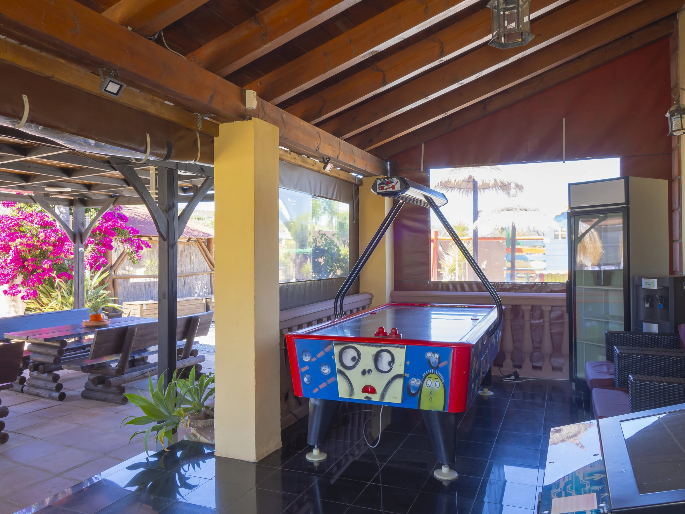 La finca, completamente vallada, cuenta con una amplia piscina privada de cloración salina climatizada e incluida en el precio, disponible del 1 de octubre al 31 de mayo, con cubierta de seguridad infantil, dos jacuzzis exteriores (disponibles también de octubre a mayo, con coste adicional), parque infantil, pequeño gimnasio y zonas de ocio con billar, futbolín, canasta de baloncesto y espacios de relax que garantizan entretenimiento para grandes y pequeños. 🌴🏊♂️👨👩👧👦