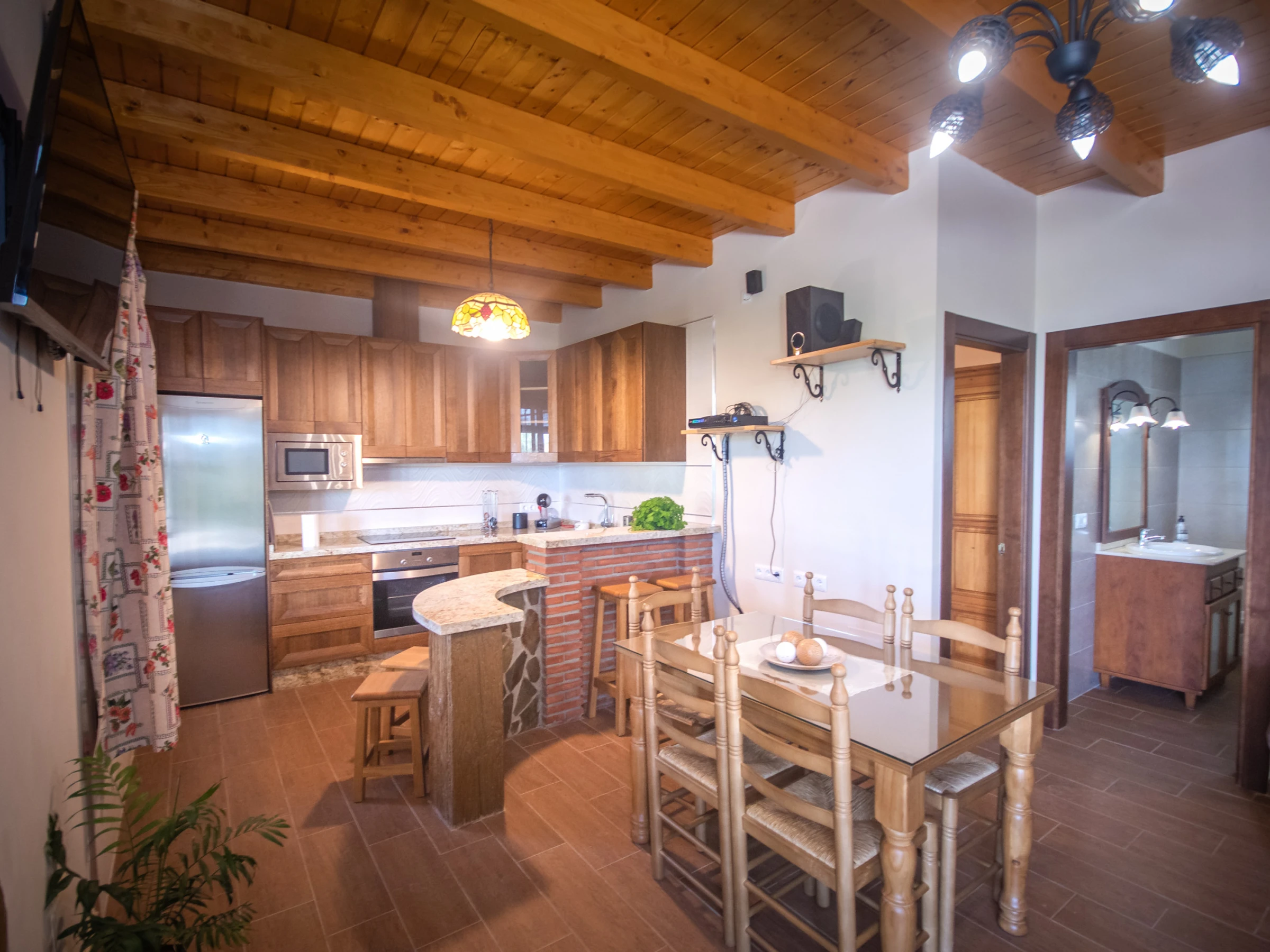 En el interior, el salón comedor y la cocina americana forman un espacio abierto y funcional. La cocina está equipada con horno y placa vitrocerámica para que prepares cualquier tipo de almuerzo o cena con total comodidad 🍳🍽️. El salón, con mesa familiar y un cómodo sofá, es el lugar perfecto para relajarte, ver la televisión o leer un buen libro 📺📚.