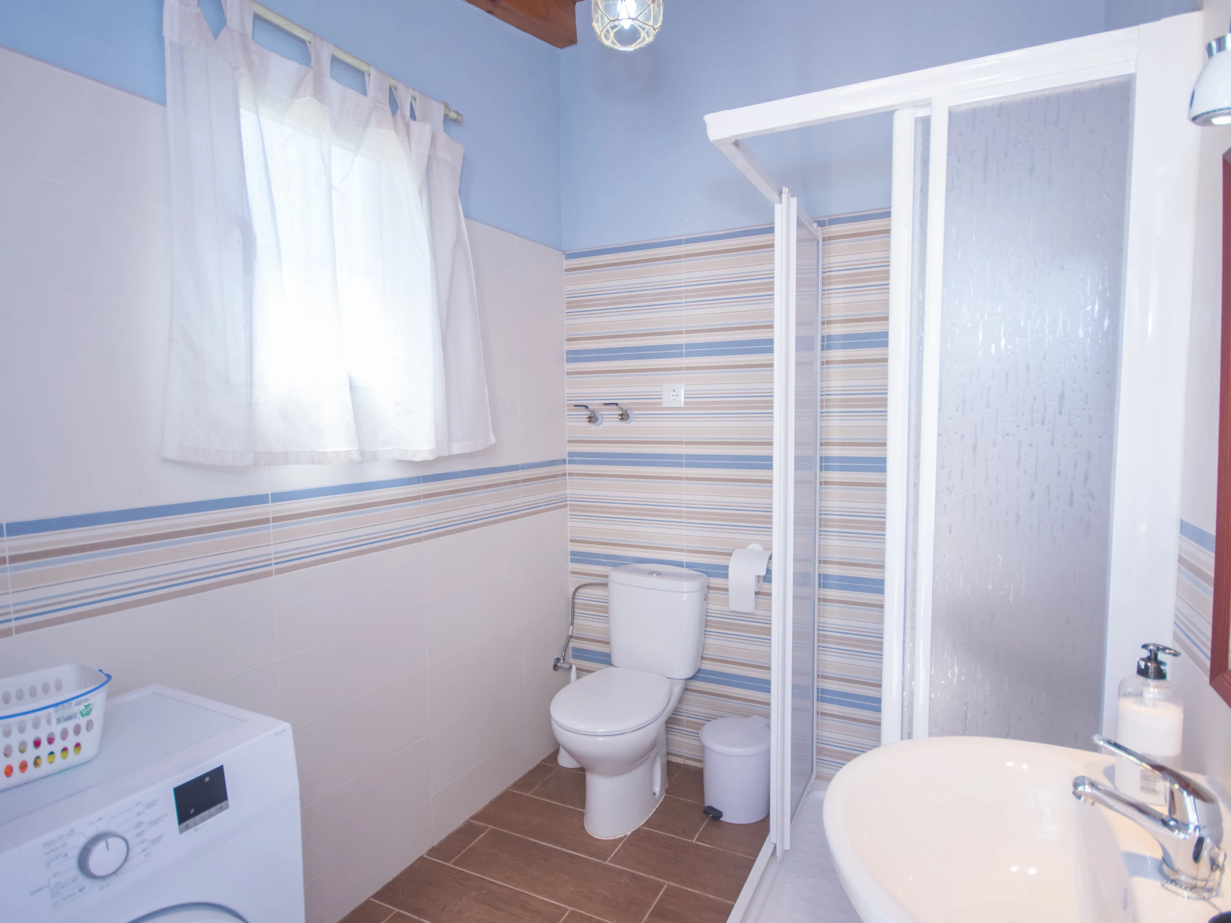 Además, junto a la piscina hay un aseo completo con plato de ducha, para que no necesites entrar mojado al alojamiento, y un espacio con lavadora para que puedas hacer la colada si lo deseas 🧺🚿.