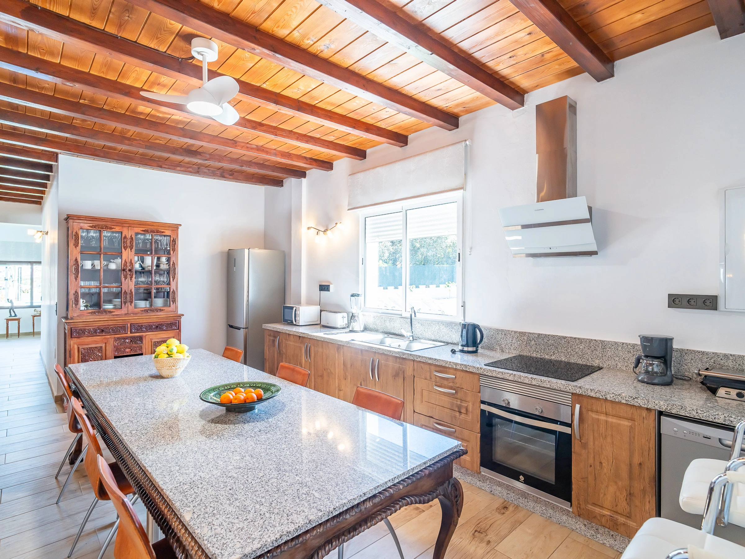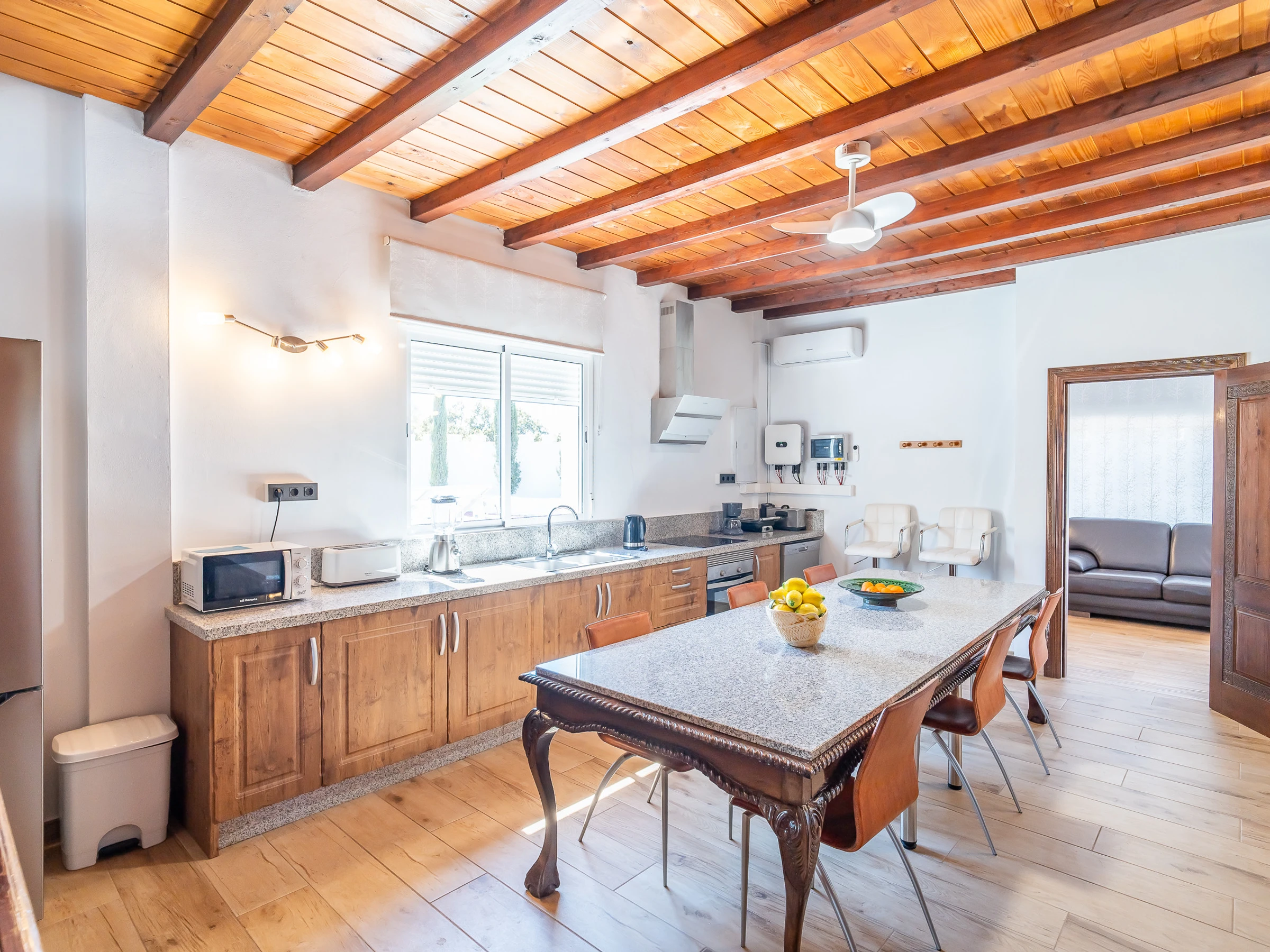 En el interior, la villa se distribuye en dos plantas. En la planta baja, un recibidor con espacios para lectura y reunión, un comedor independiente junto a una cocina totalmente equipada con electrodomésticos modernos (vitrocerámica, horno, microondas, lavavajillas, cafetera, etc.) 🍳, y un salón con gran sofá y televisión para compartir momentos en familia o disfrutar del Wi-Fi gratuito para teletrabajar o entretenimiento digital. Dispone de 2 habitaciones dobles así como también cuenta con un baño completo con plato de ducha y un cuarto de lavandería para mantener la ropa al día.