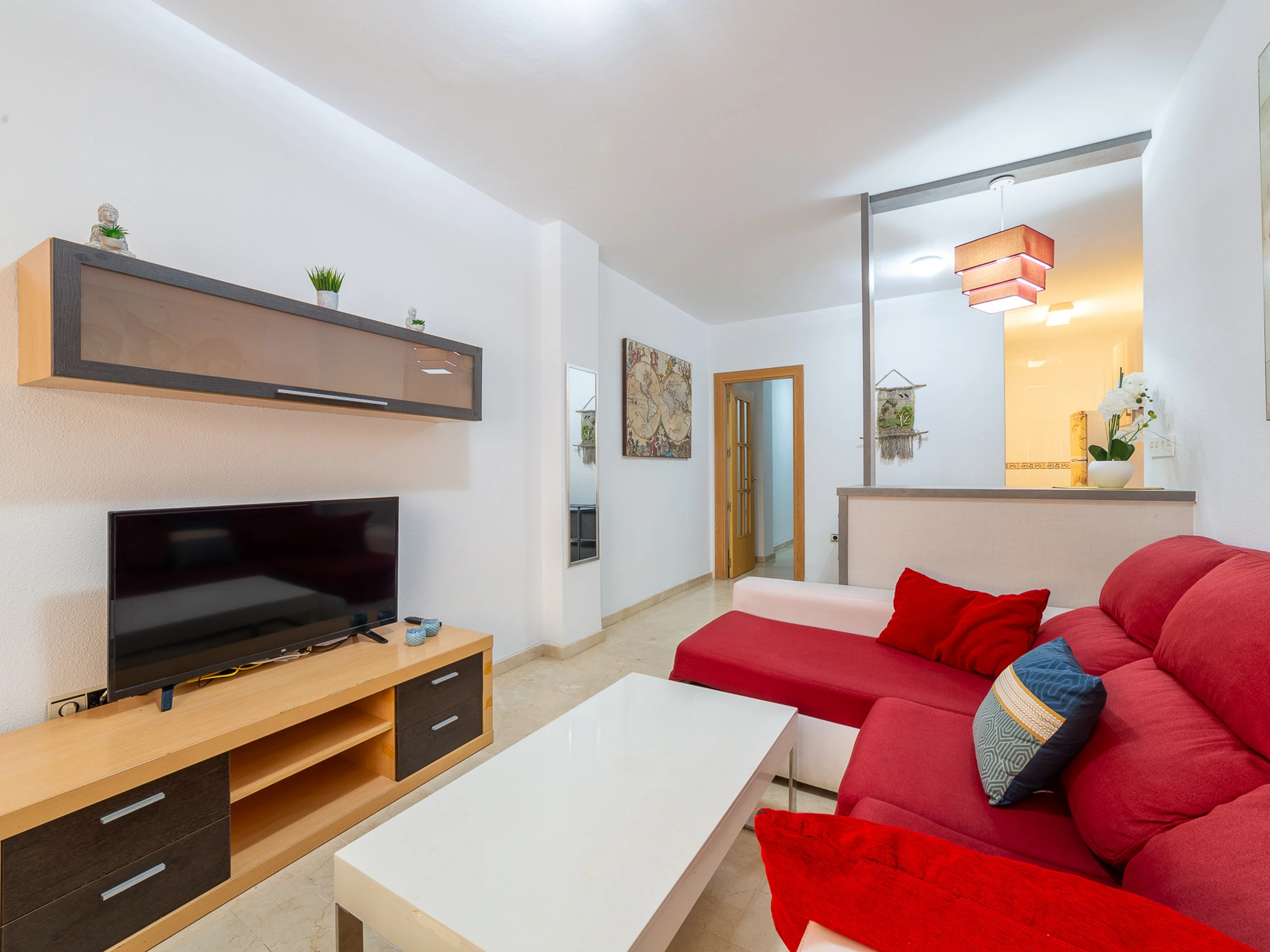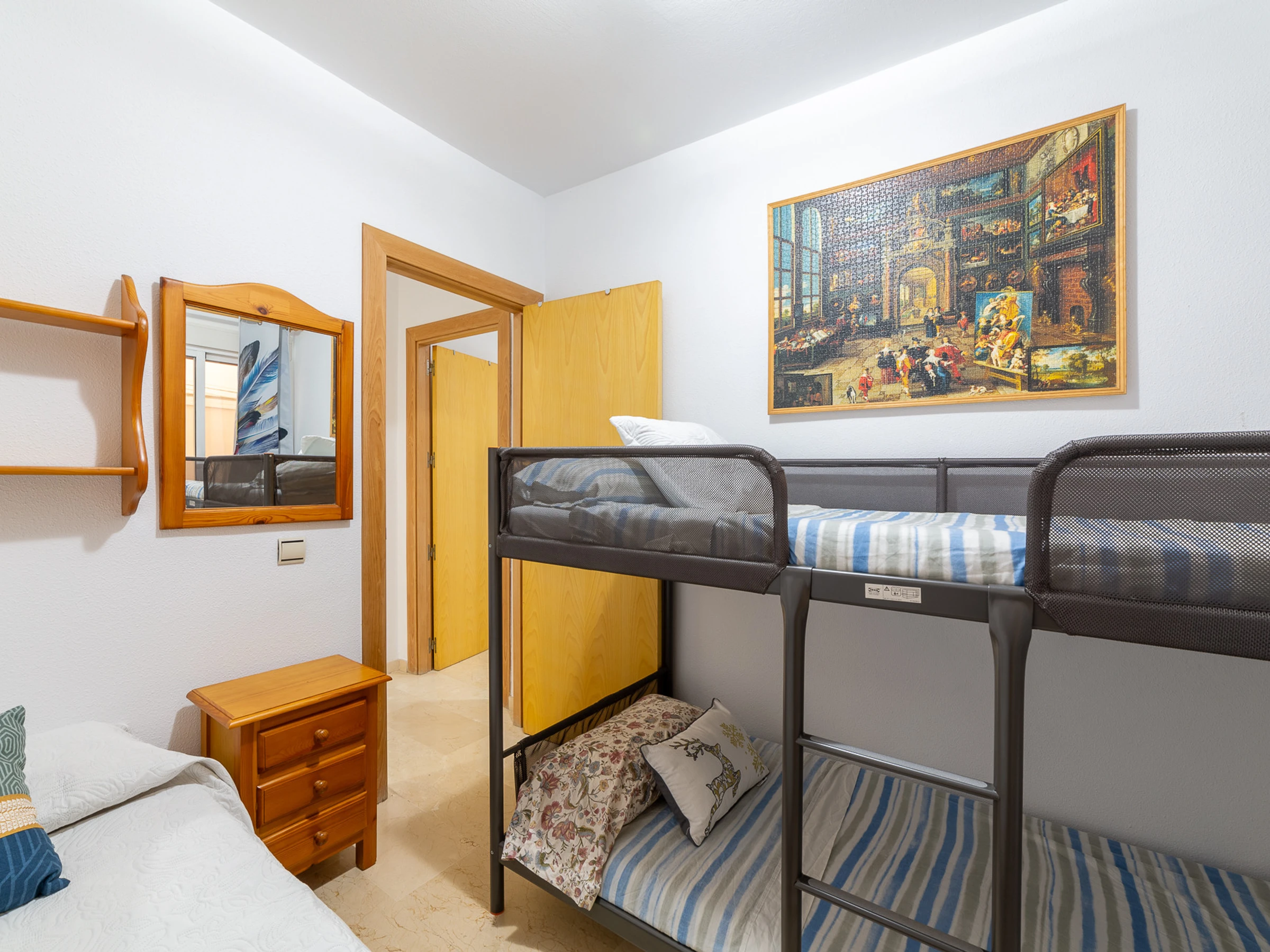 Completamente amueblado, luminoso y con todo lo necesario para gozar de una estancia ideal. Salón, con Chaise Longue convertible en cama, cocina con barra americana —totalmente equipada—integrada en el propio salón, patio interior, dormitorio con cama y litera, dormitorio principal con cama de matrimonio y baño.