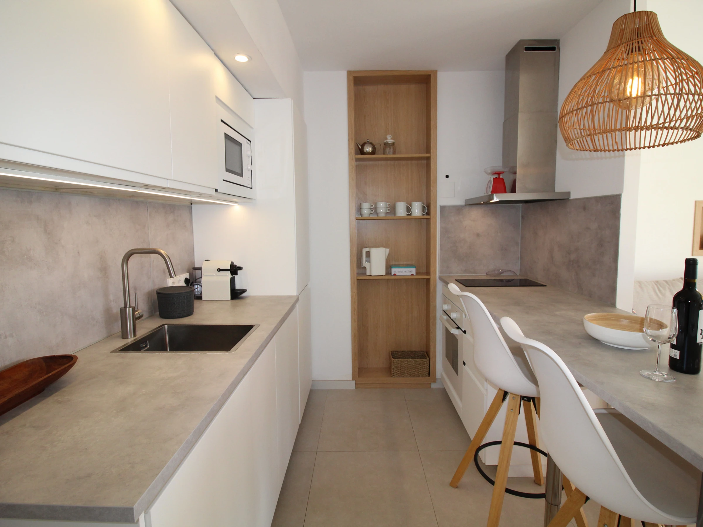 La cocina americana, de vitrocerámica, está equipada con nevera, microondas, horno, lavavajillas, vajilla/cubertería, utensilios/cocina, cafetera, tostadora y hervidor de agua.