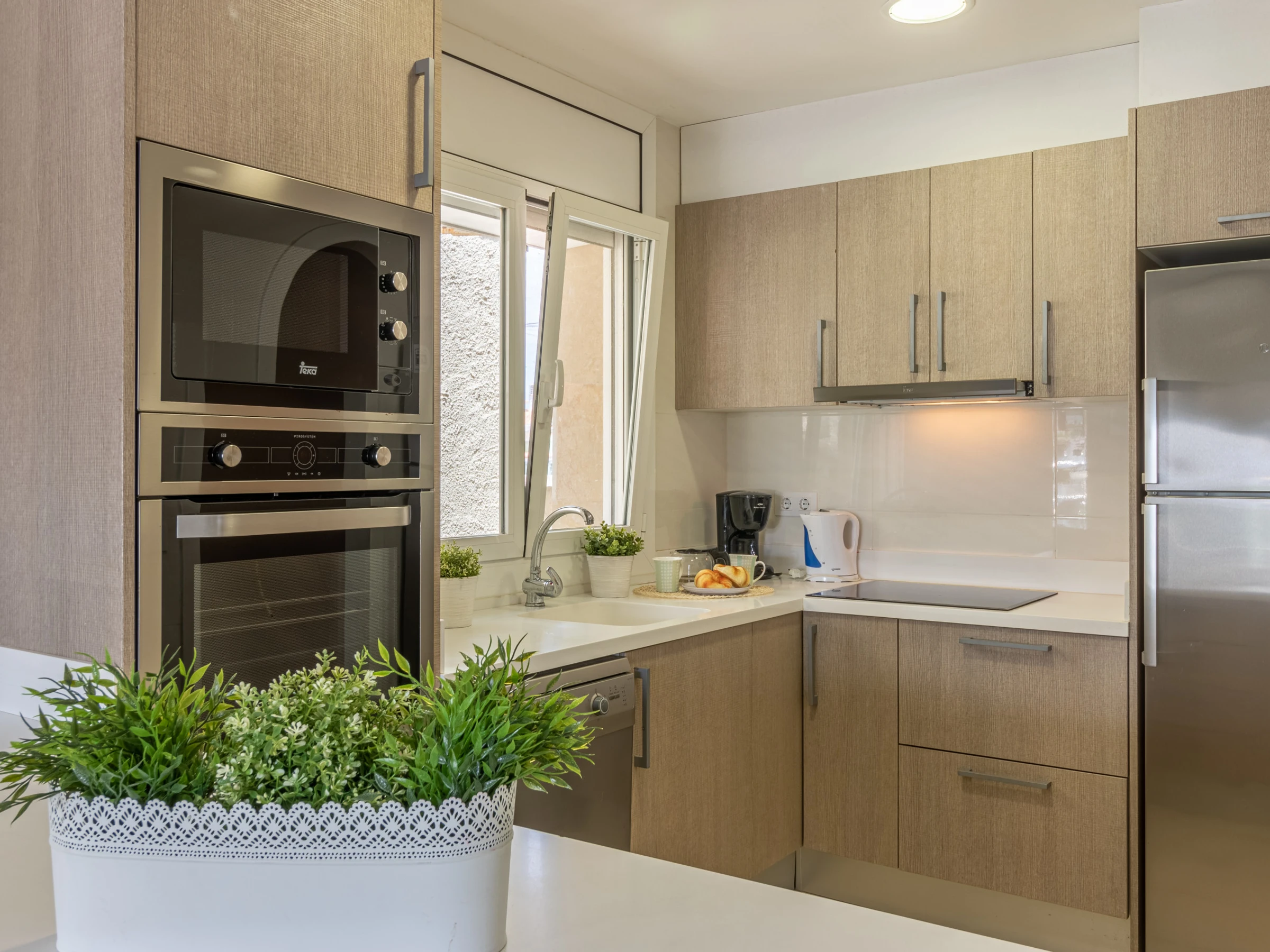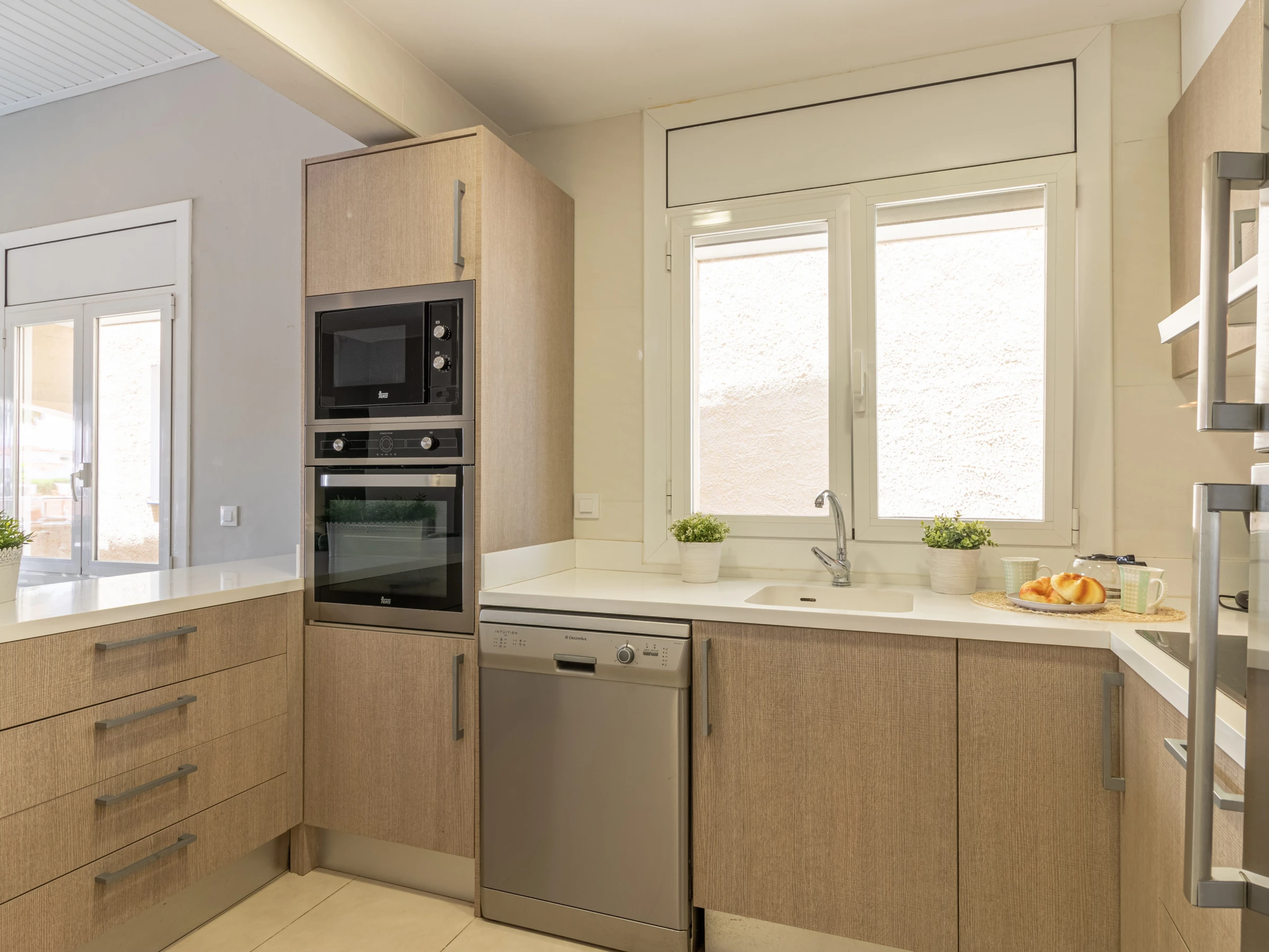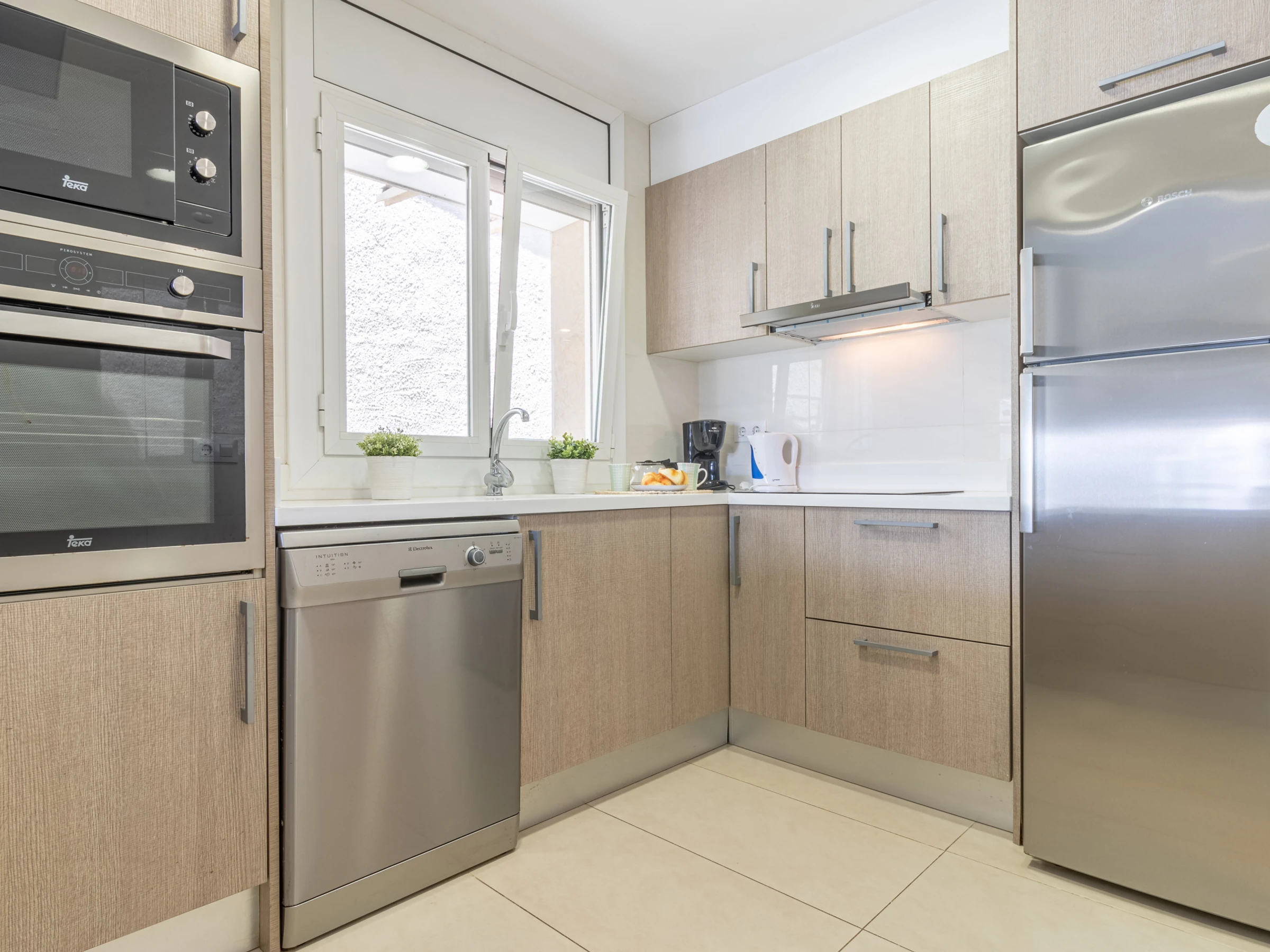 La cocina americana, de inducción, está equipada con nevera, microondas, horno, congelador, lavavajillas, vajilla/cubertería, utensilios de cocina, cafetera, tostadora y hervidor de agua.