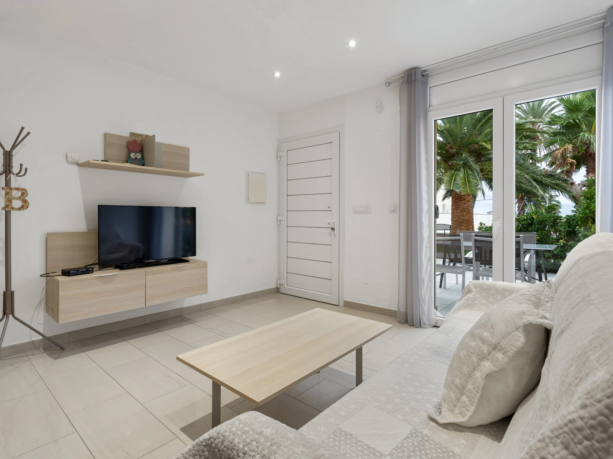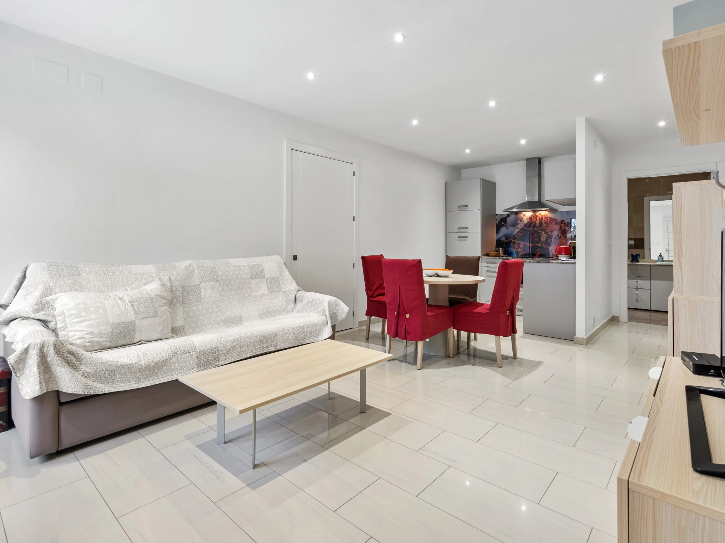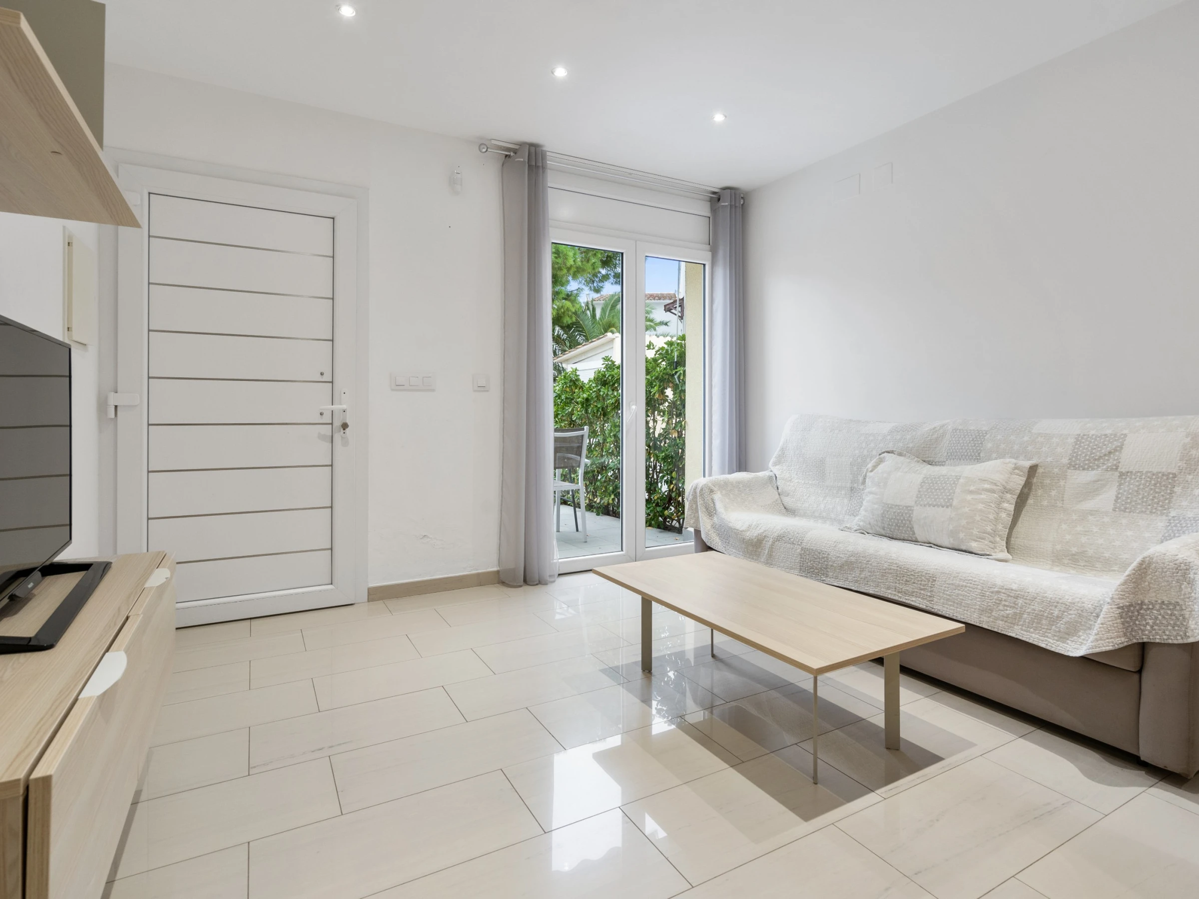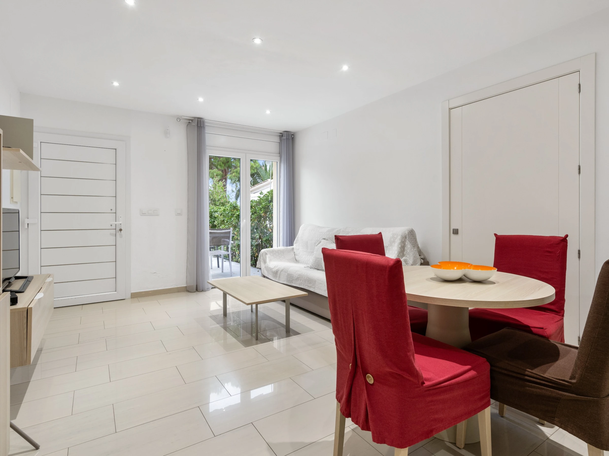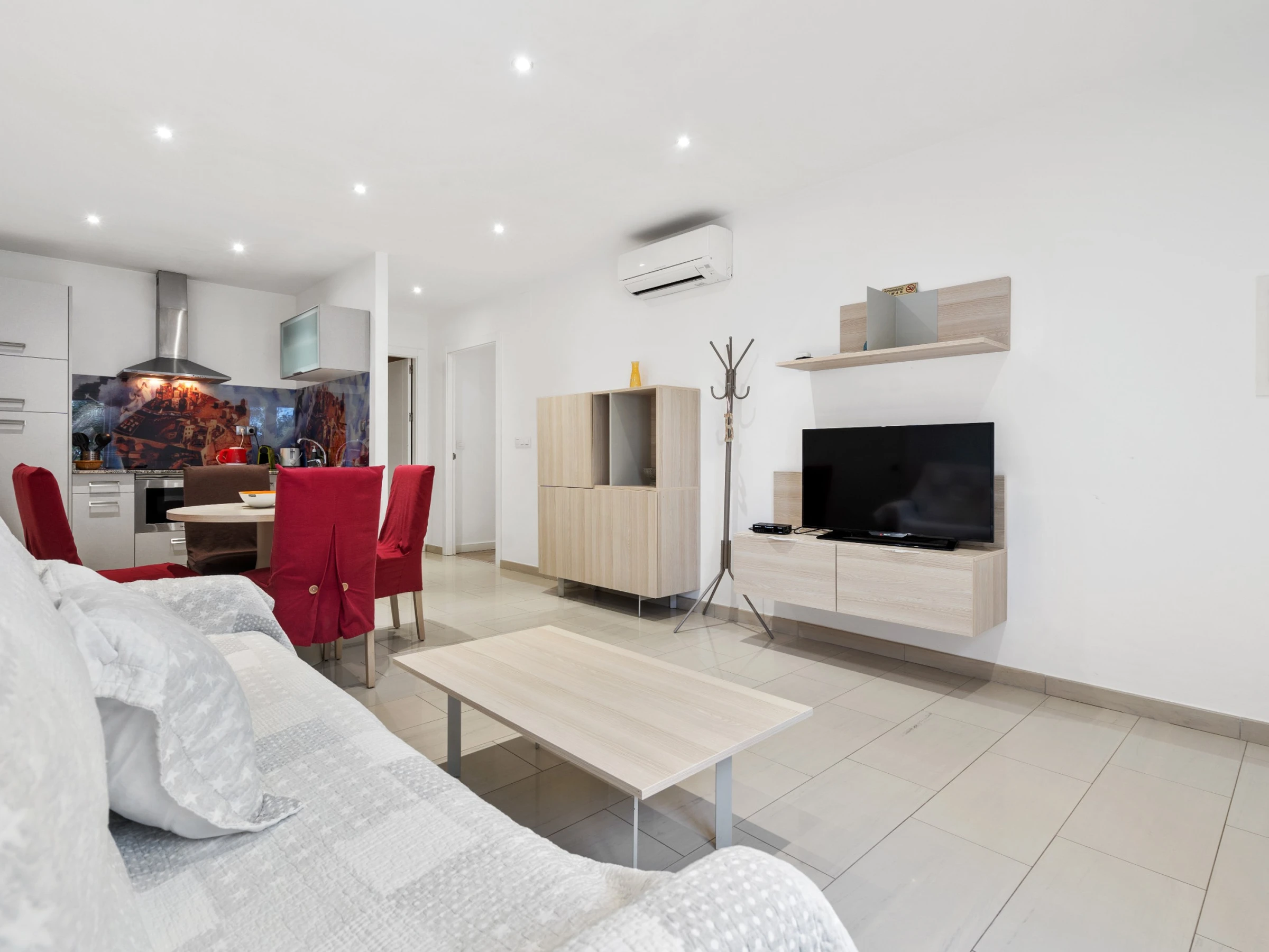 Nuestro bonito apartamento a un paso de la playa con capacidad para cuatro huéspedes, cuenta con una amplia habitación de matrimonio con amplia cama 180 cm por 190 cm con colchón de última generación y en el salón un cómodo sofá cama de 160 cm adaptado para largas estancias. El salón es ideal para relajarse, mirar la Smart TV, la cual dispone de canales con todos los idiomas, o pasar un rato en familia. Cuenta con cocina americana hecha con materiales de alta calidad y equipada con todo lo necesario para la preparación de cualquier plato que podrá disfrutar en el salón o en la terraza privada con la que cuenta el apartamento a un paso de la playa ya que es planta baja. Además, la cocina cuenta con diversos electrodomésticos como cafetera, hervidor, tostadora, microondas, nevera, horno, vitrocerámica y lavavajillas. El apartamento cuenta con un gran cuarto de baño adaptado para personas discapacitadas, garantizando comodidad y accesibilidad para todos los huéspedes. Un acogedor apartamento con ubicación excelente y apto para personas con movilidad reducida.