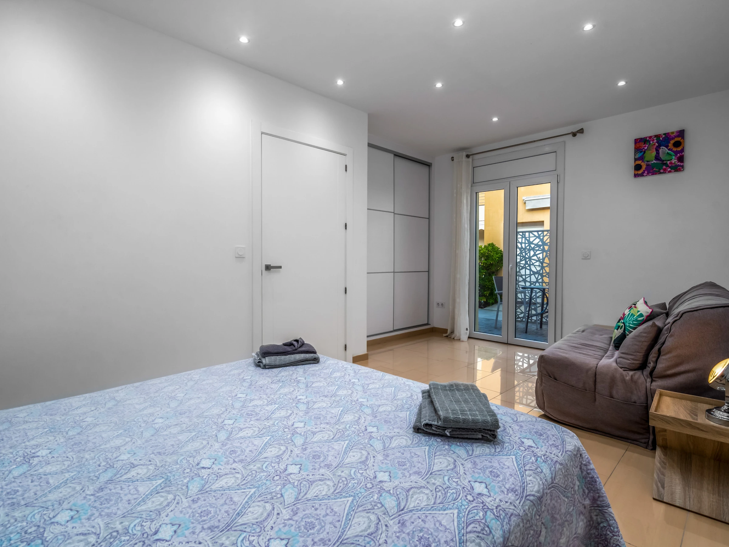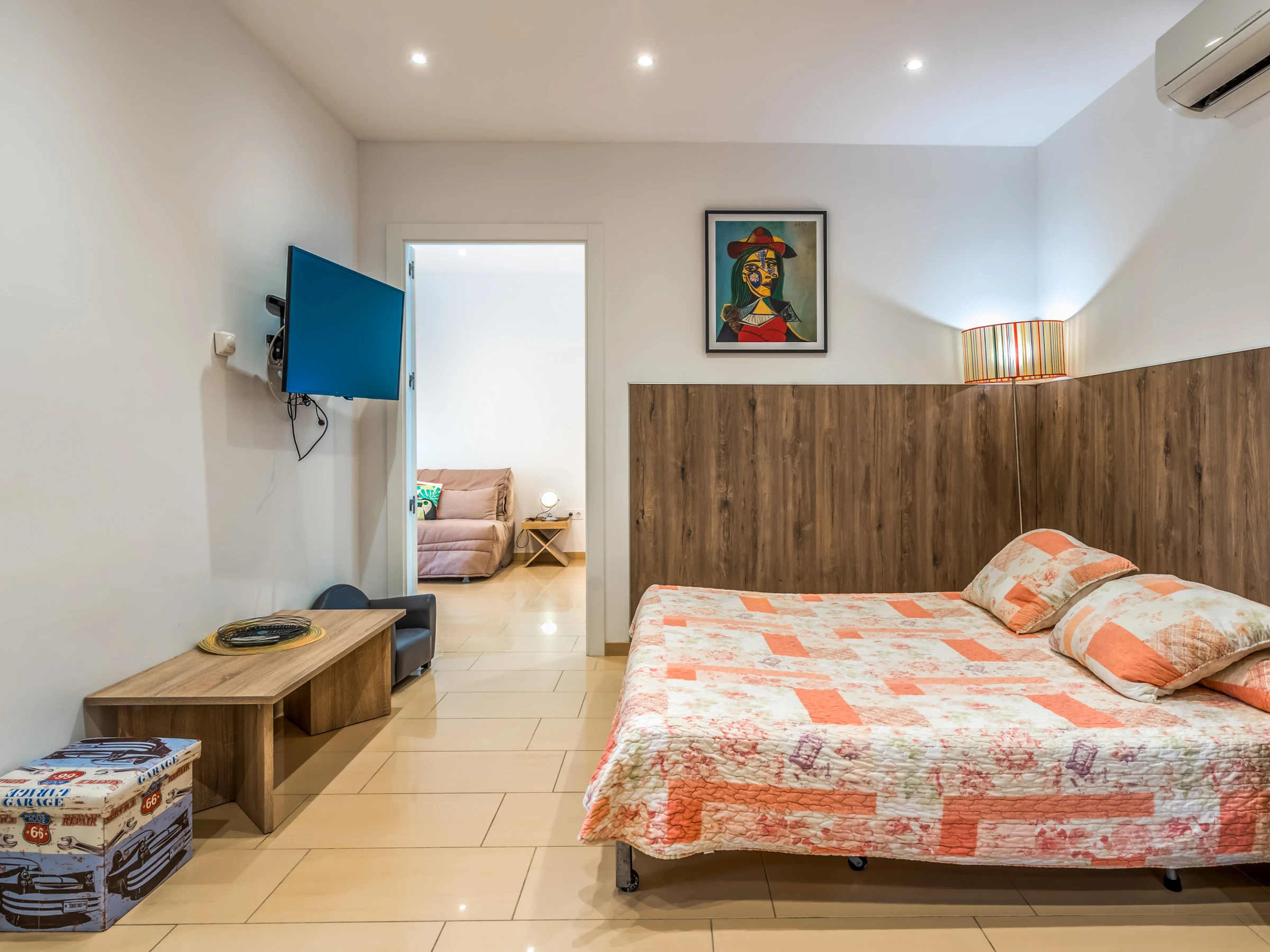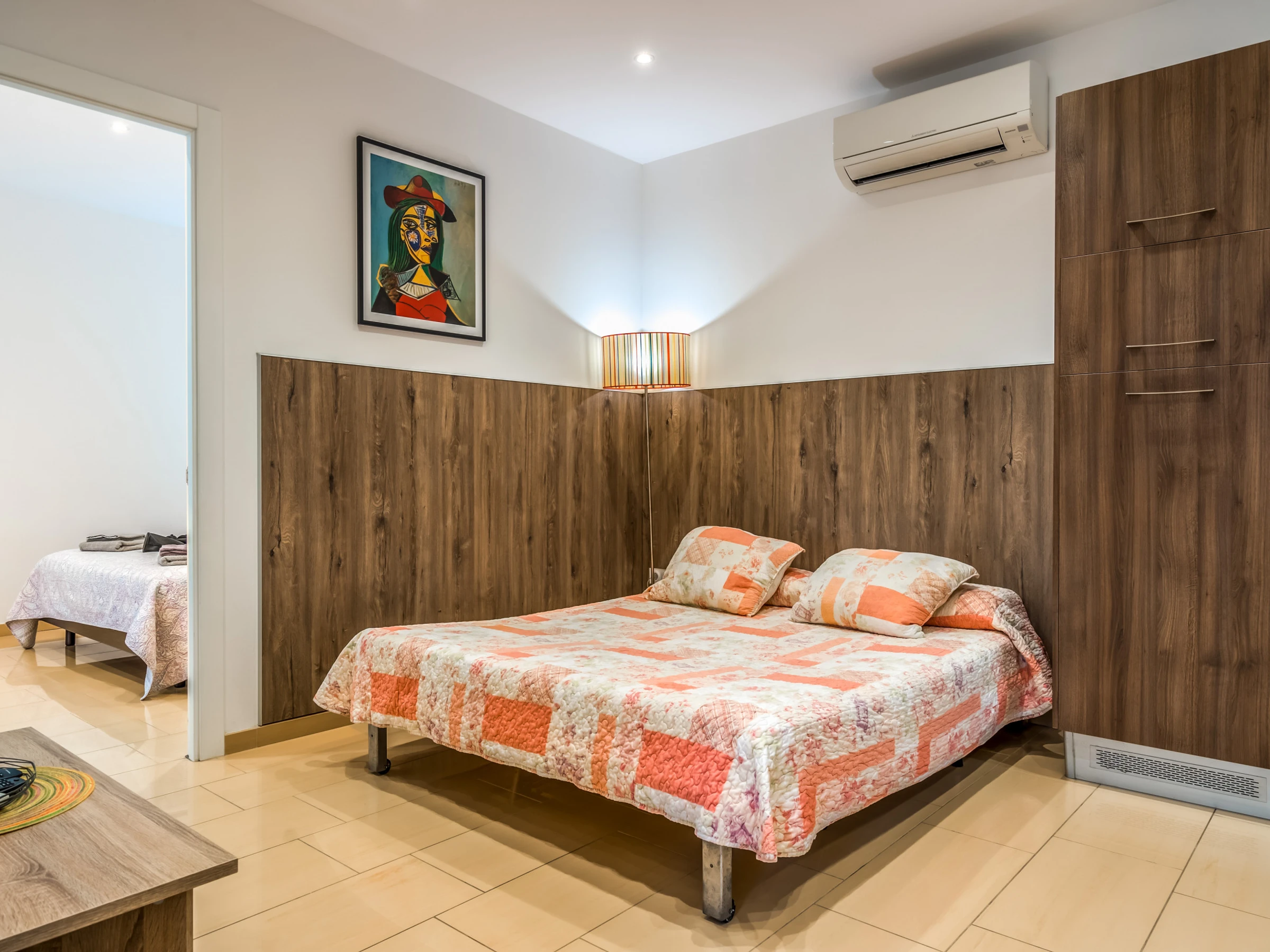 Este amplio apartamento es ideal para cuatro personas con posibilidad de alojar a 5. Ofrece una habitación de matrimonio con una cama de 160 cm x 190 cm con colchón ortopédico para un descanso perfecto . El salón incluye también un cómodo sofá cama de 160 cm, ideal para largas estadías. La sala de estar incluye una Smart TV la cual dispone de canales con todos los idiomas. La moderna cocina americana es muy amplia, completamente equipada e ideal para preparar las mejores delicias. Cuenta con diversos electrodomésticos como cafetera, hervidor, tostadora, microondas, nevera, horno, vitrocerámica y lavavajillas. El amplio y adaptado cuarto de baño está pensado para facilitar el acceso a personas con movilidad reducida, al igual que el resto del apartamento. Además, podrás disfrutar de una encantadora terraza con mesas y sillas a pie de playa con tus seres queridos.