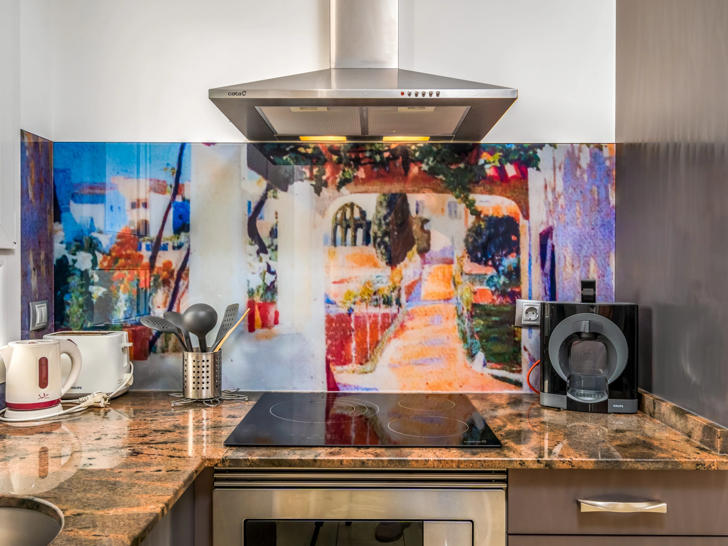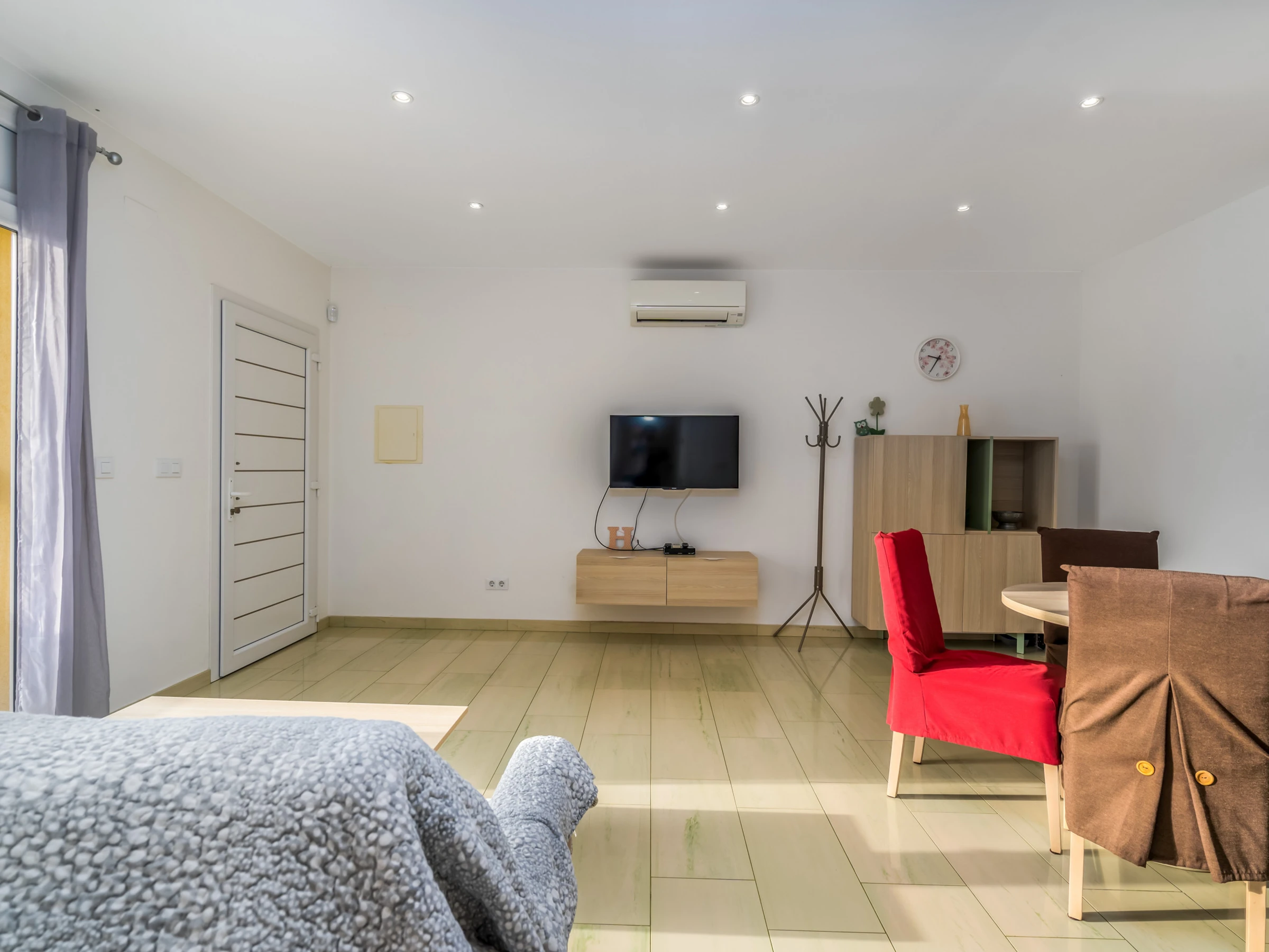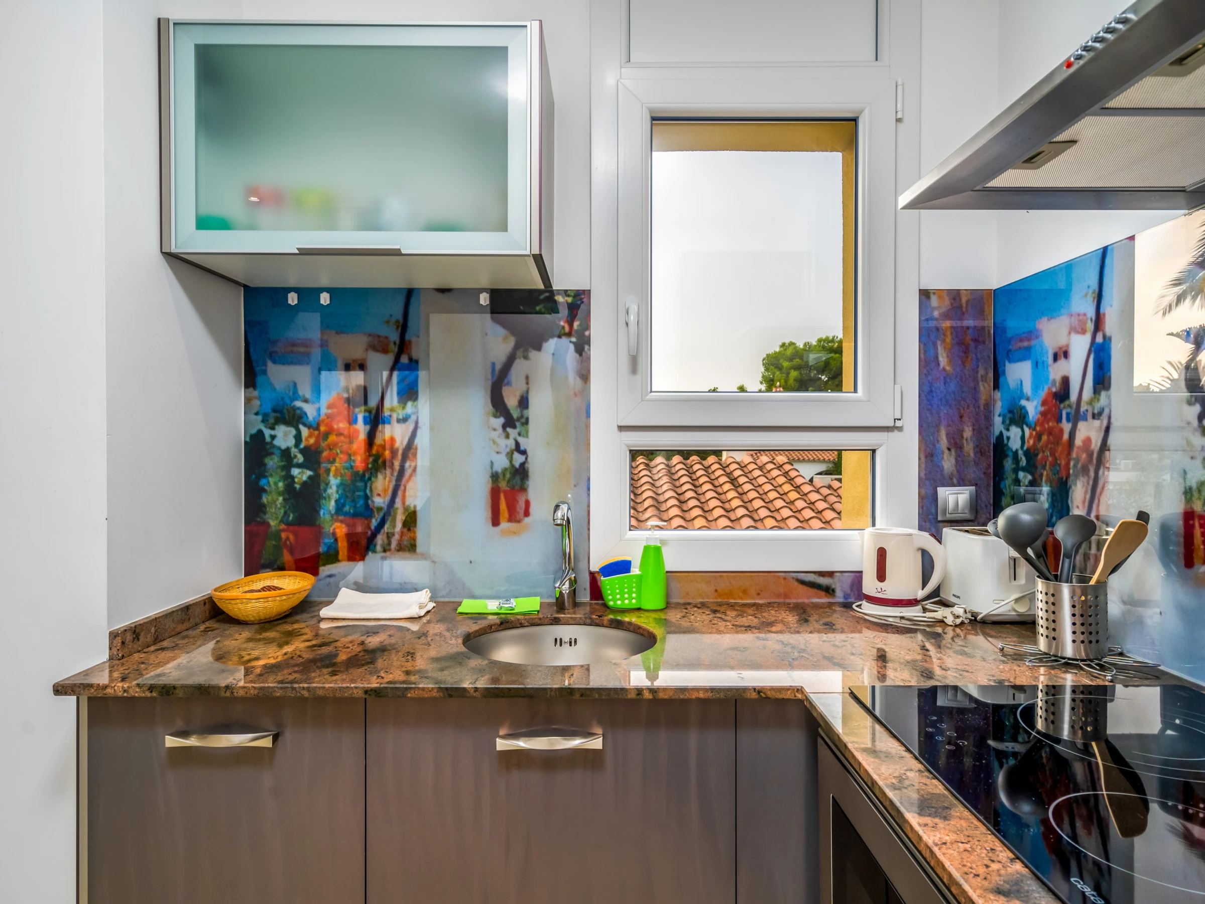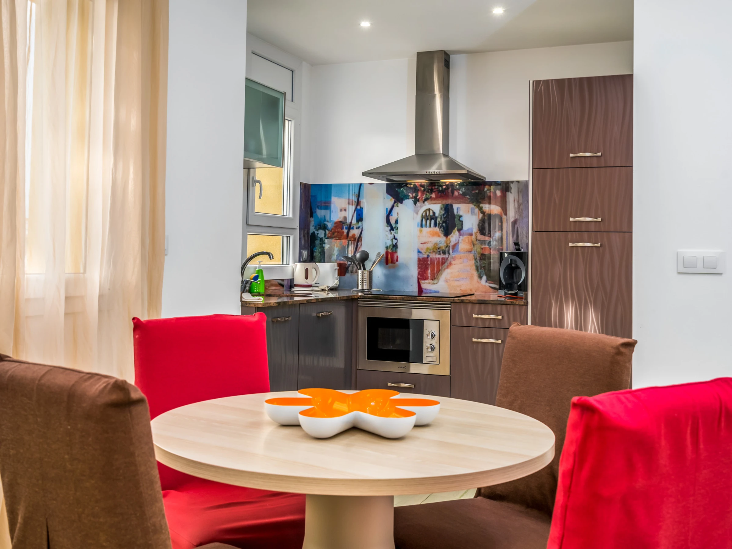 Nuestro espacioso apartamento con capacidad para cuatro personas, cuenta con una amplia habitación de matrimonio con cama de 160 cm y 190 cm con colchón de última generación y en el salón un cómodo sofá cama de 160 cm adaptado para largas estancias. El salón es ideal para descansar, mirar la TV, la cual es una Smart TV con canales con todos los idiomas, o pasar un buen rato en familia. Cuenta con cocina americana hecha con materiales de primera calidad y perfectamente equipada para la preparación de cualquier plato que podrás disfrutar en el salón o en la terraza privada con vistas al mar. La cocina cuenta con diversos electrodomésticos como cafetera, hervidor, tostadora, microondas, nevera, horno, vitrocerámica y lavavajillas . El cuarto de baño es grande y adaptado para personas discapacitadas, garantizando comodidad y accesibilidad para todos los huéspedes. Para facilitar aún más el acceso, cuenta con ascensor ya que se encuentra en un primer piso.