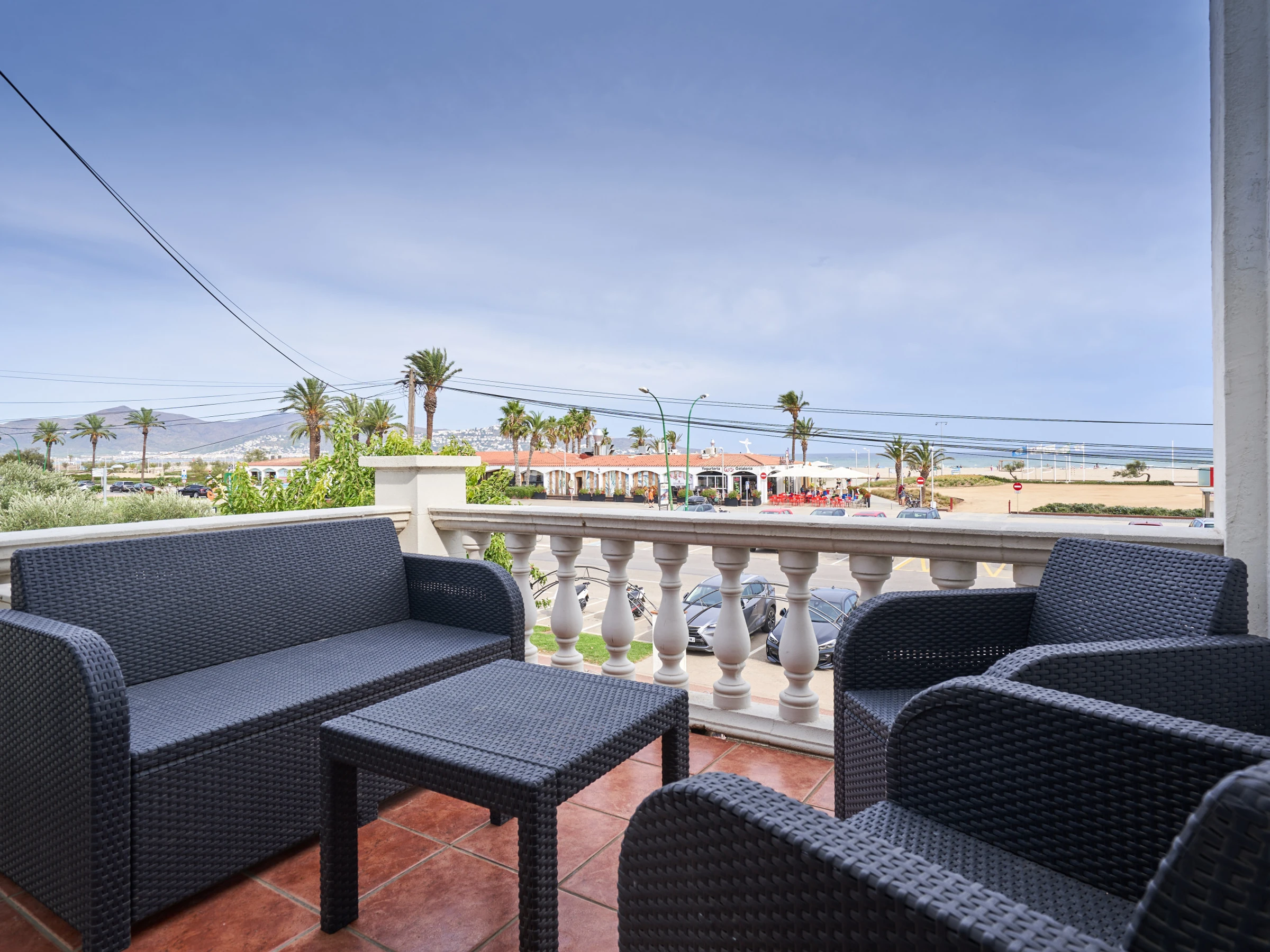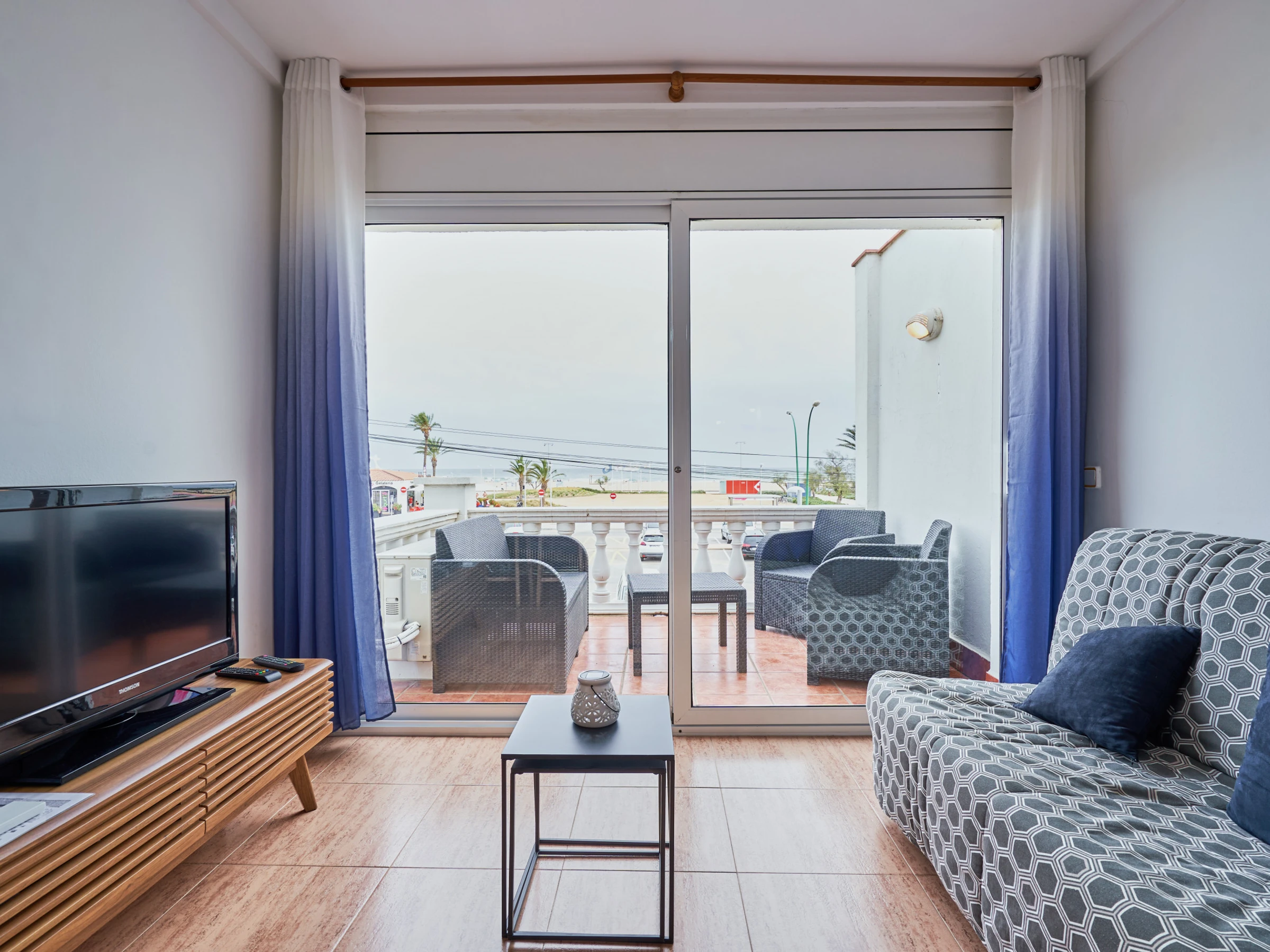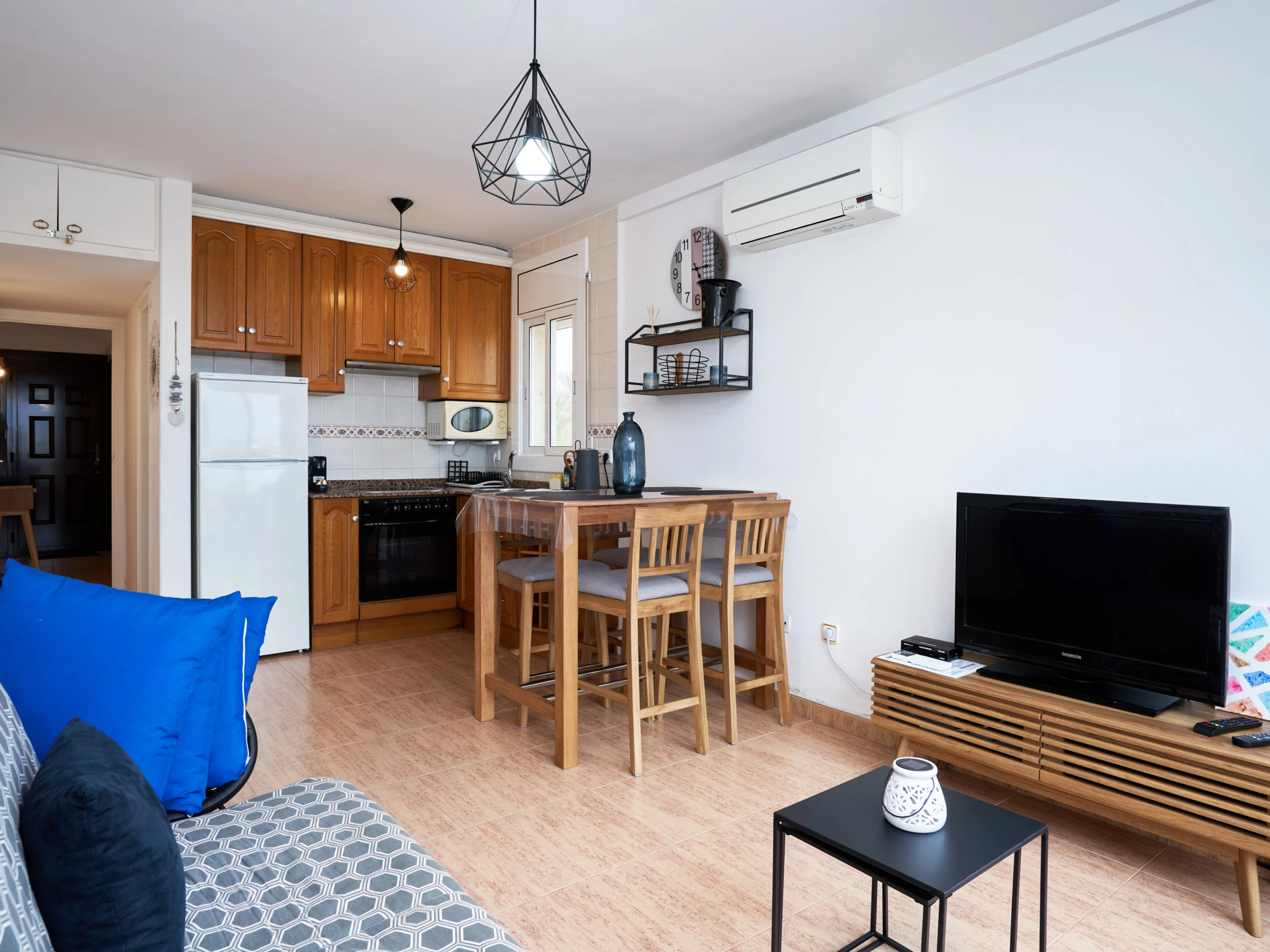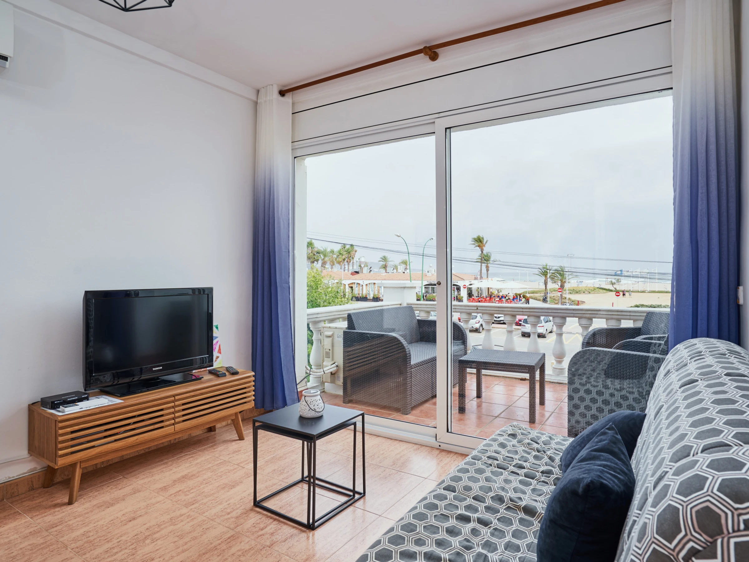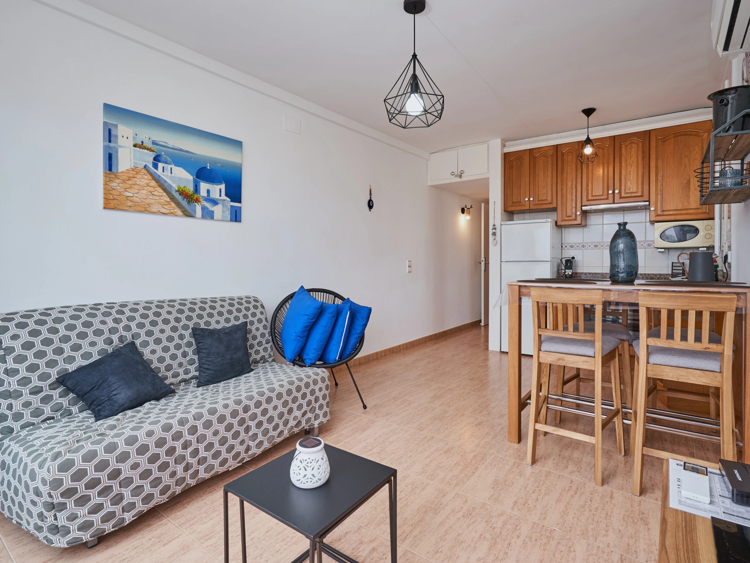 El salón amplio y luminoso cuenta con un cómodo sofá cama, Smart TV y aire acondicionado. Desde el salón, se accede a la terraza privada con vistas al mar, ideal para relajarse y disfrutar del clima mediterráneo.