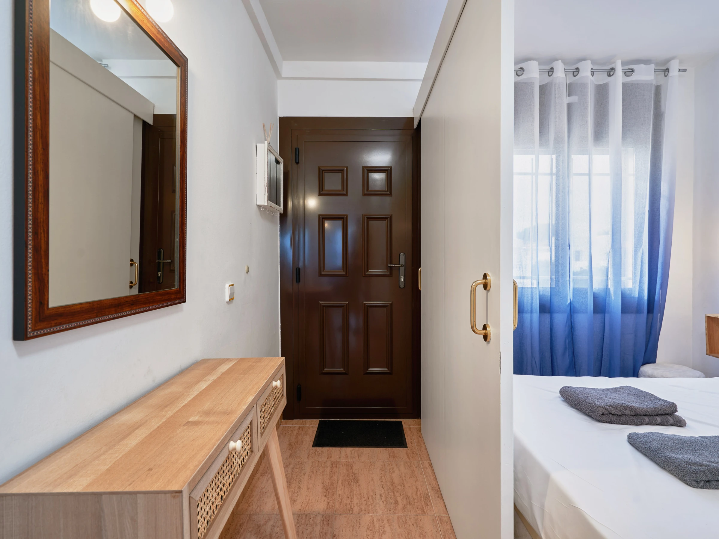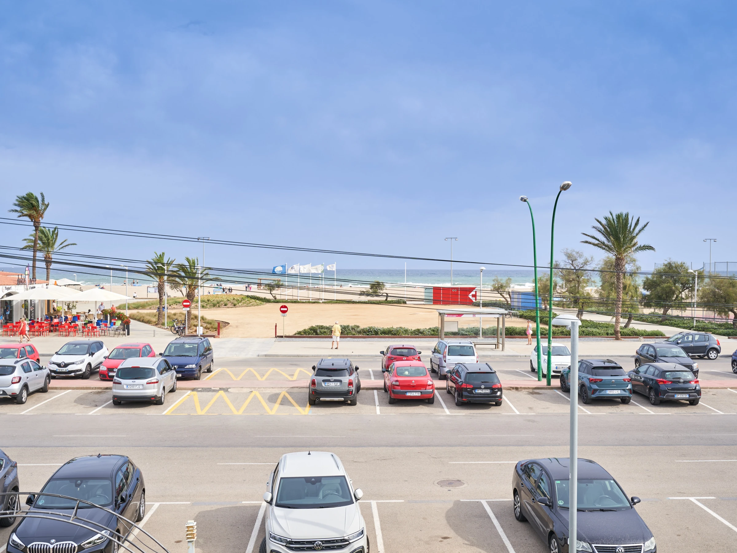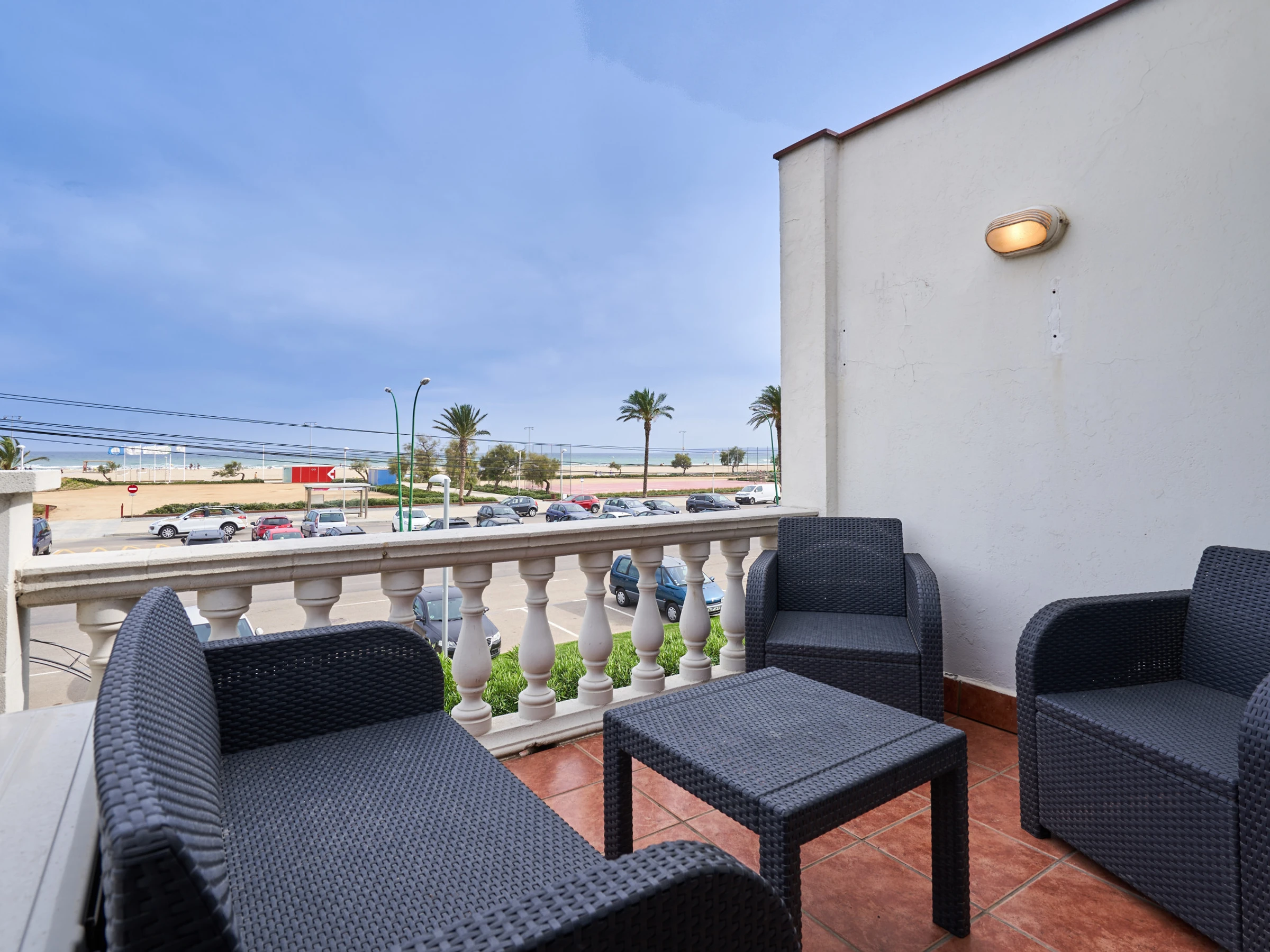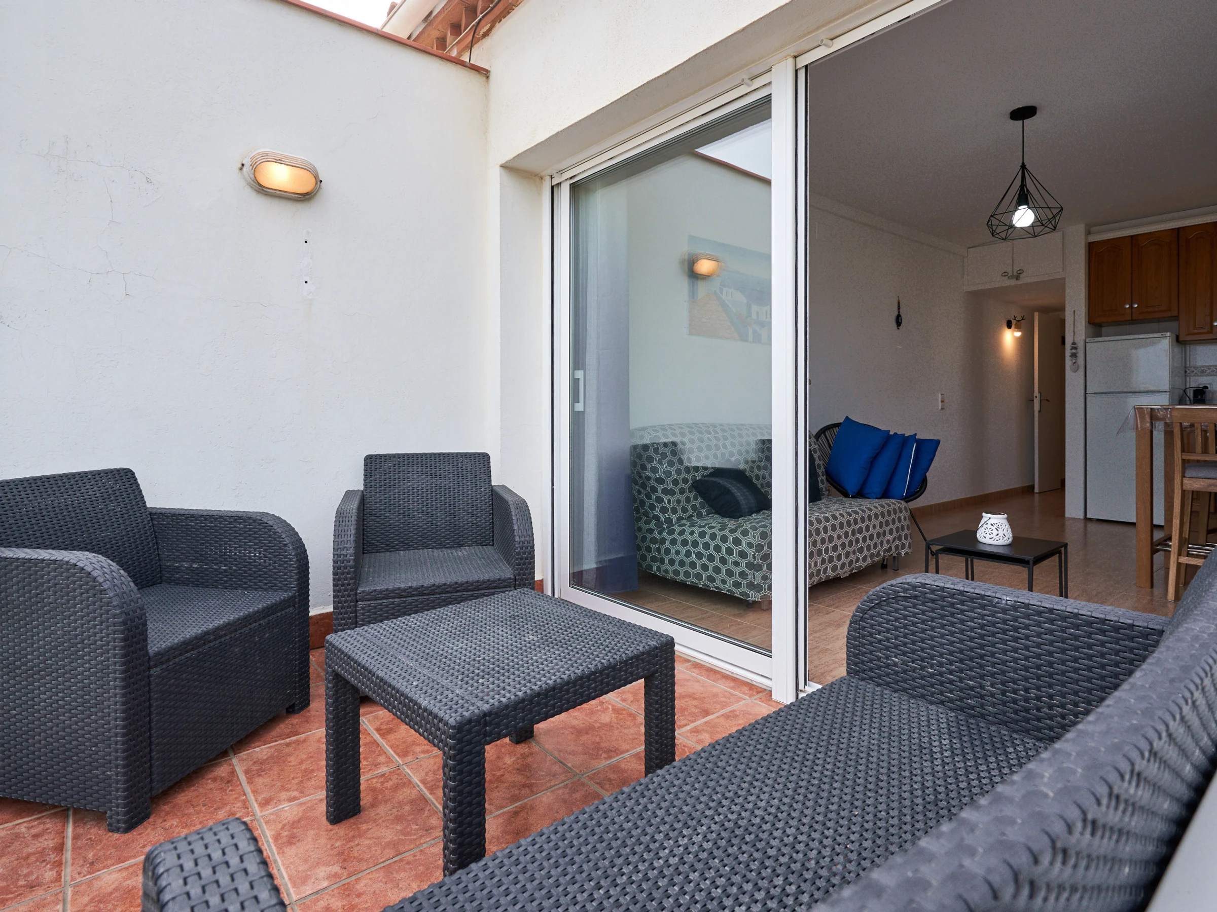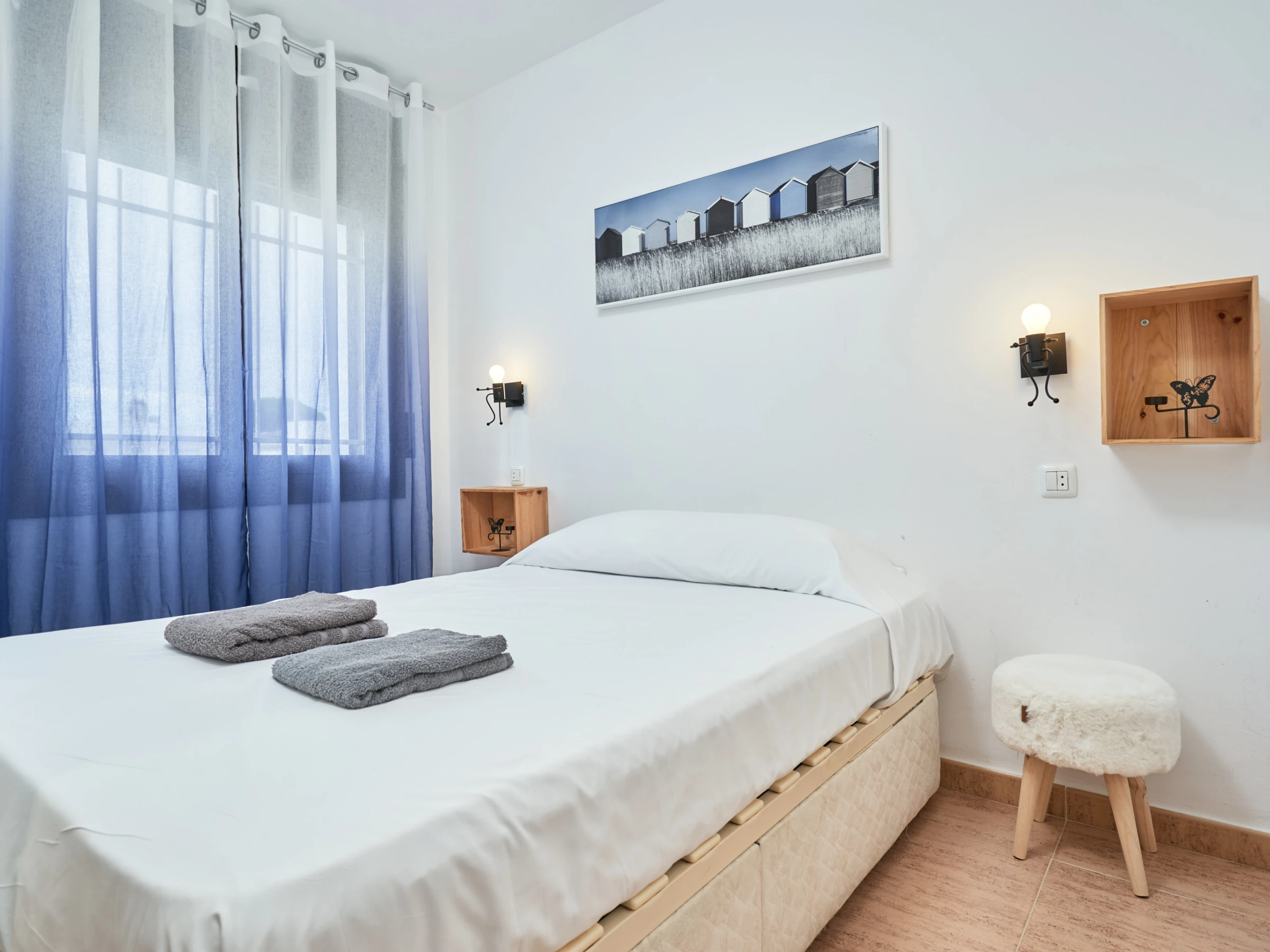 El salón amplio y luminoso cuenta con un cómodo sofá cama, Smart TV y aire acondicionado. Desde el salón, se accede a la terraza privada con vistas al mar, ideal para relajarse y disfrutar del clima mediterráneo.