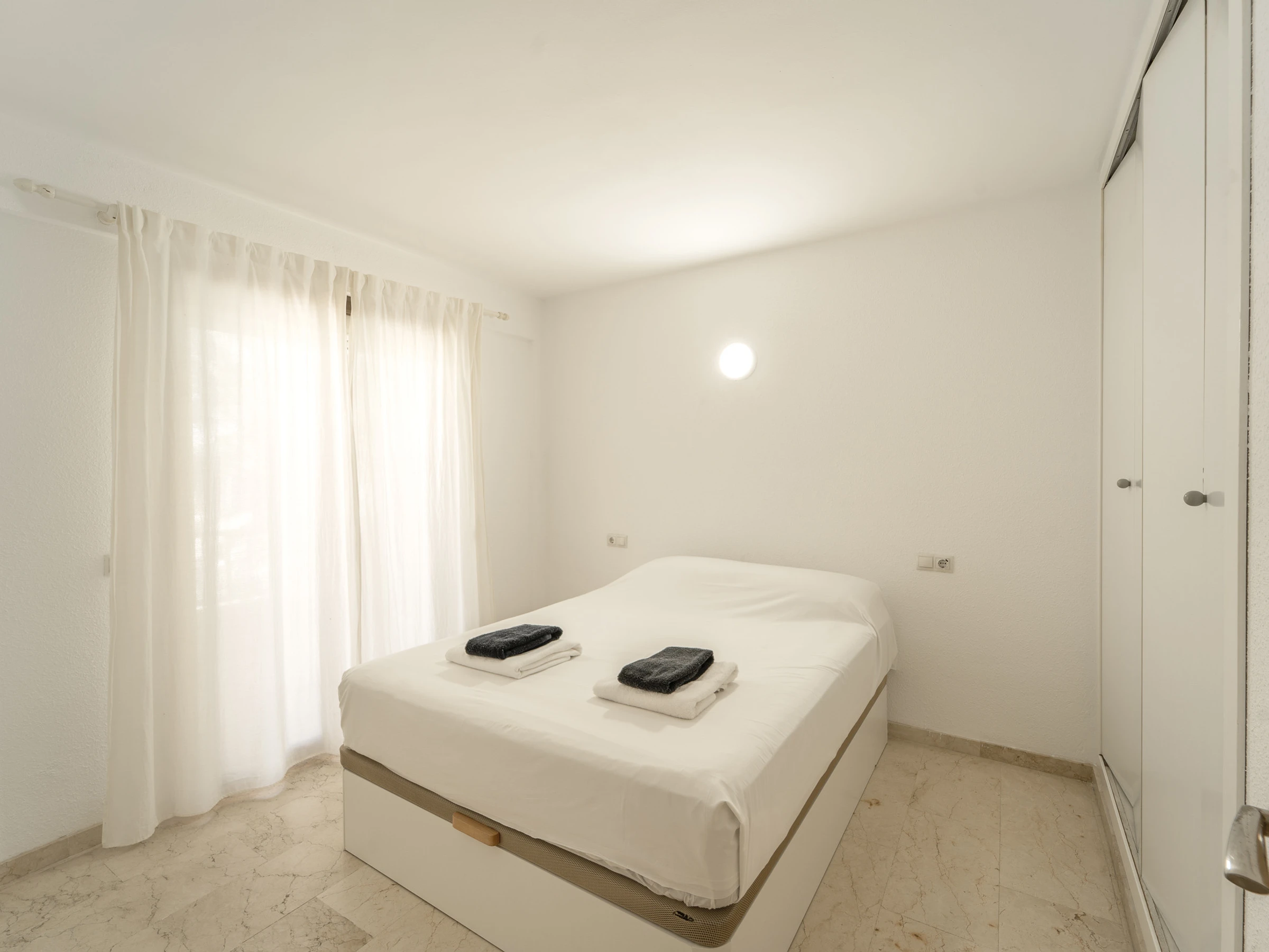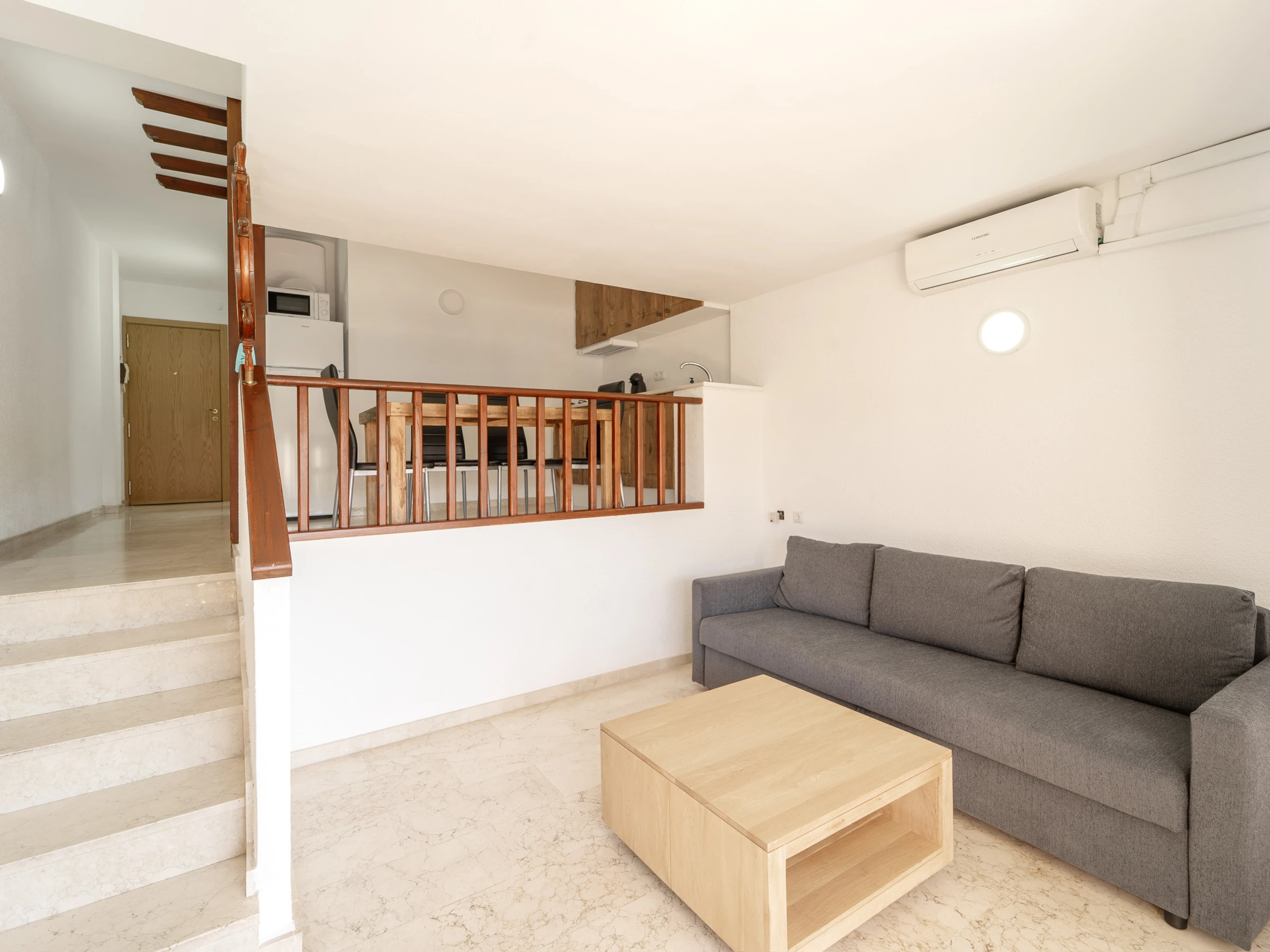 La luminosa zona de estar incluye un sofá cama, Smart TV y acceso a una terraza amueblada con vistas, ideal para disfrutar de un café relajante. El dormitorio dispone de una cama doble. El apartamento está equipado con aire acondicionado y lavadora.