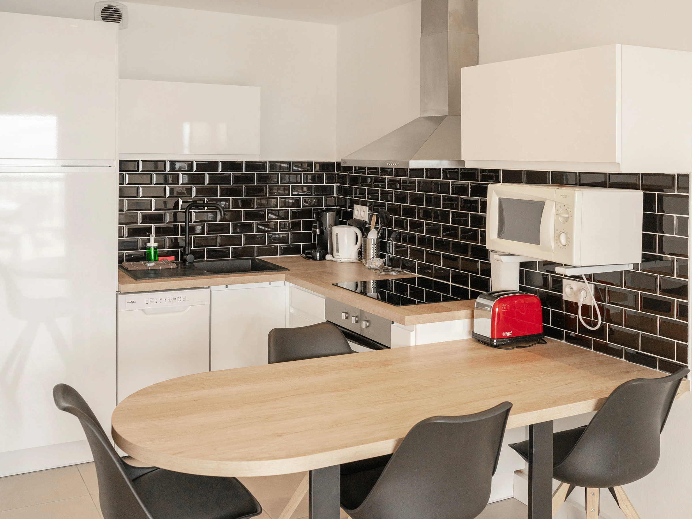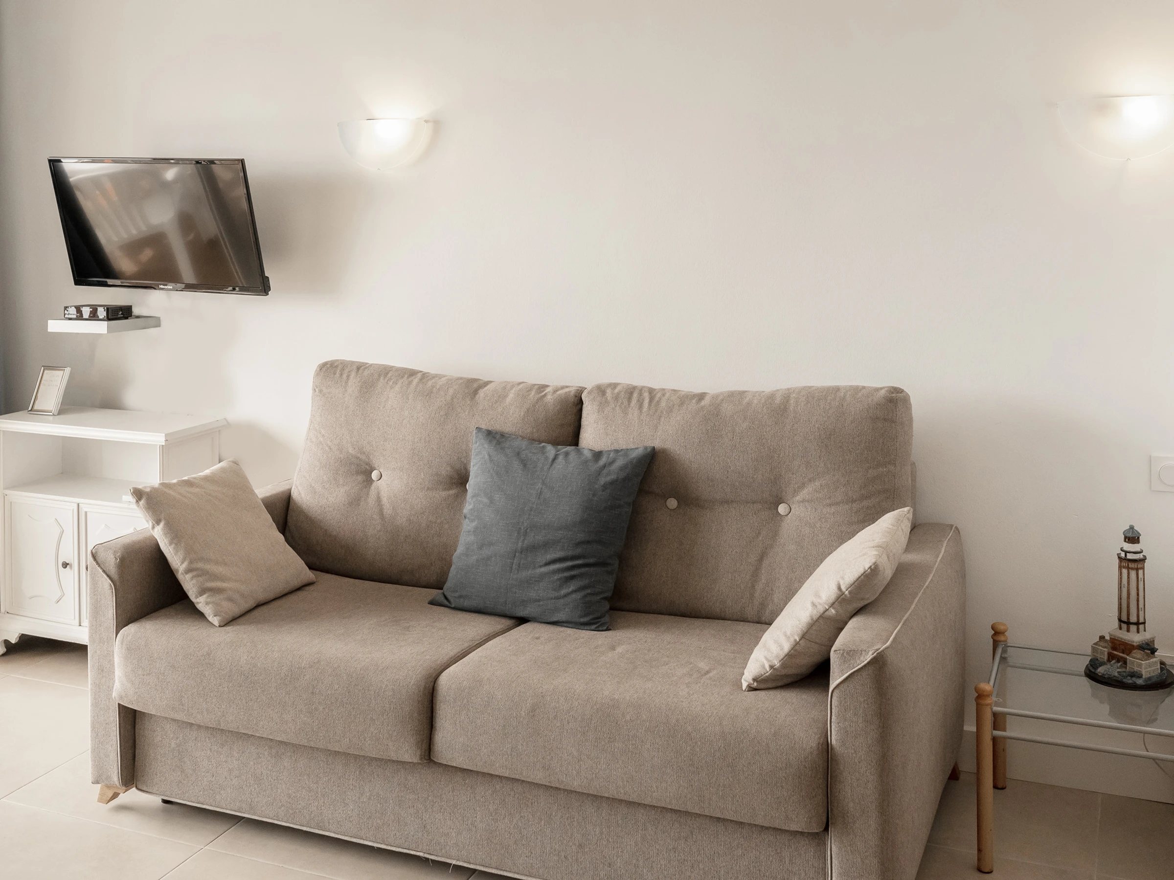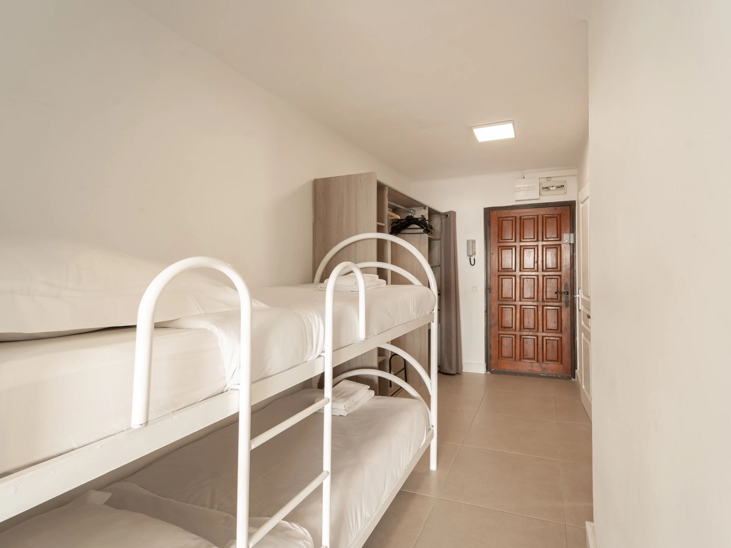Las grandes ventanas panorámicas llenan el espacio con luz natural, creando una atmósfera de ligereza y amplitud. En el estudio hay un cómodo sofá cama y una litera, lo que permite alojarse con comodidad. La zona de comedor es ideal para comidas compartidas, y la mini cocina, equipada con todo lo necesario, permite cocinar los platos favoritos directamente en el lugar.