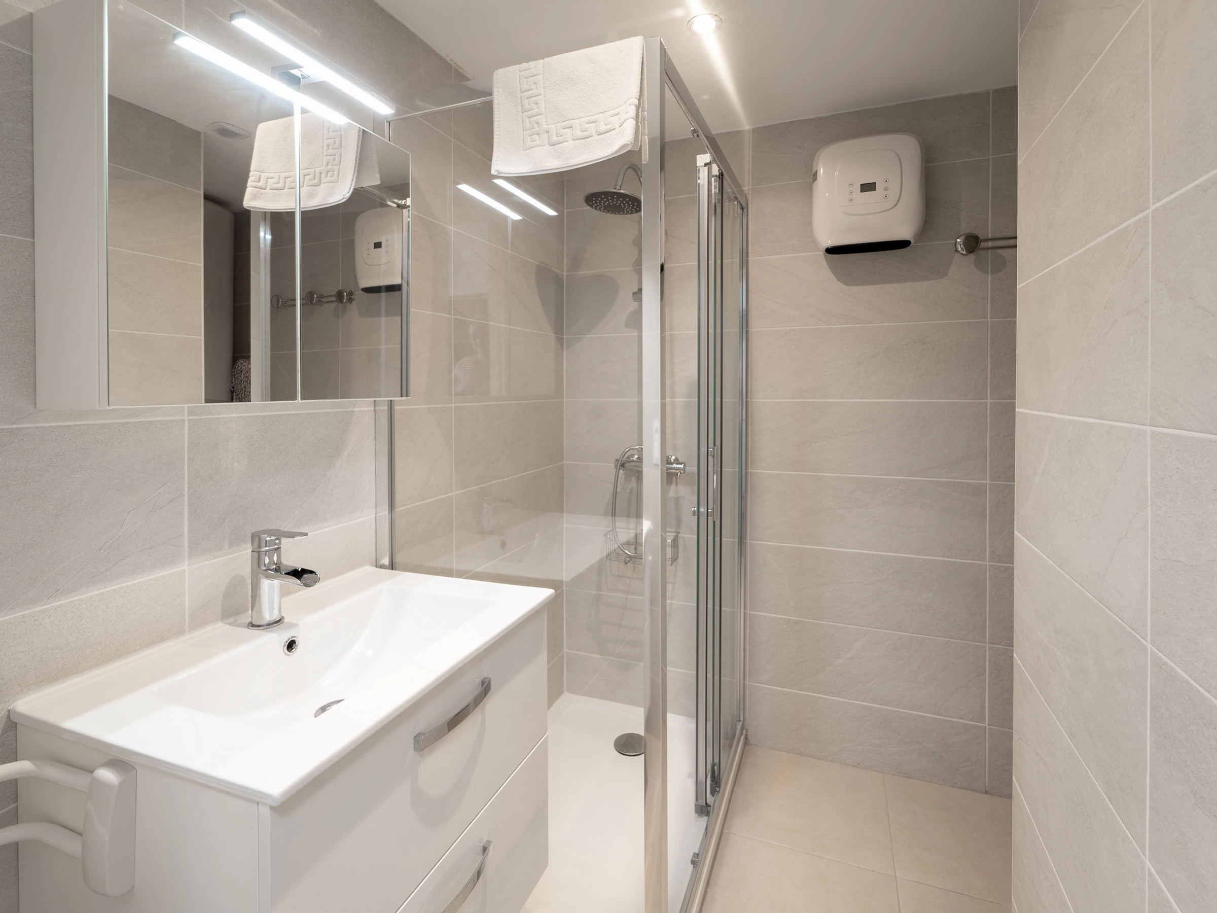 El baño está equipado con una ducha, proporcionando comodidad y confort. La terraza con vista al mar se convertirá en el lugar favorito para descansar y relajarse, donde se pueden disfrutar los atardeceres y los sonidos de las olas.