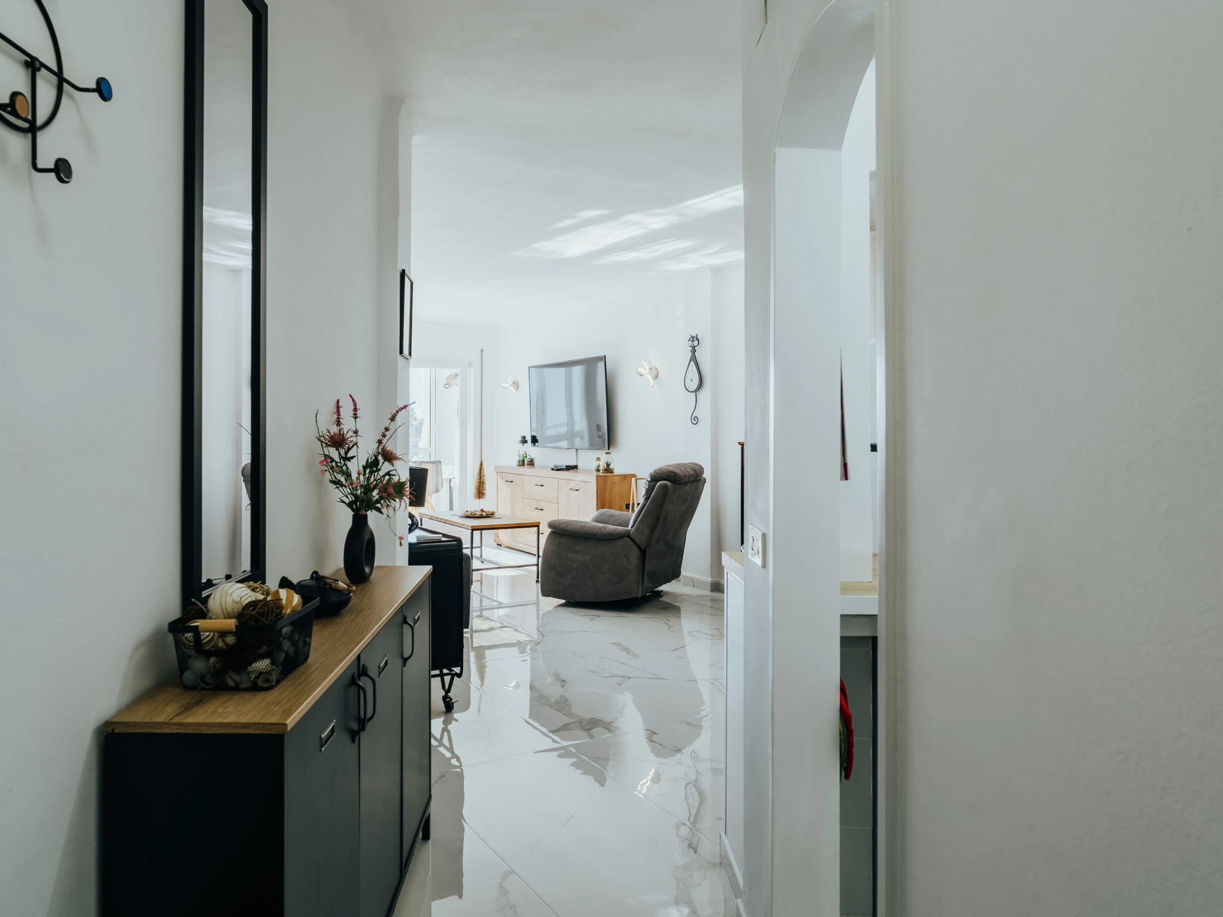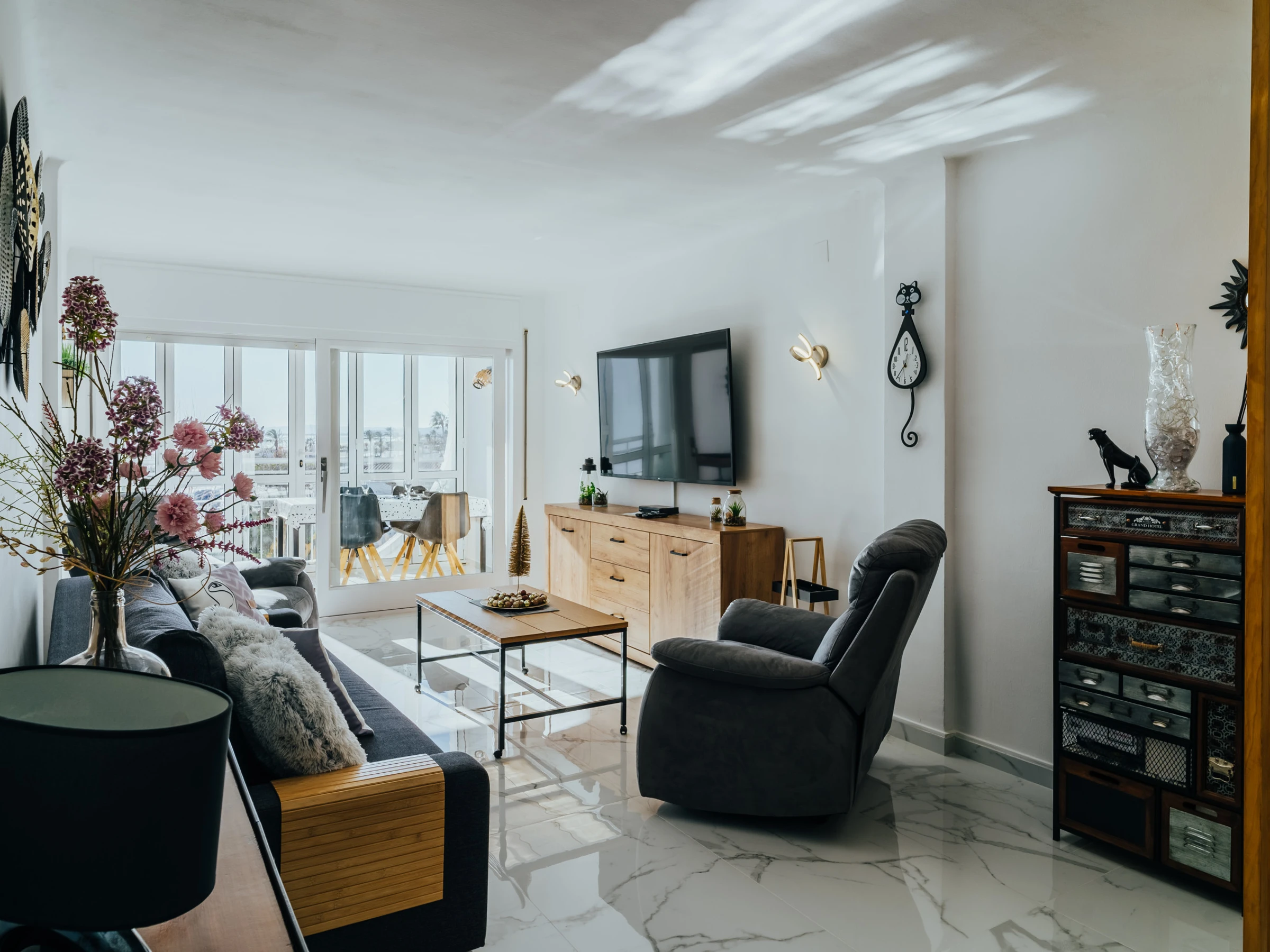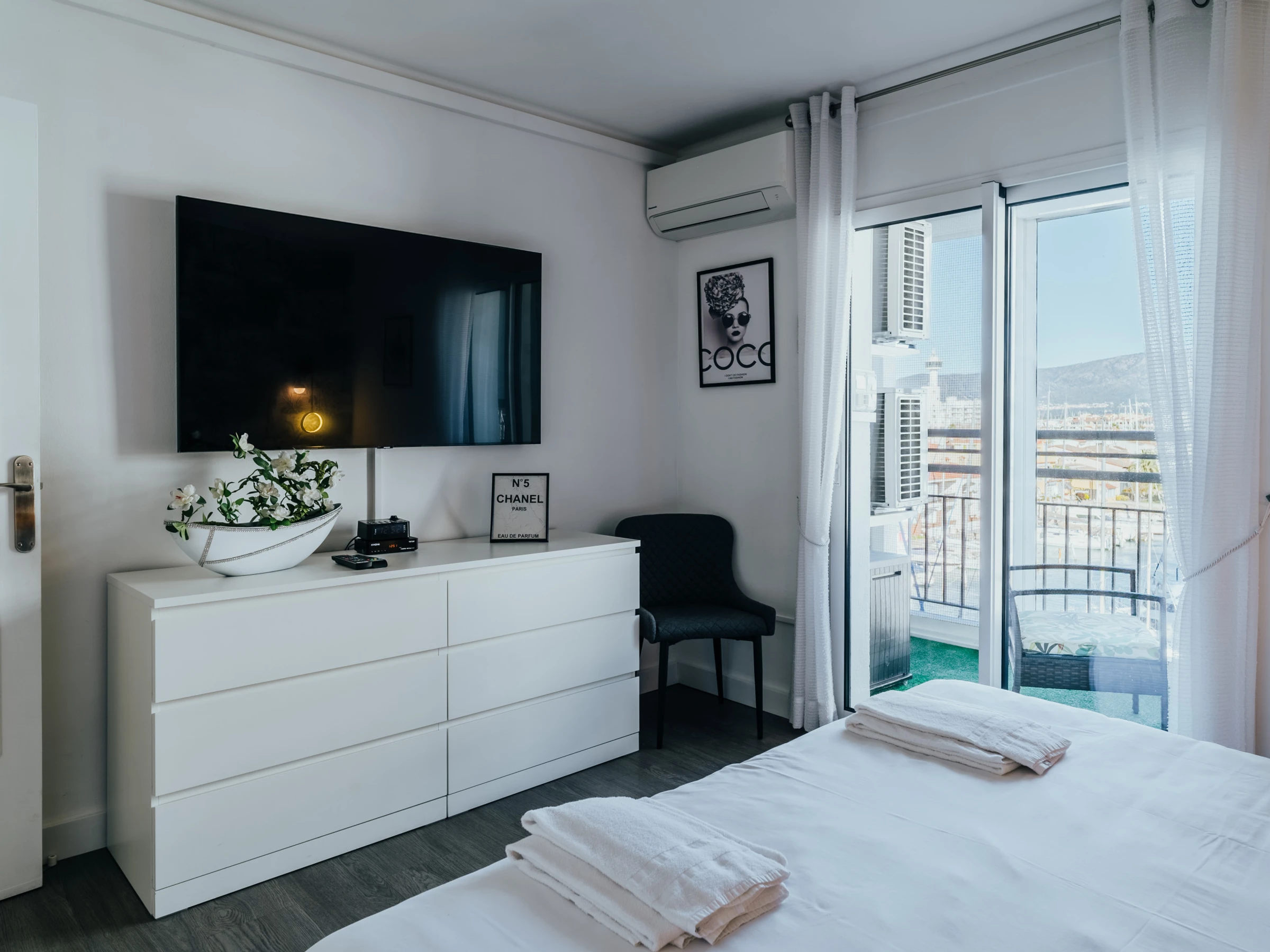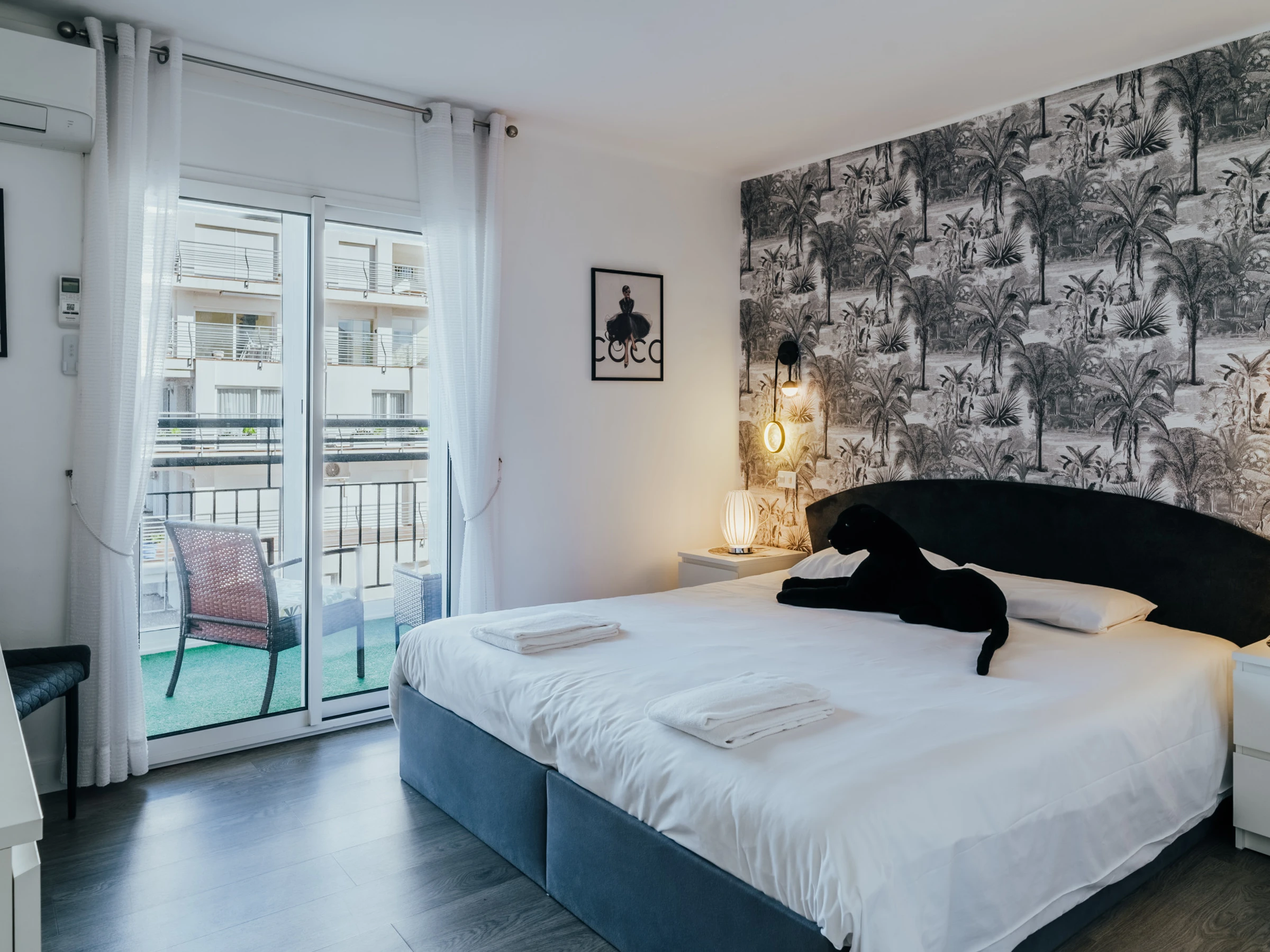 La zona de dormitorio incluye una cama doble, muebles elegantes, un televisor y aire acondicionado. Además, el apartamento cuenta con lavavajillas y lavadora, garantizando comodidad durante su estancia.