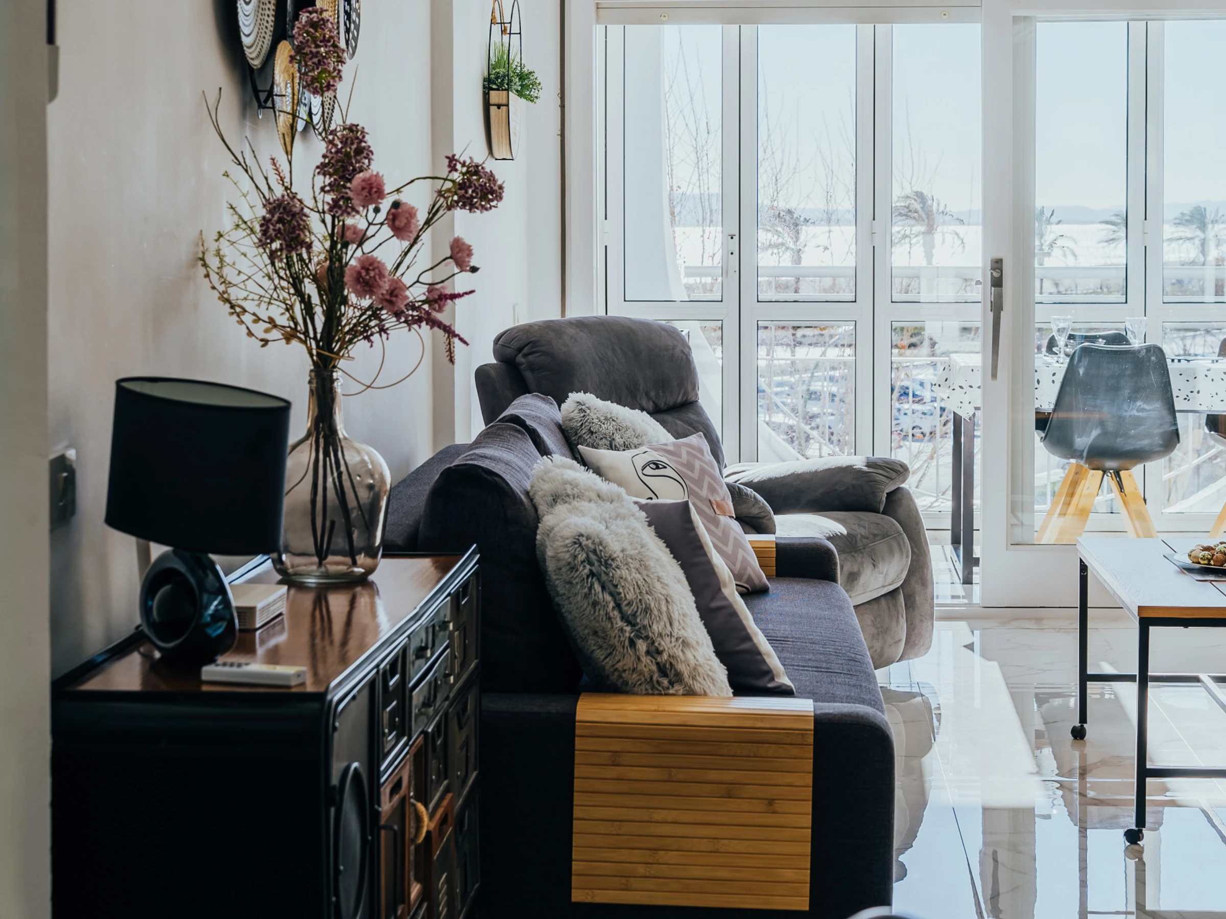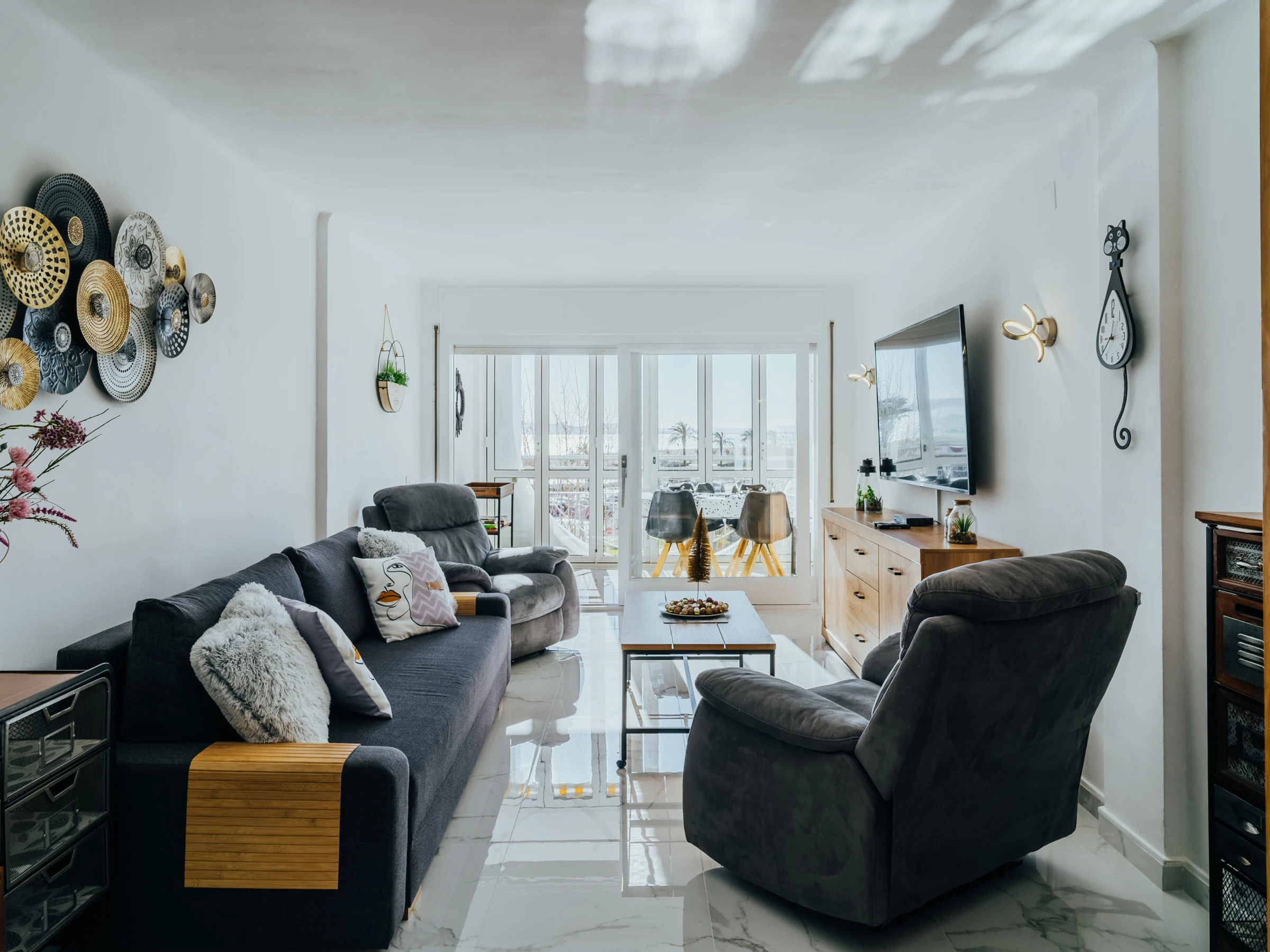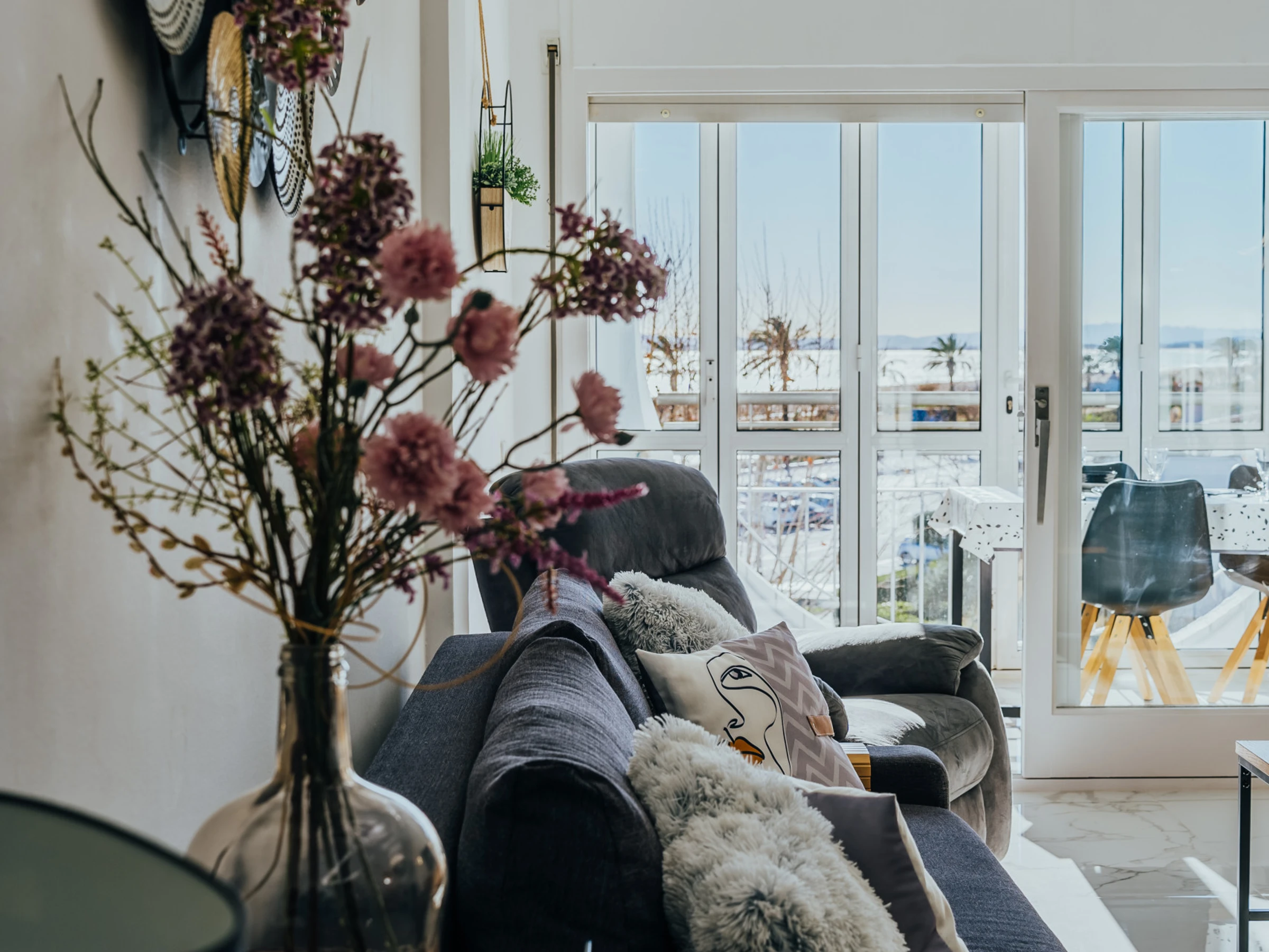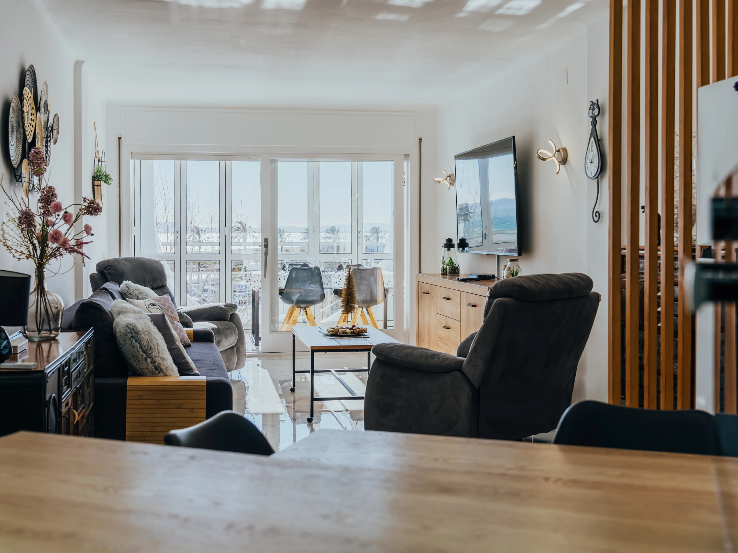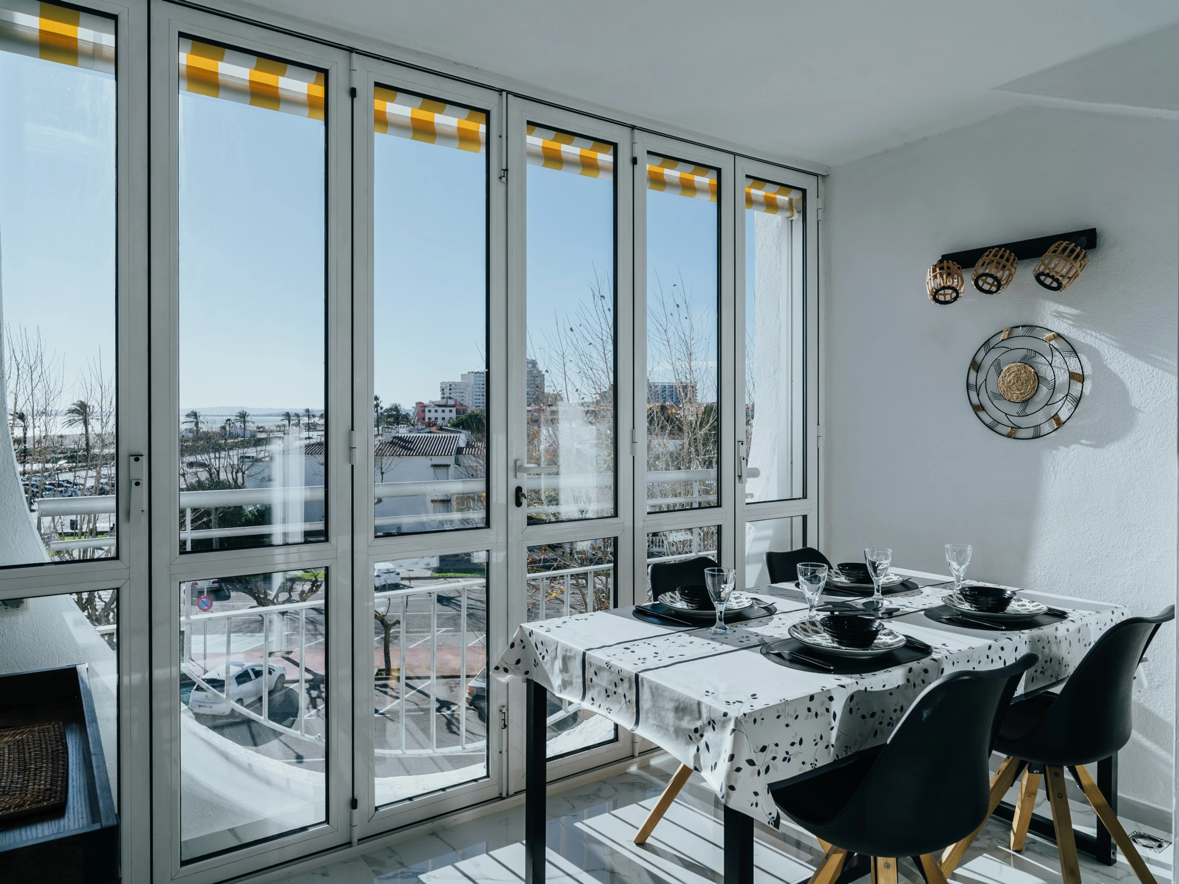 Disfrute de un amplio y luminoso salón con zona de comedor y un acogedor sofá. El salón está equipado con Smart TV y aire acondicionado, y desde aquí podrá acceder a una terraza amueblada con impresionantes vistas al mar y Empuriabrava, perfecta para disfrutar de una taza de café por la mañana.