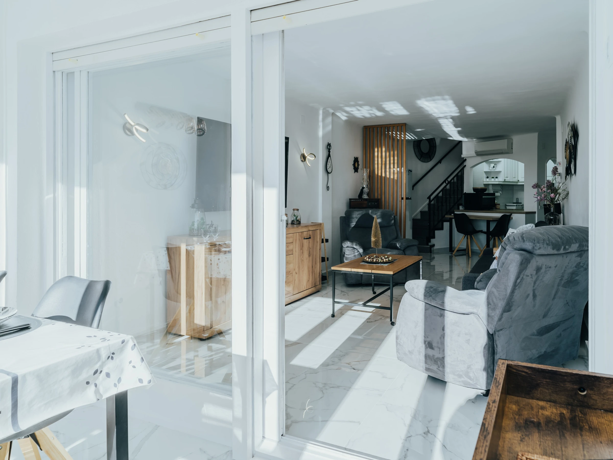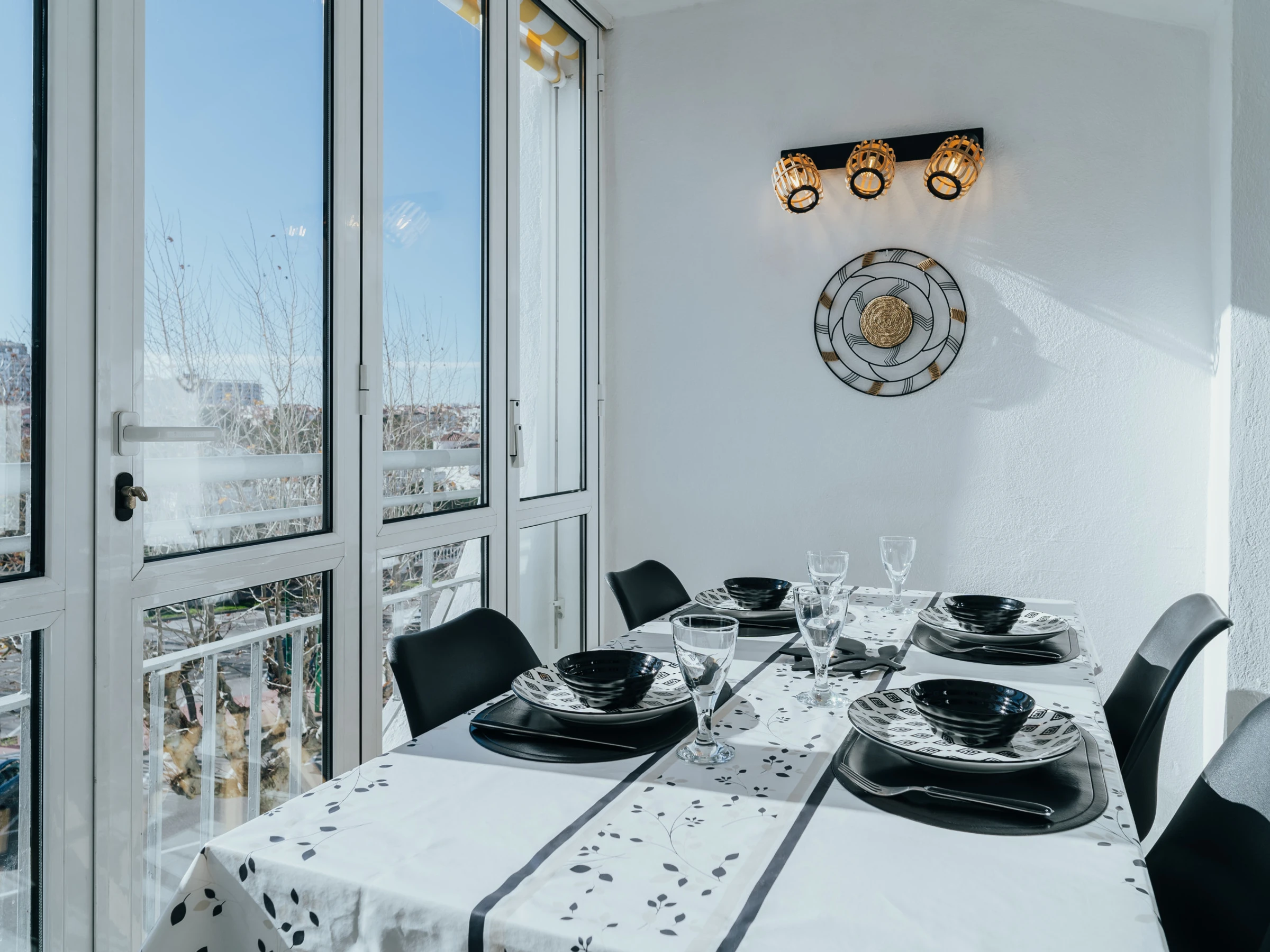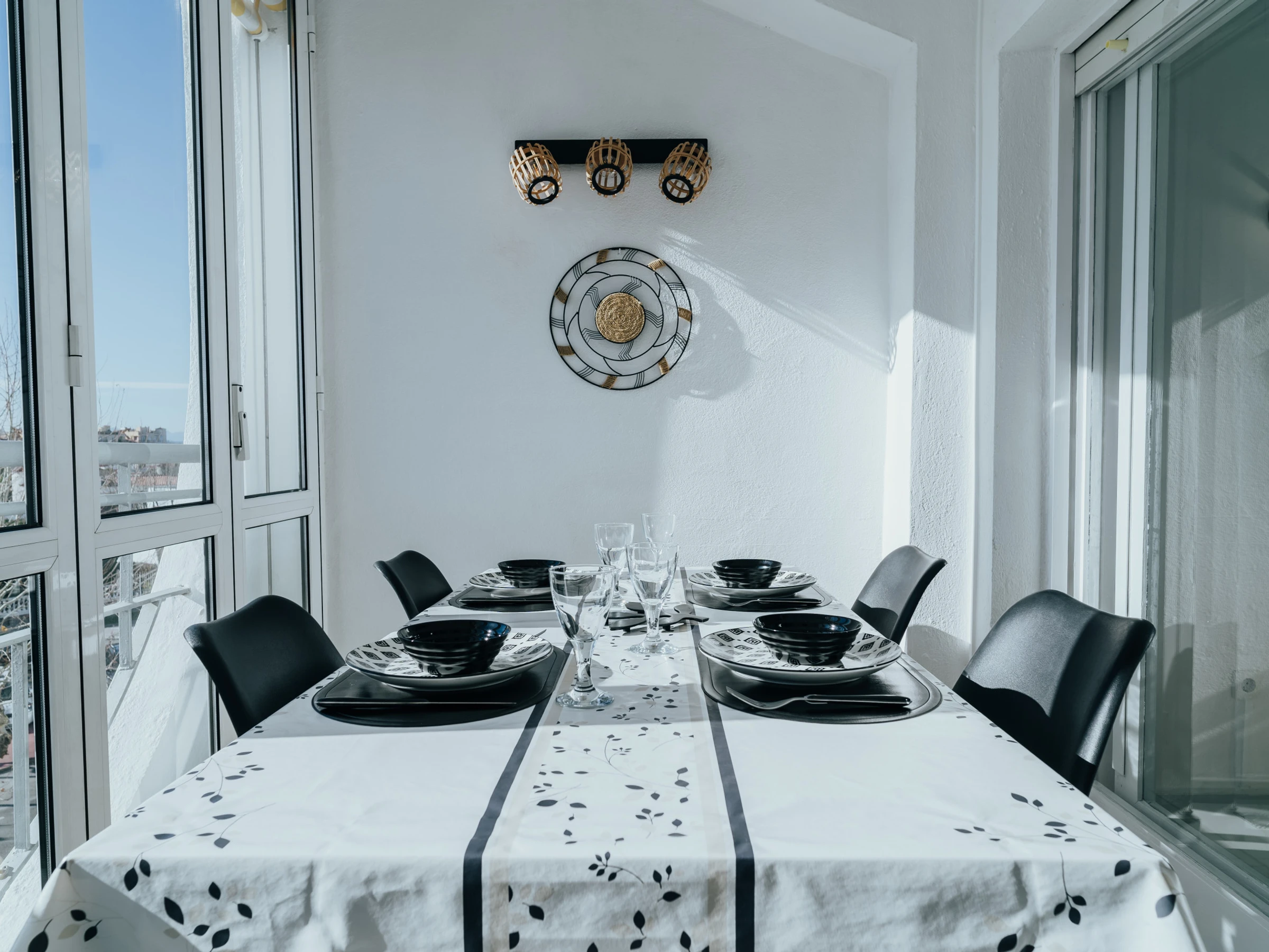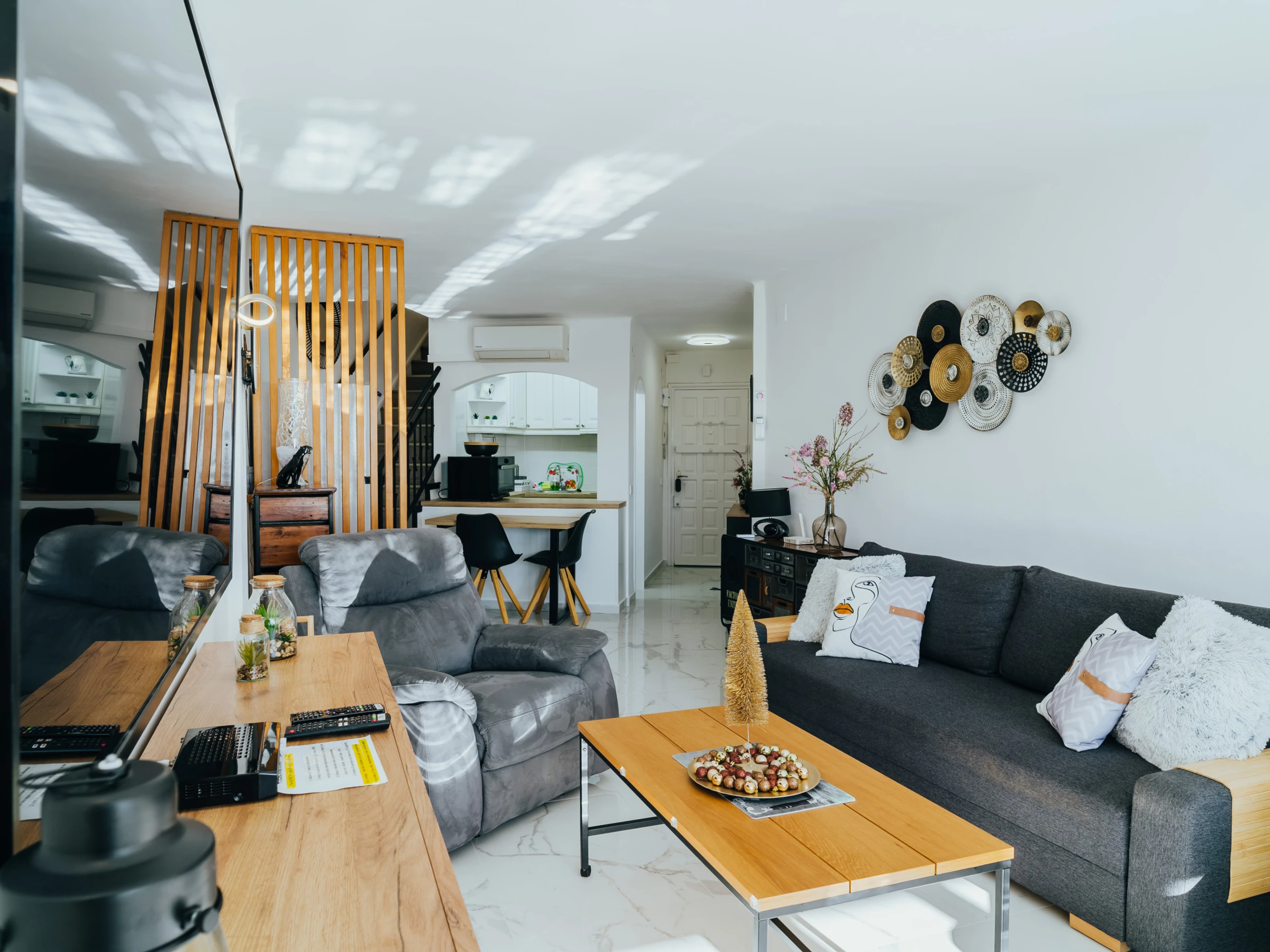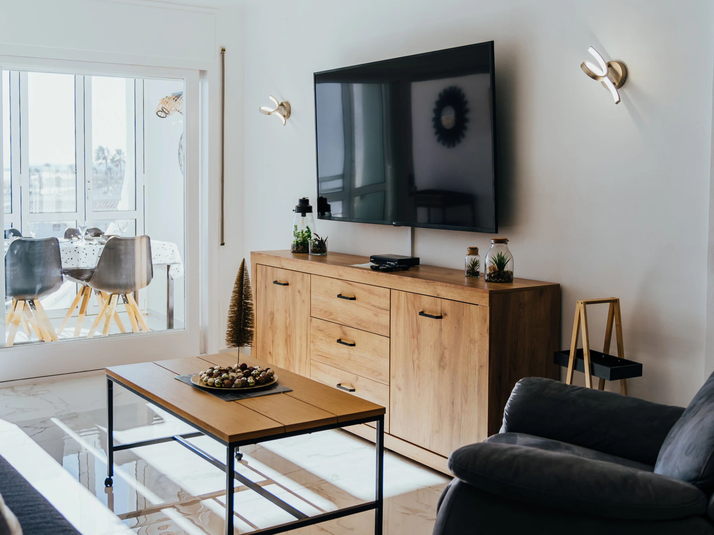 Disfrute de un amplio y luminoso salón con zona de comedor y un acogedor sofá. El salón está equipado con Smart TV y aire acondicionado, y desde aquí podrá acceder a una terraza amueblada con impresionantes vistas al mar y Empuriabrava, perfecta para disfrutar de una taza de café por la mañana.