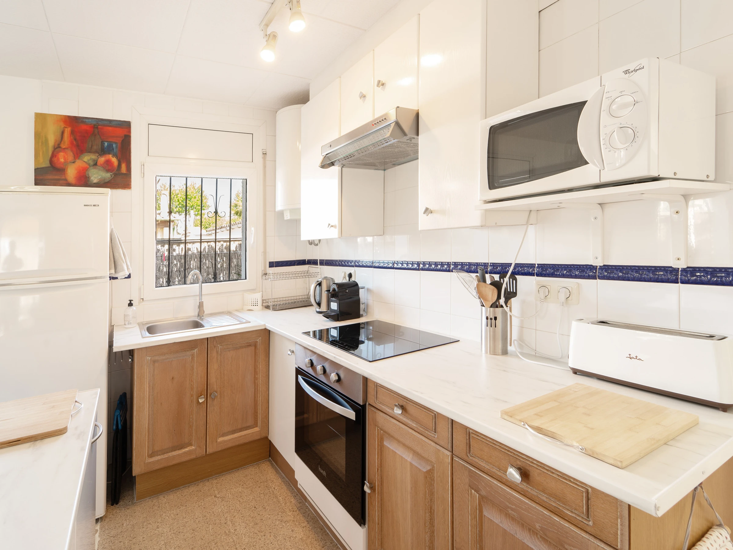 La casa cuenta con una zona de cocina equipada con todo lo necesario para preparar sus platos favoritos: nevera, cocina, hervidor de agua, cafetera, microondas, tostadora, etc. La acogedora zona de estar está amueblada y cuenta con Smart TV.