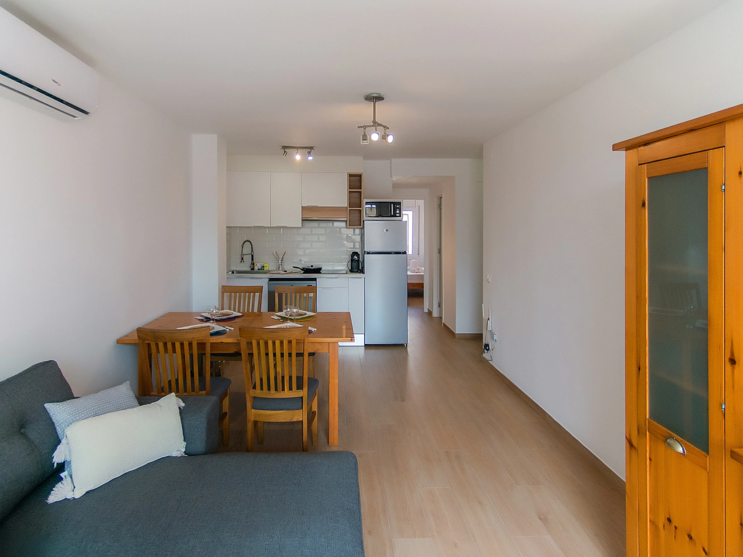 El luminoso salón incluye un acogedor sofá, Smart TV, aire acondicionado y acceso a una terraza, ideal para disfrutar de una relajante taza de café. El apartamento tiene dos dormitorios: el principal con una cama doble y el segundo con dos camas individuales. También hay un cuarto de baño en-suite.