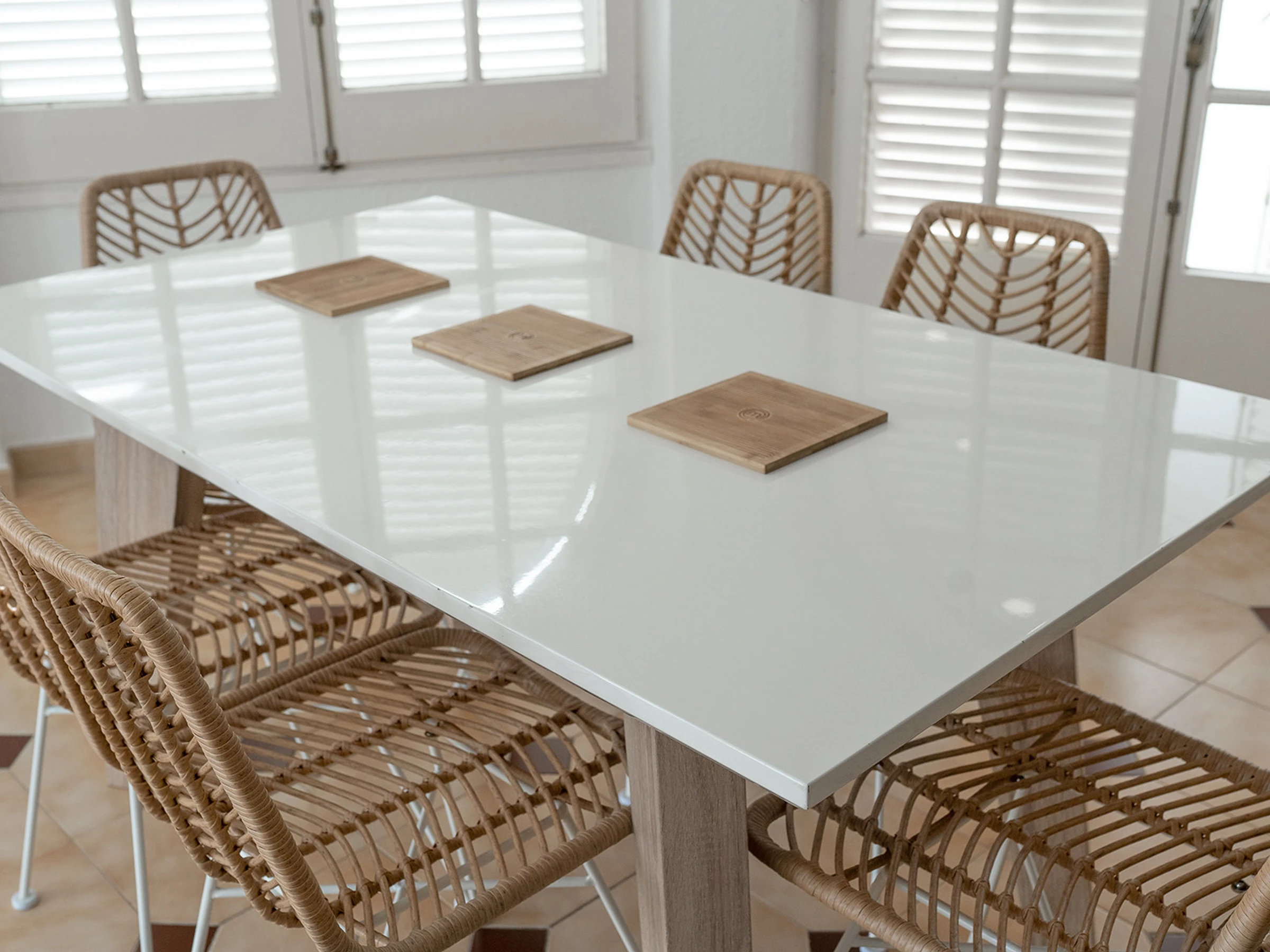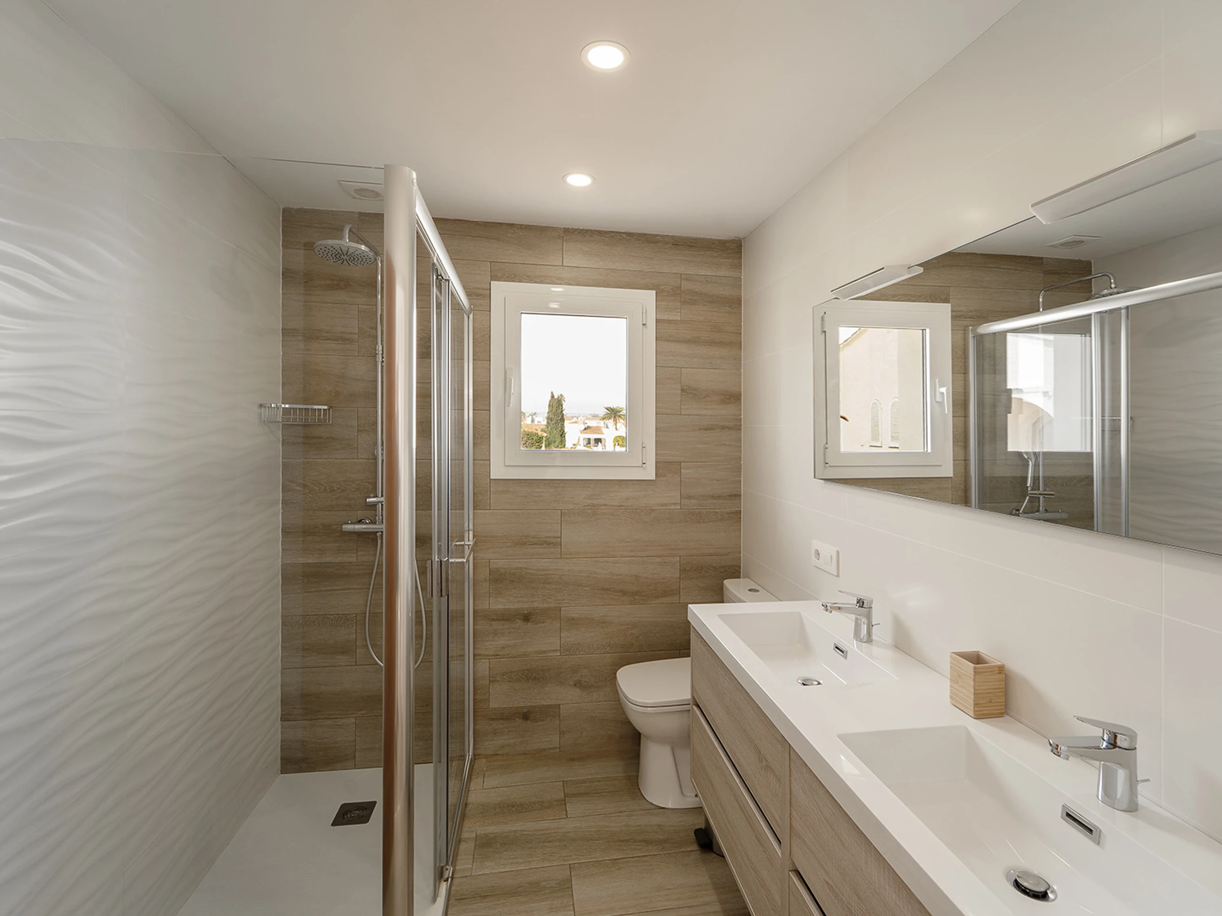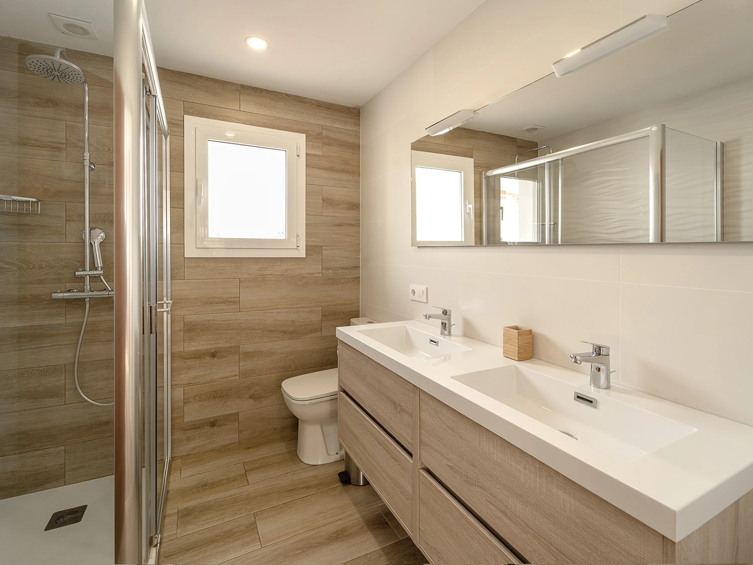 La sala luminosa tiene una zona de comedor y una acogedora zona de descanso con un televisor inteligente y un sofá cómodo, ideal para relajarse después de un día explorando Empuriabrava. La casa cuenta con 4 dormitorios: tres con camas matrimoniales y uno con litera. Además, hay 3 baños modernos con cabinas de ducha.