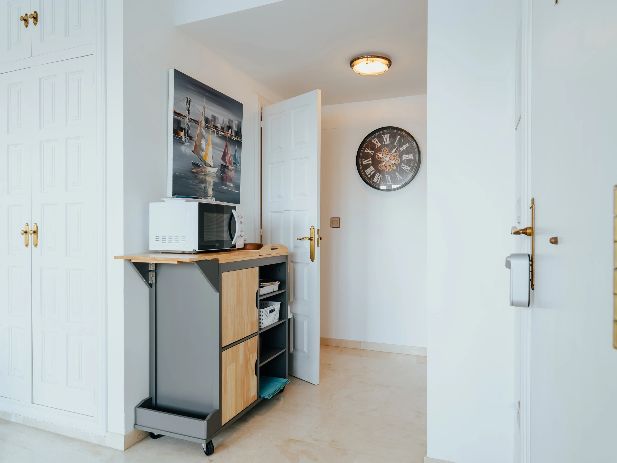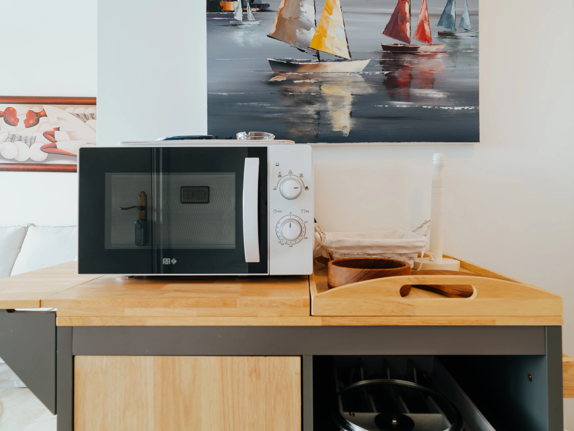 La cocina americana, con vitrocerámica, está equipada con todos los utensilios necesarios para preparar tus comidas favoritas, incluyendo nevera, microondas, cafetera, tostadora, hervidor de agua y vajilla.
