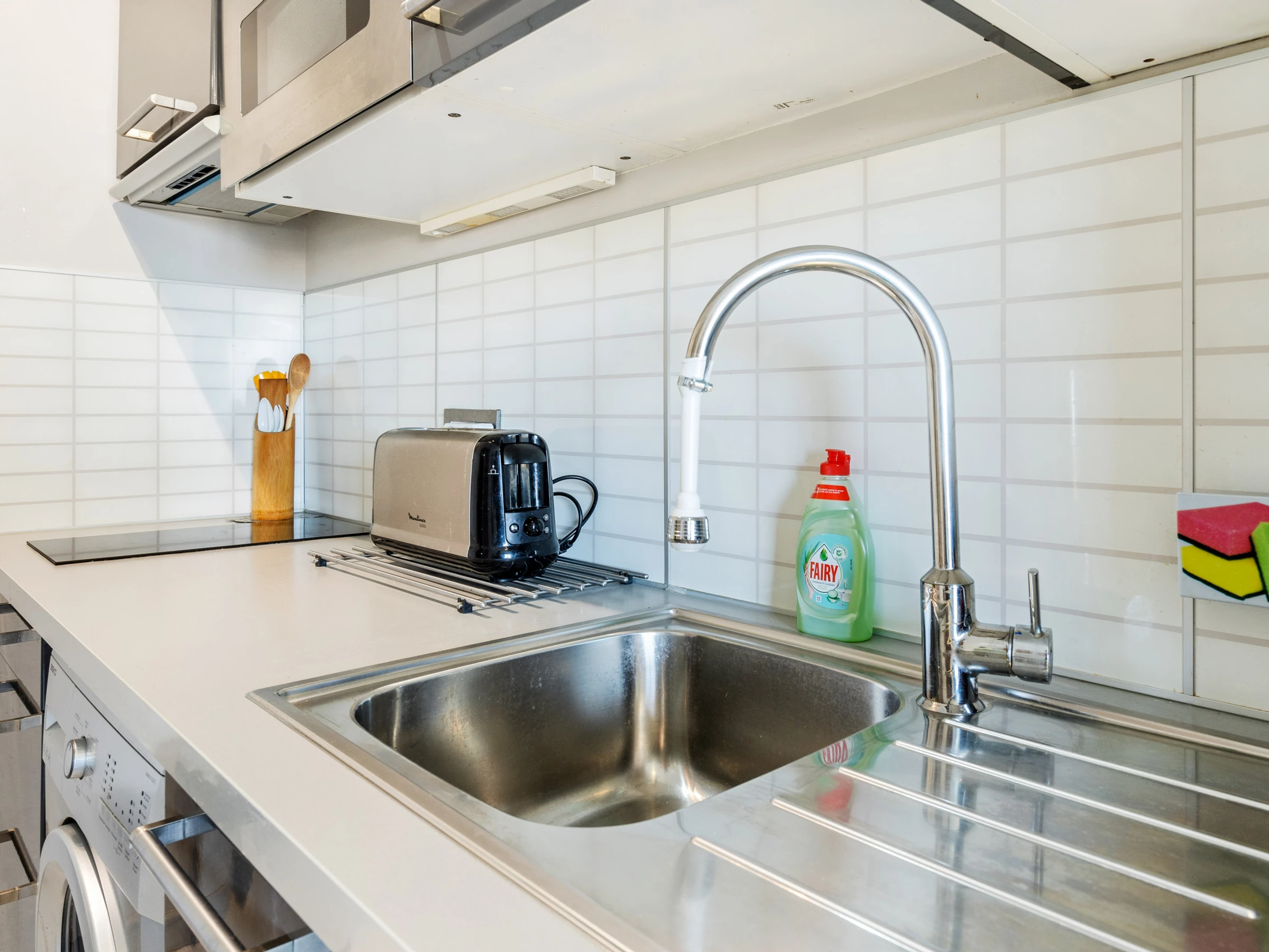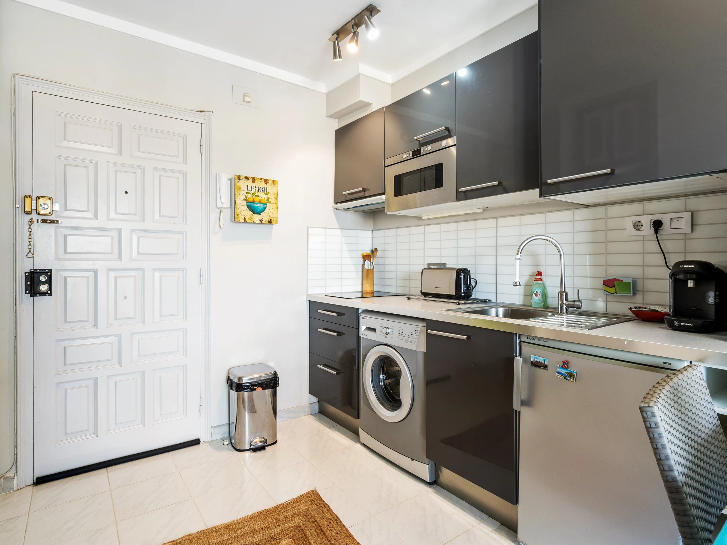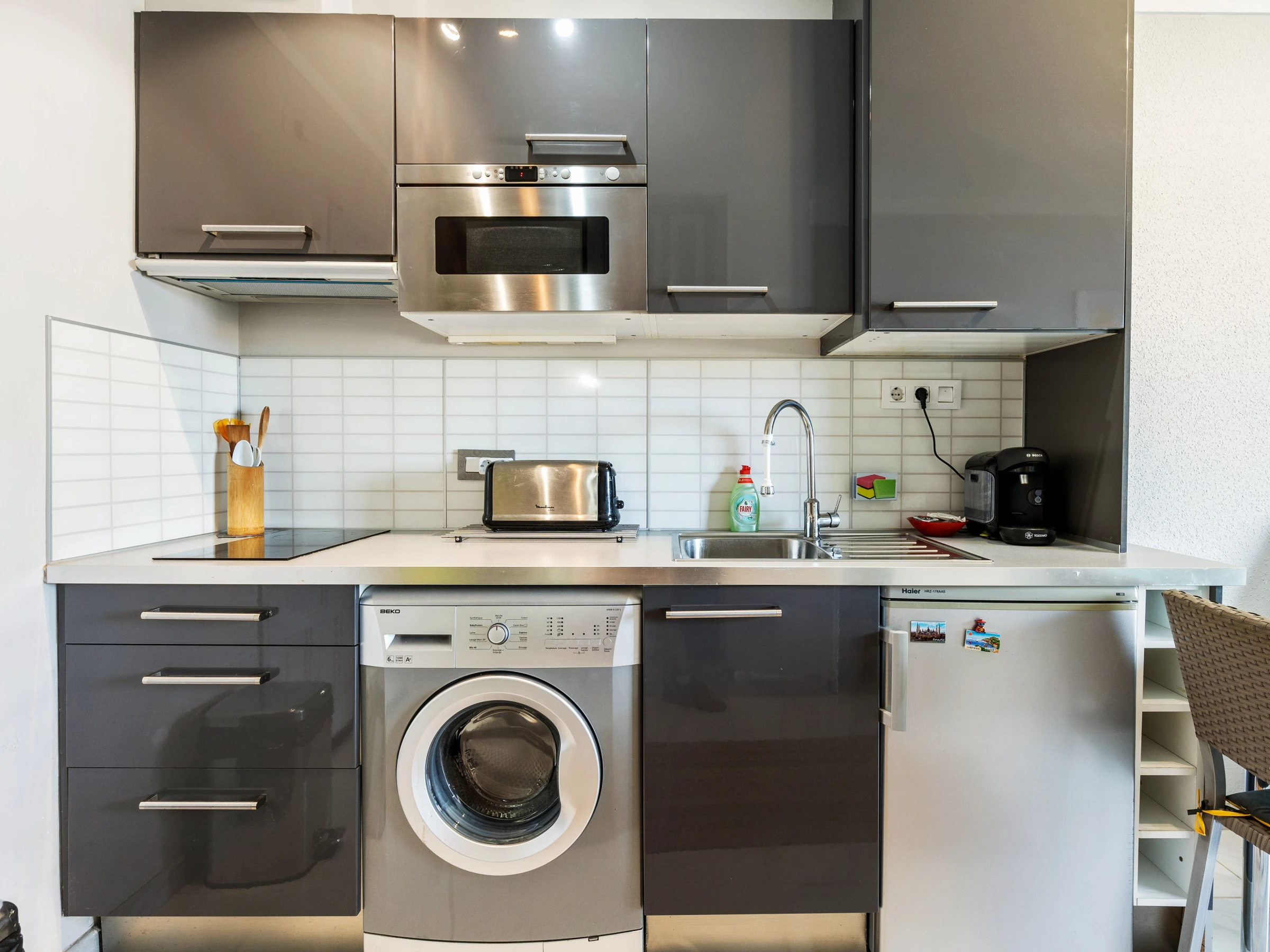 El apartamento dispone de una cocina totalmente equipada con placa de inducción, nevera, microondas y cafetera. Podrá relajarse en la amplia zona de estar con TV o salir a la terraza de 10 m² y disfrutar de las vistas.