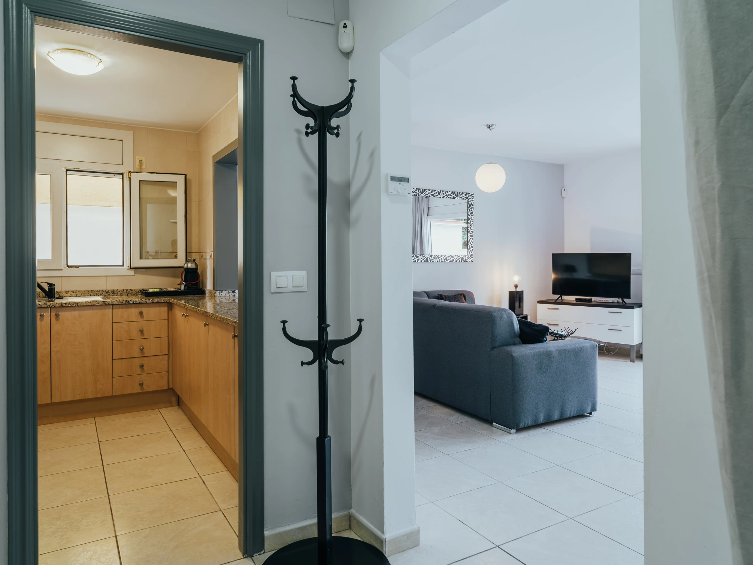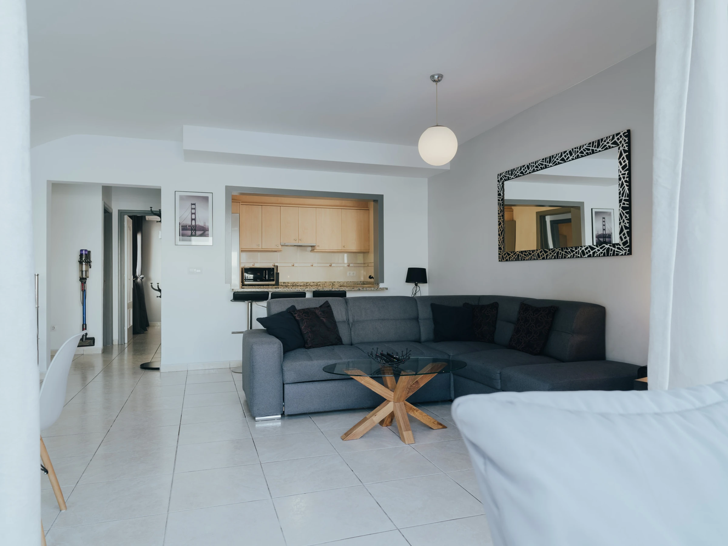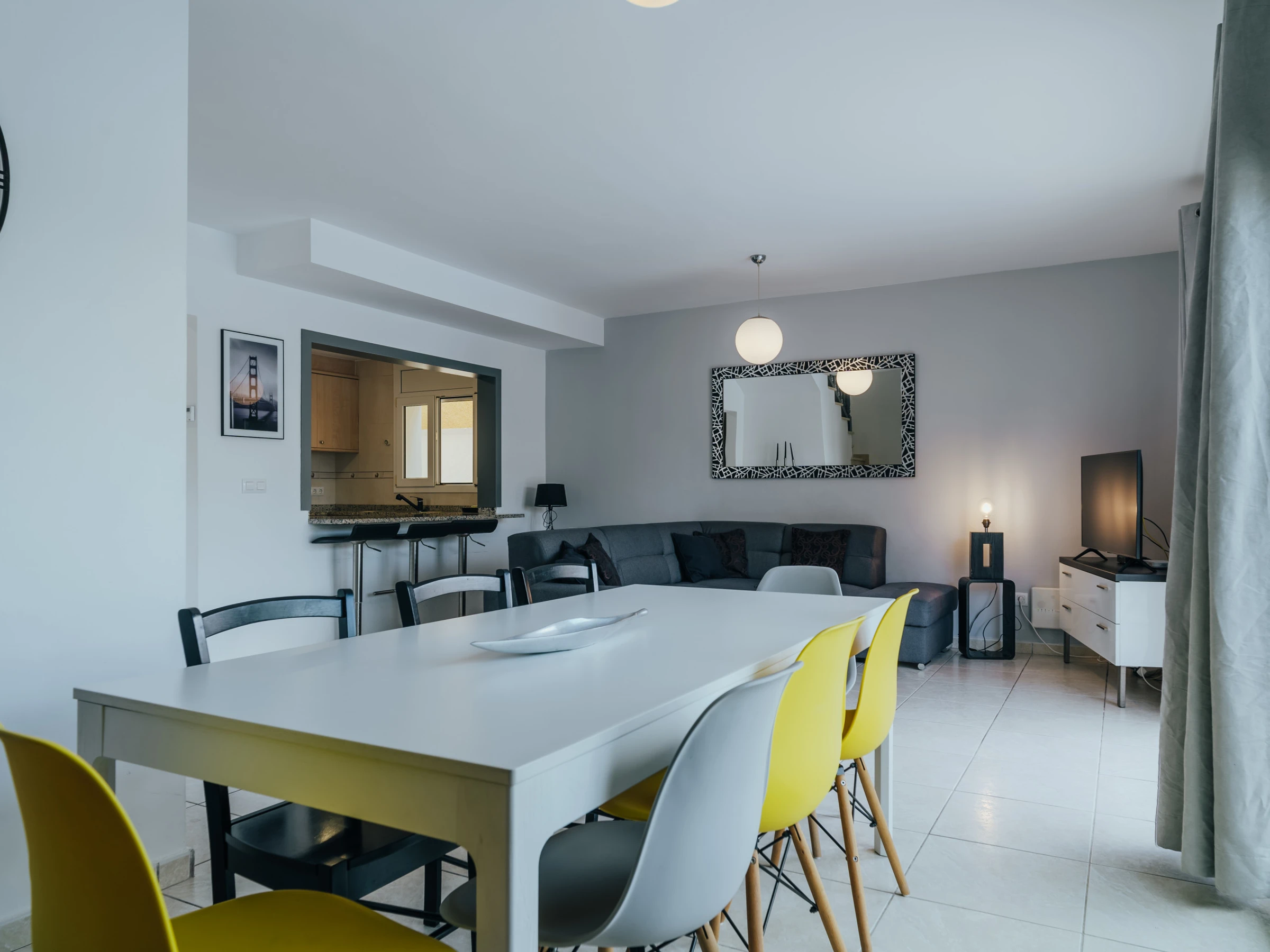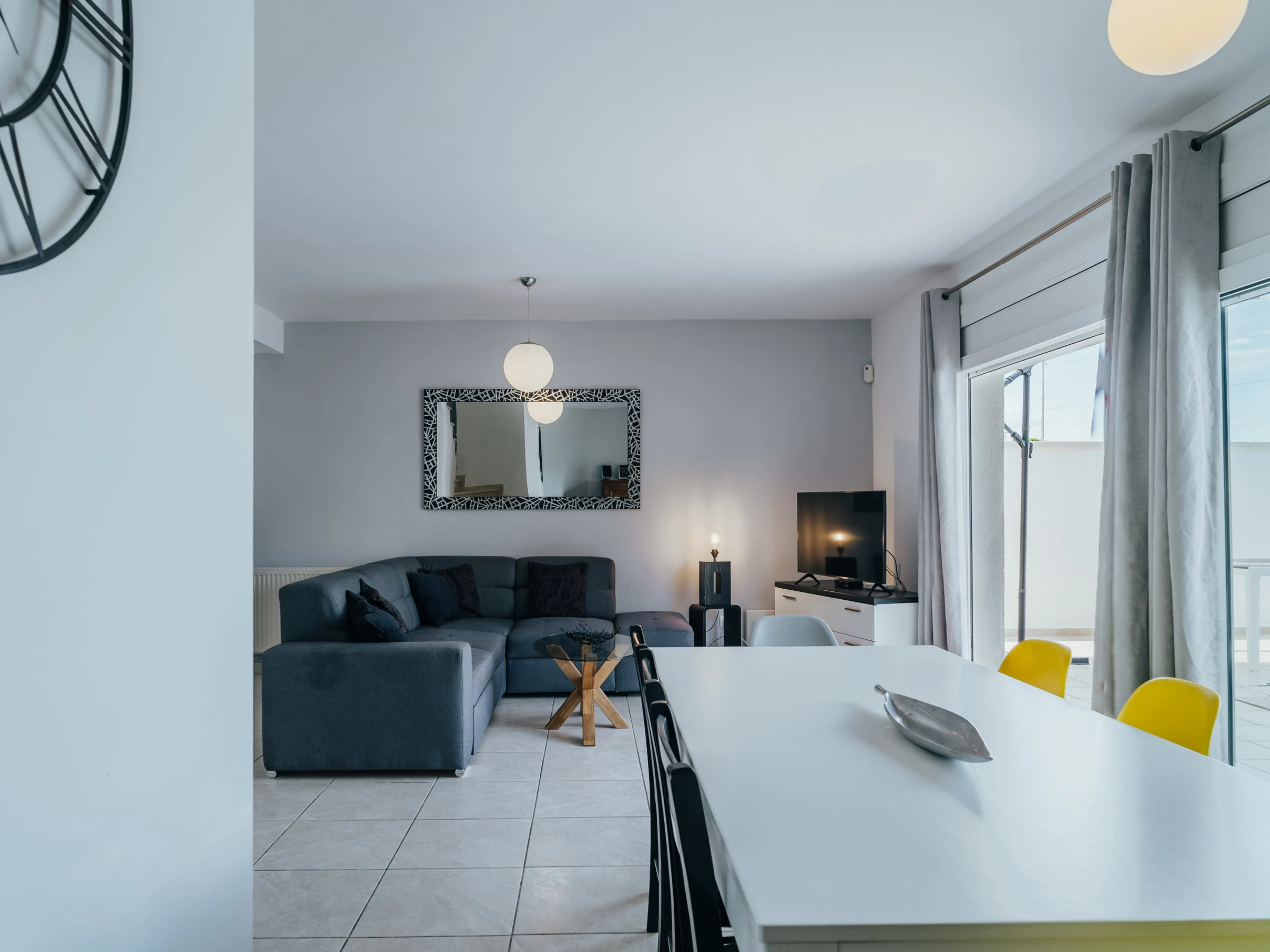 Hay un luminoso salón con zona de comedor y una zona de estar con Smart TV y un acogedor sofá.