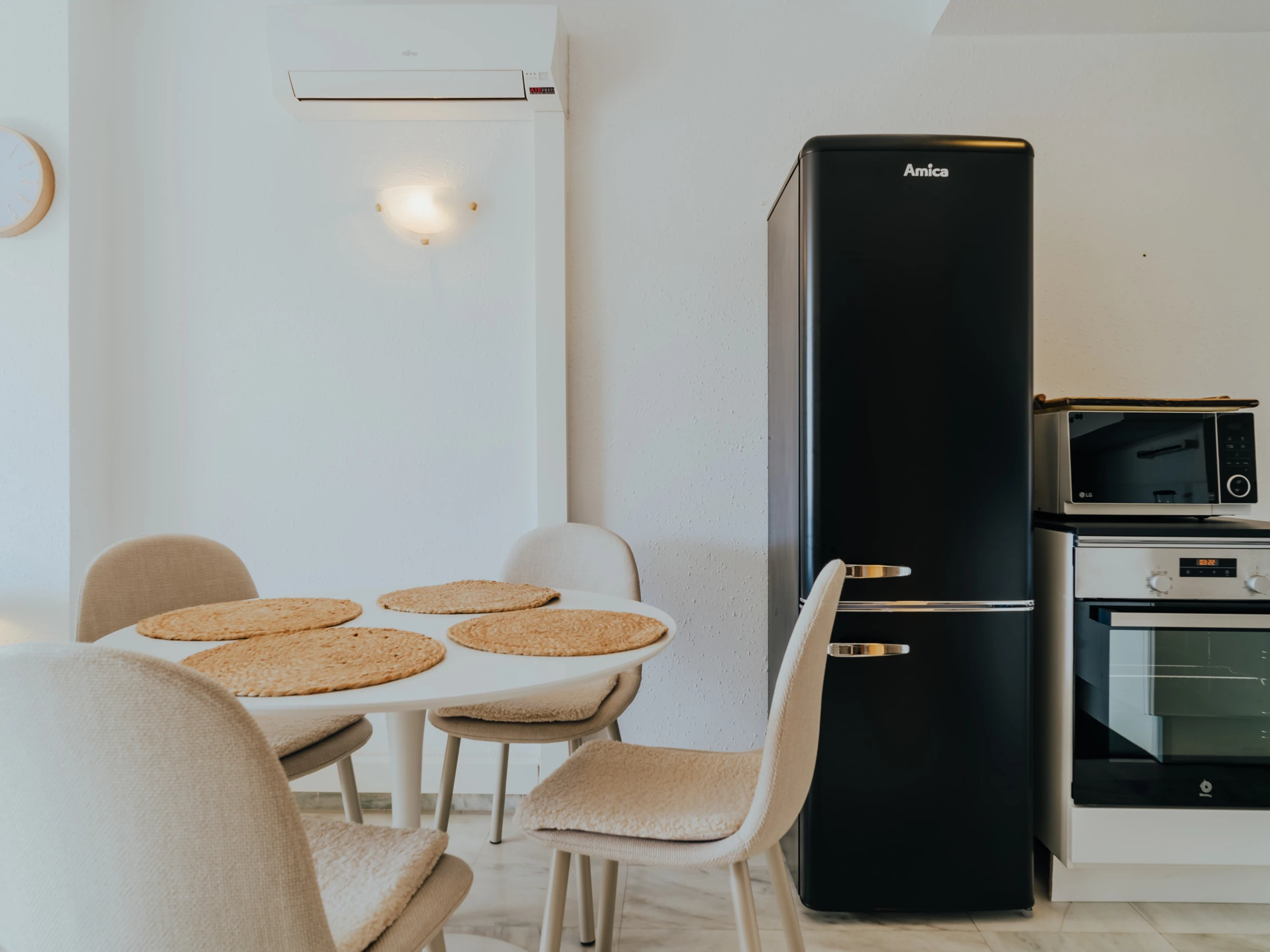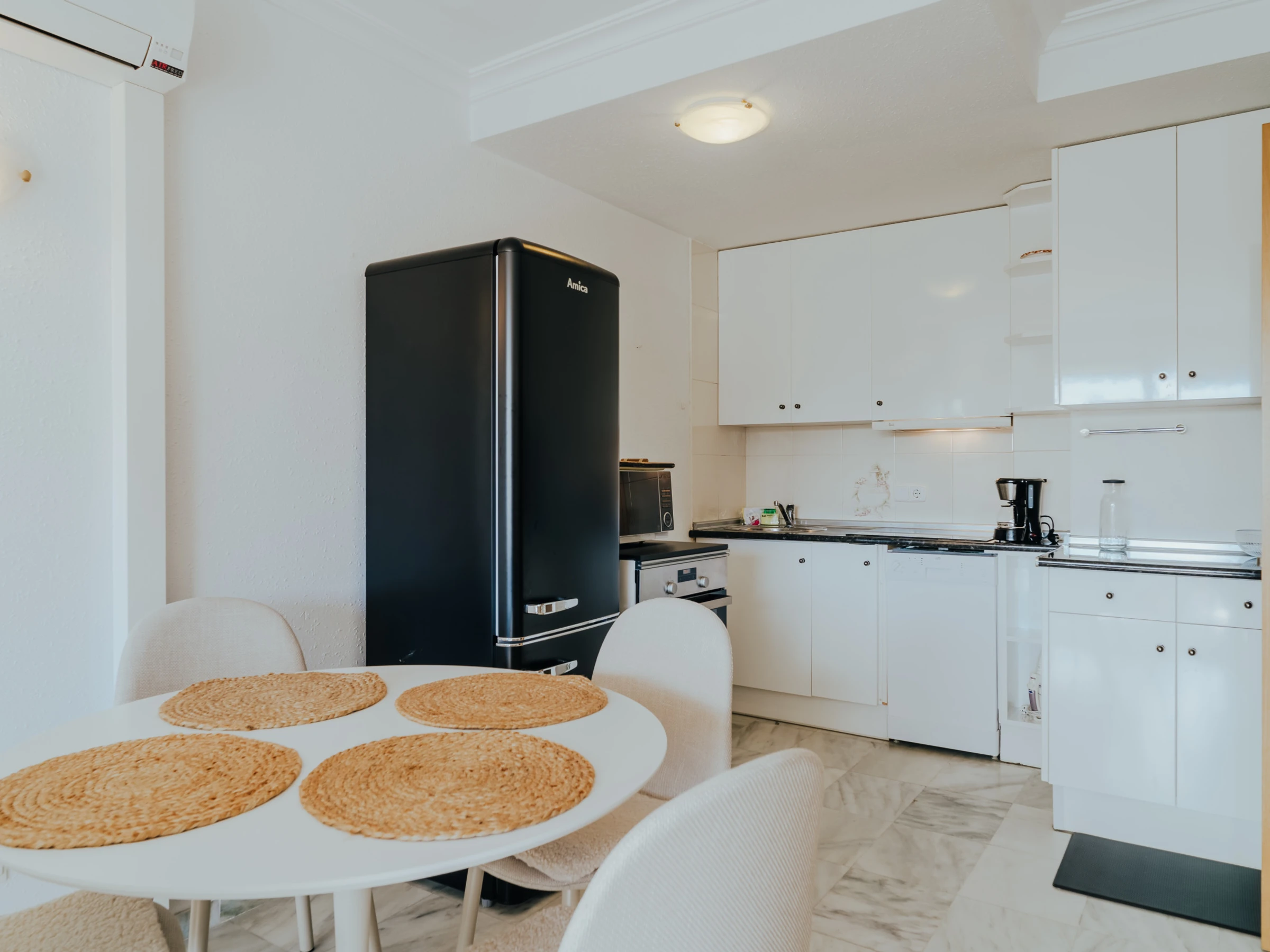 El área de la cocina, aunque compacta, está equipada con todo lo necesario para preparar deliciosas comidas. Una pequeña mesa de comedor es ideal para tomar un café por la mañana o una cena romántica.