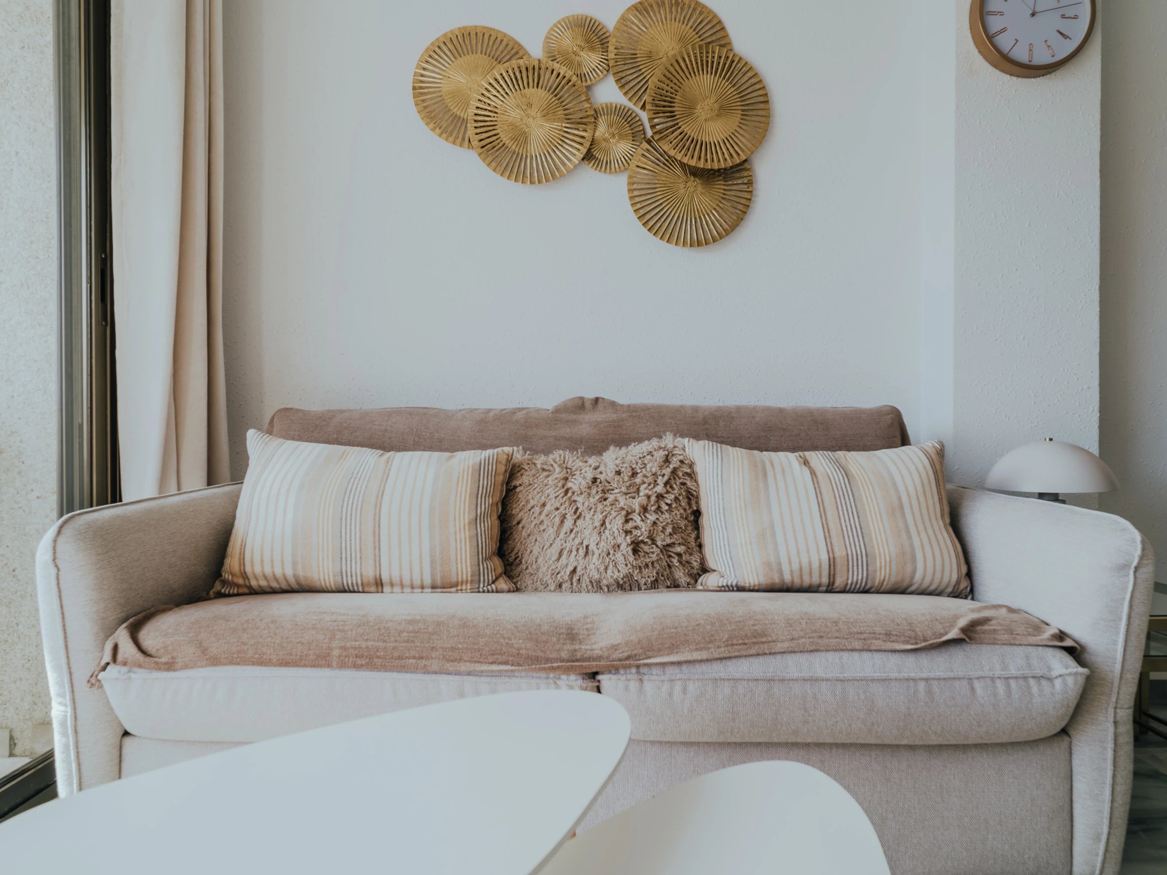 Las paredes pintadas en suaves tonos beige y crema crean una sensación de confort y comodidad. Los grandes ventanales cubiertos con cortinas de luz dejan entrar mucha luz, haciendo que el espacio sea luminoso y aireado. En el centro del salón hay un cómodo sofá con numerosos cojines que invitan a relajarse y disfrutar del silencio.