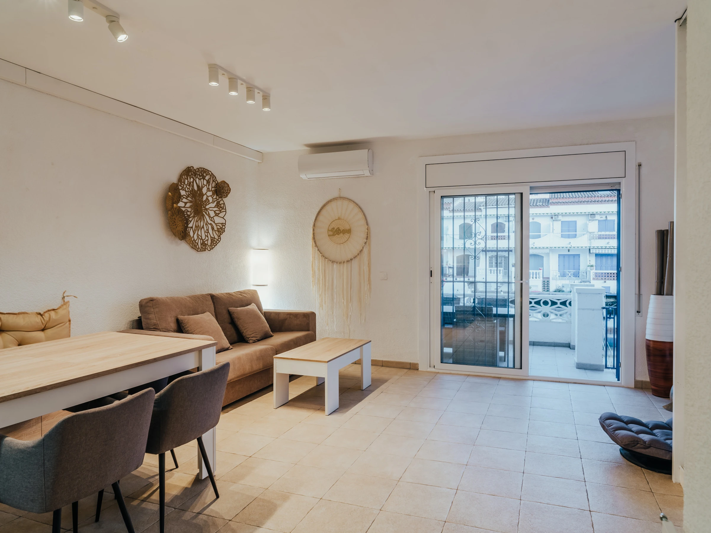 Bienvenidos a la increíble ciudad de Empuriabrava. Te ofrecemos uno de los mejores apartamentos de la Costa Brava, ubicado a pocos pasos de la playa y de los famosos canales de Empuriabrava. Este moderno apartamento vacacional de 59 m² tiene capacidad para 6 personas y cuenta con cocina totalmente equipada con electrodomésticos (frigorífico, hervidor, placa de inducción, horno, tostadora, cafetera, microondas, lavavajillas, utensilios de cocina) para que puedas cocinar tus propios platos favoritos. El amplio y luminoso salón cuenta con zona de comedor, un cómodo sofá cama, Smart TV y aire acondicionado. Desde el salón se accede a la terraza equipada con impresionantes vistas al mar y a Empuriabrava, el lugar ideal para disfrutar de una taza de café en total relajación.