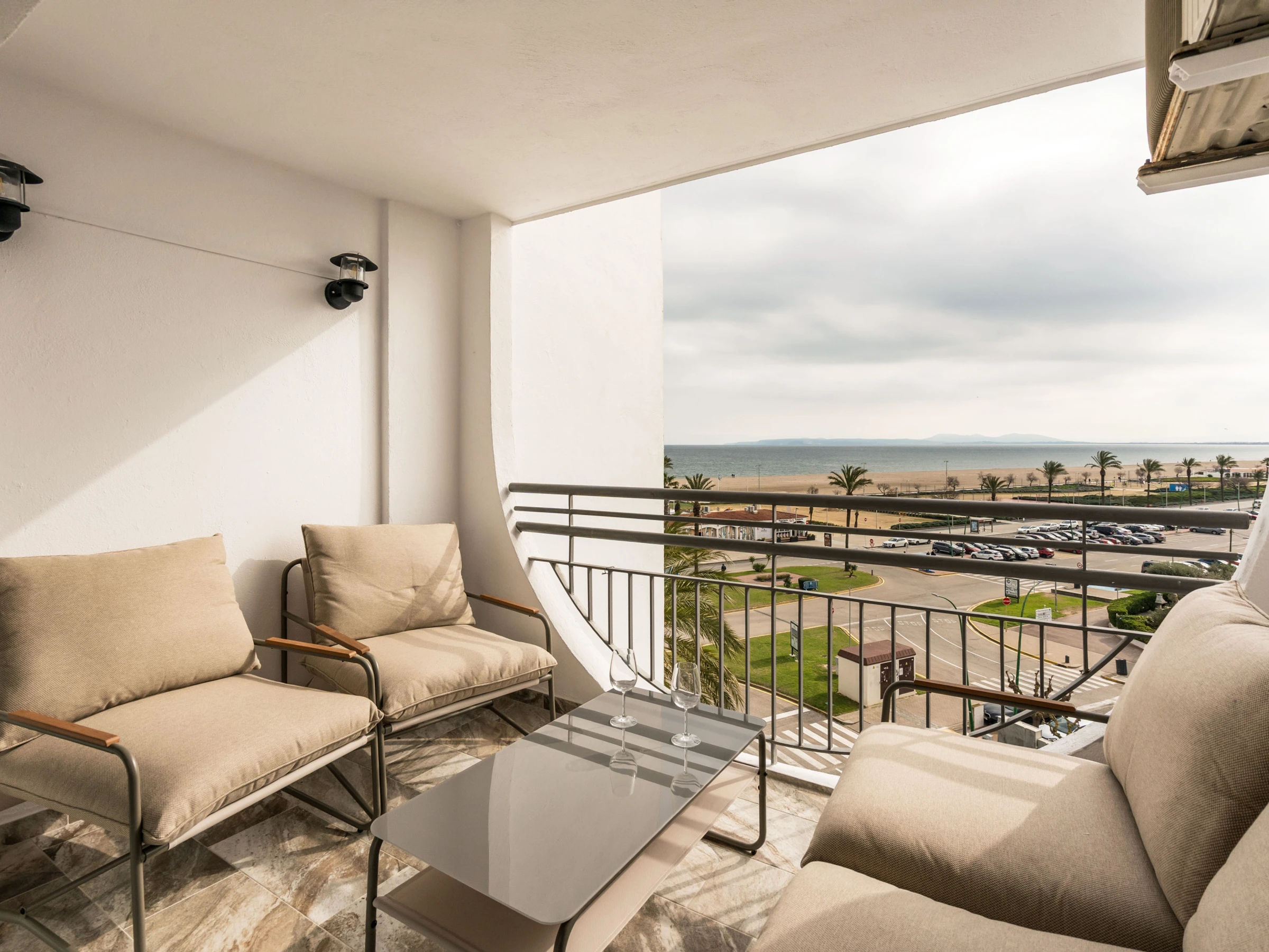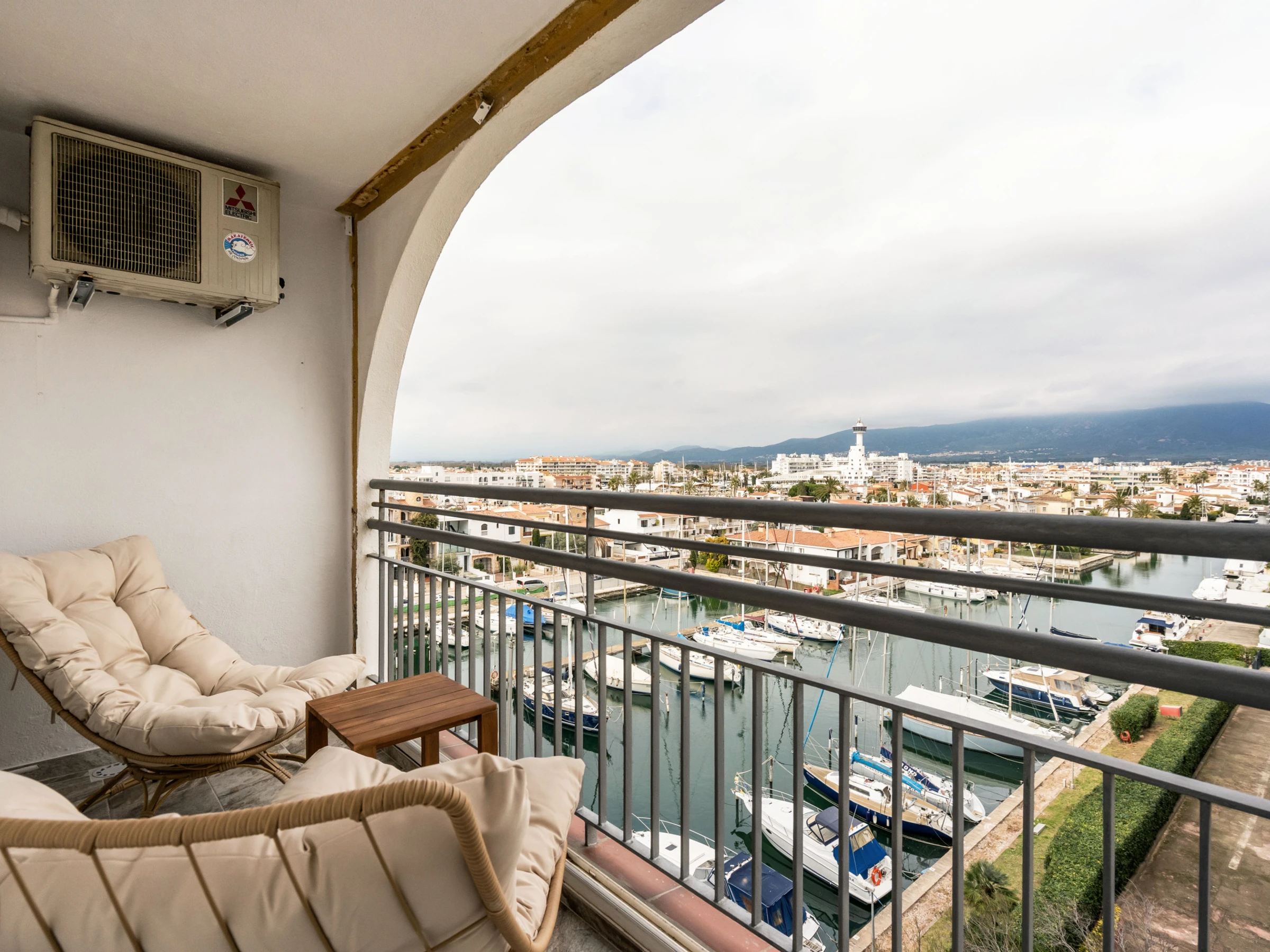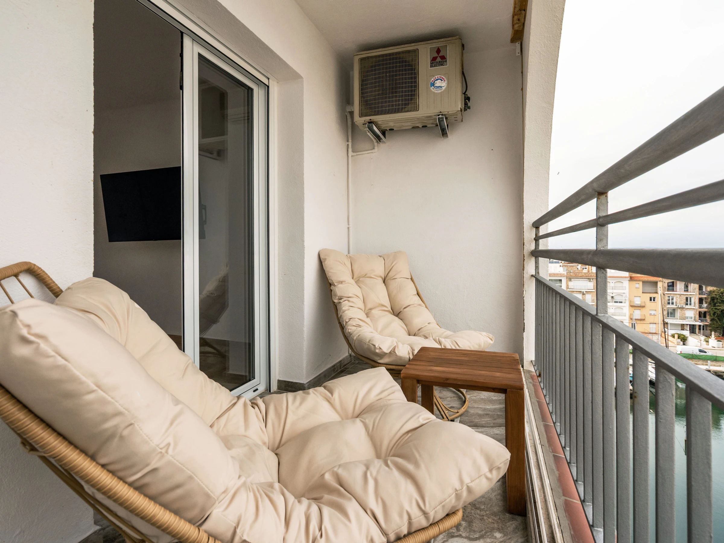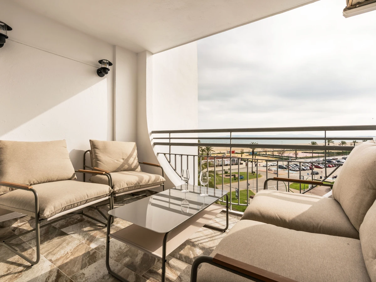 Apartamento frente al mar en Empuriabrava, ideal para estancias de hasta 4 personas. Dispone de 1 dormitorio con cama doble, salón-comedor con sofá cama, cocina equipada, baño completo y espacio exterior para disfrutar de las vistas. Incluye aire acondicionado. Se admiten mascotas de raza chica.