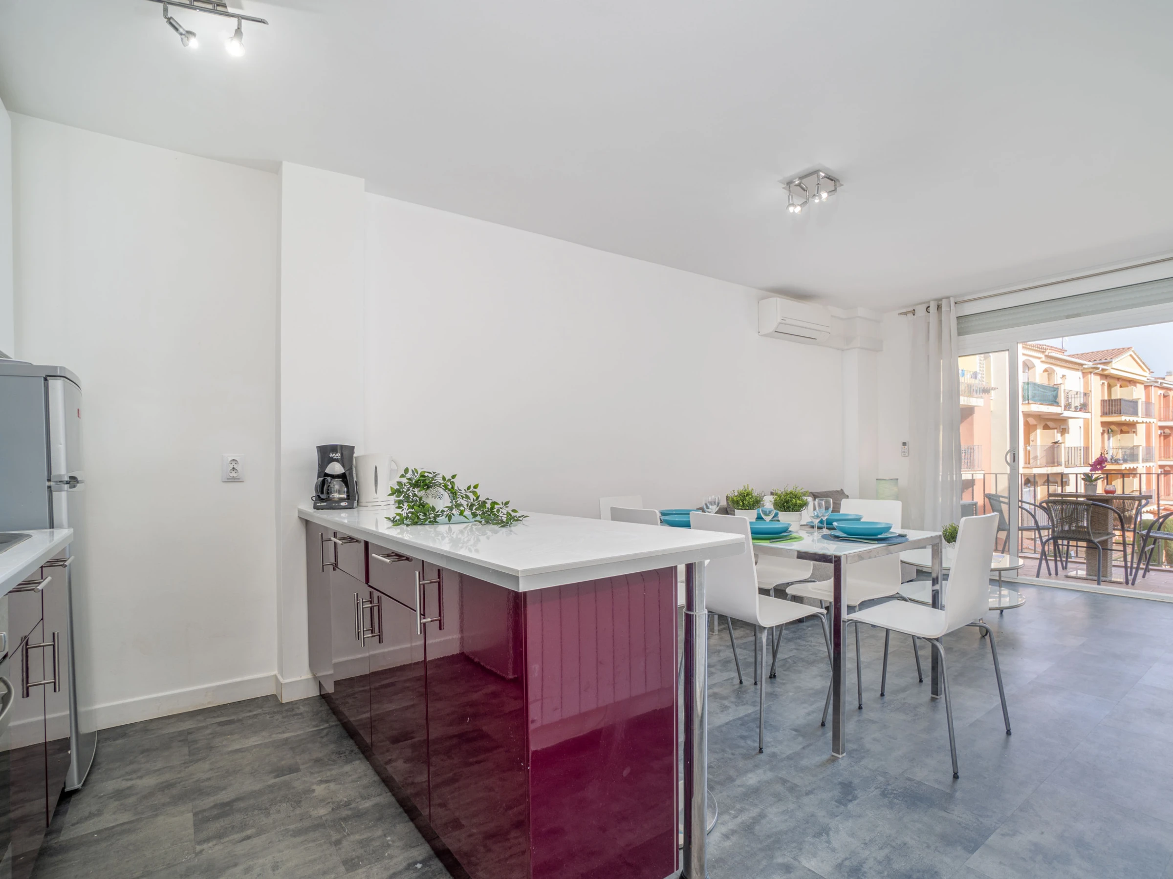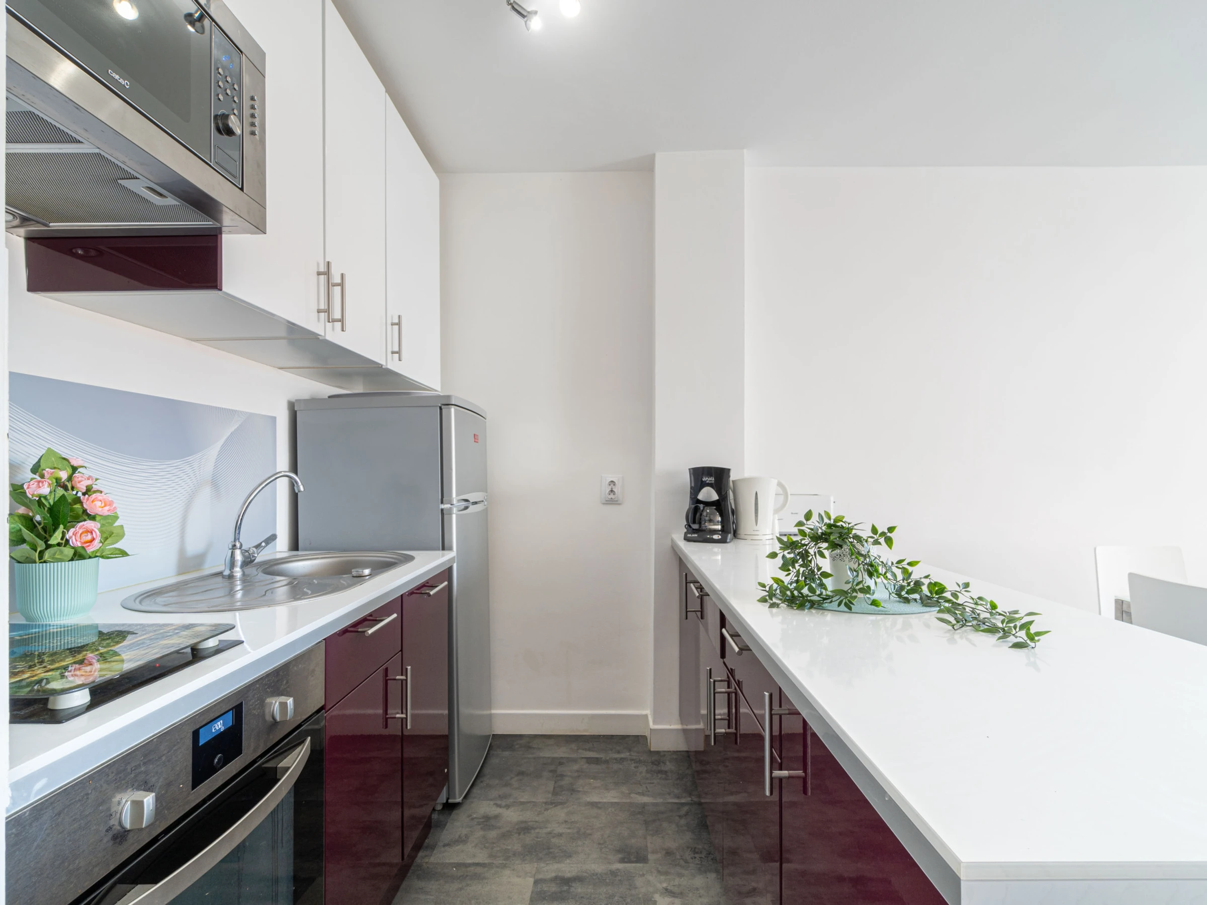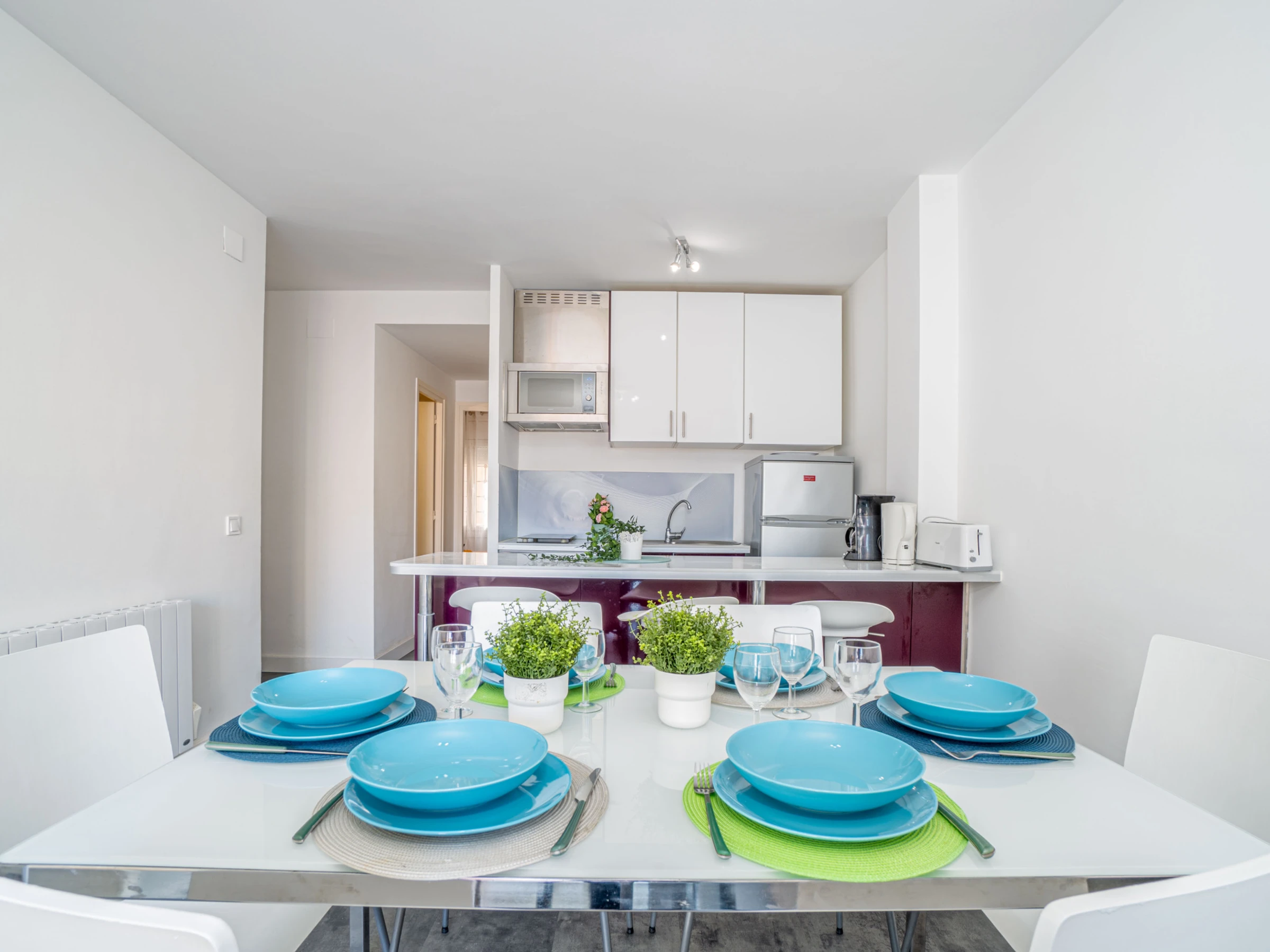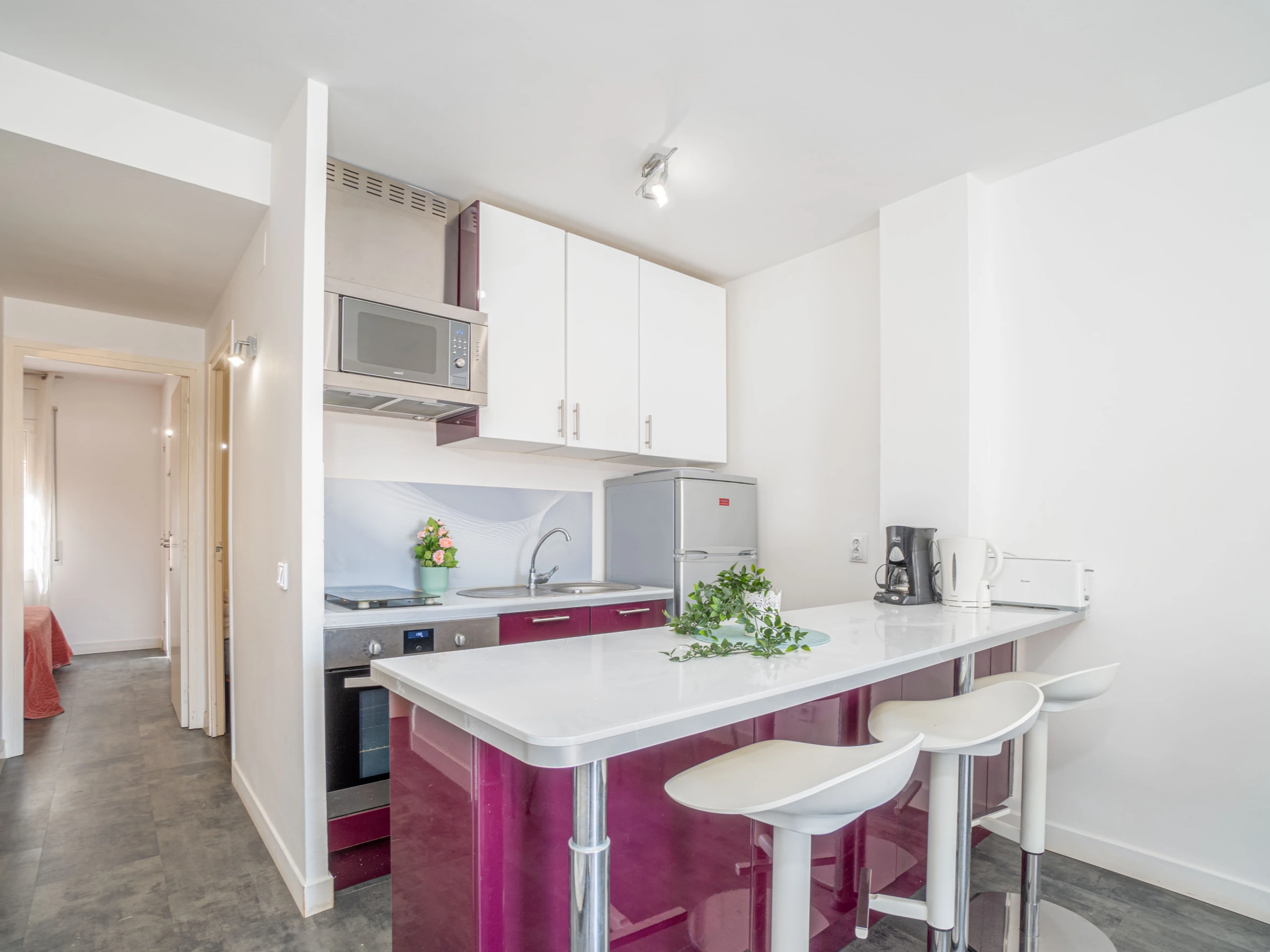 La cocina americana, de vitrocerámica, está equipada con nevera, microondas, horno, lavadora, vajilla, cubertería, utensilios de cocina, cafetera, tostadora y hervidor de agua, ofreciendo todo lo necesario para una estancia cómoda y práctica.