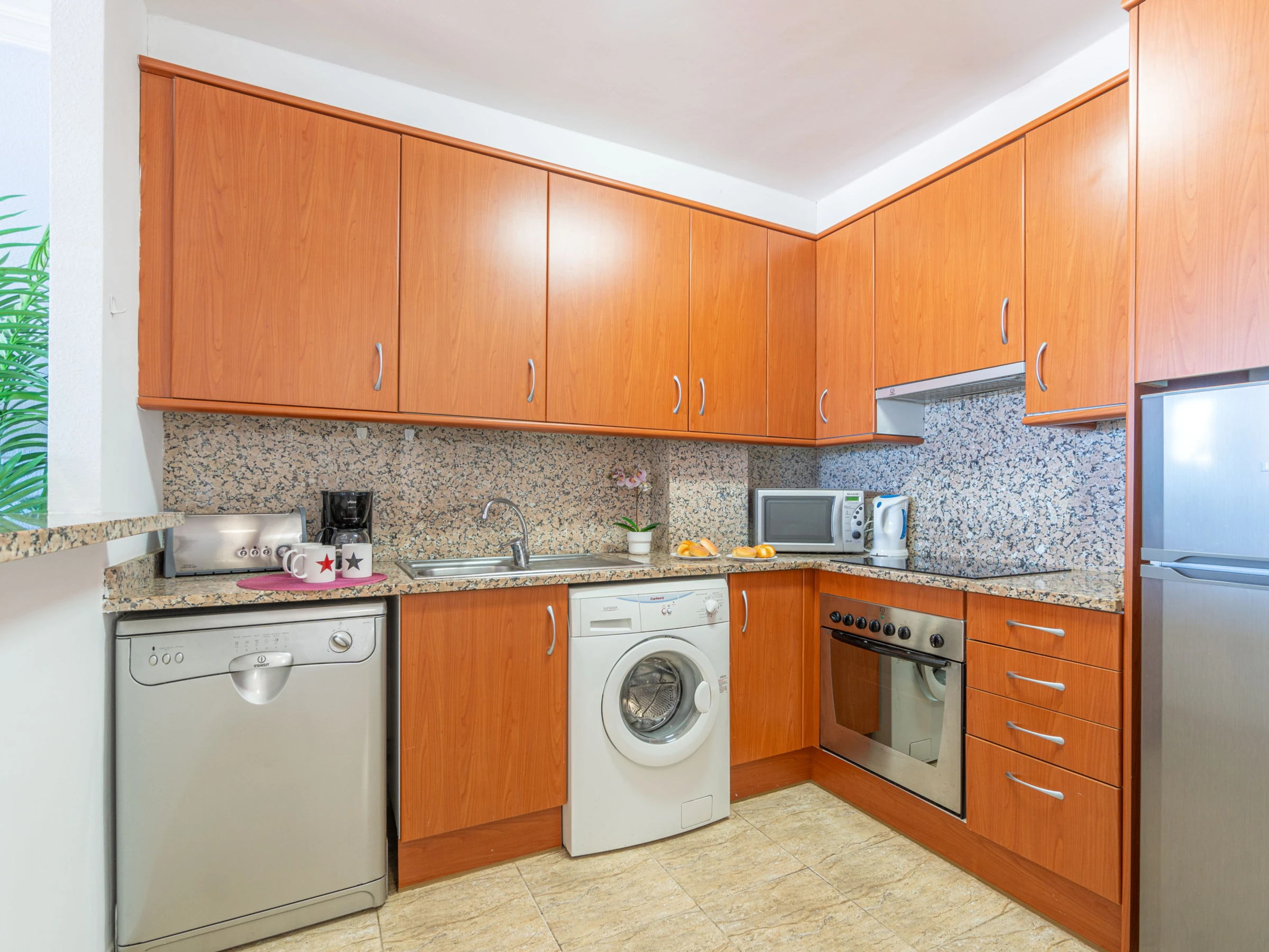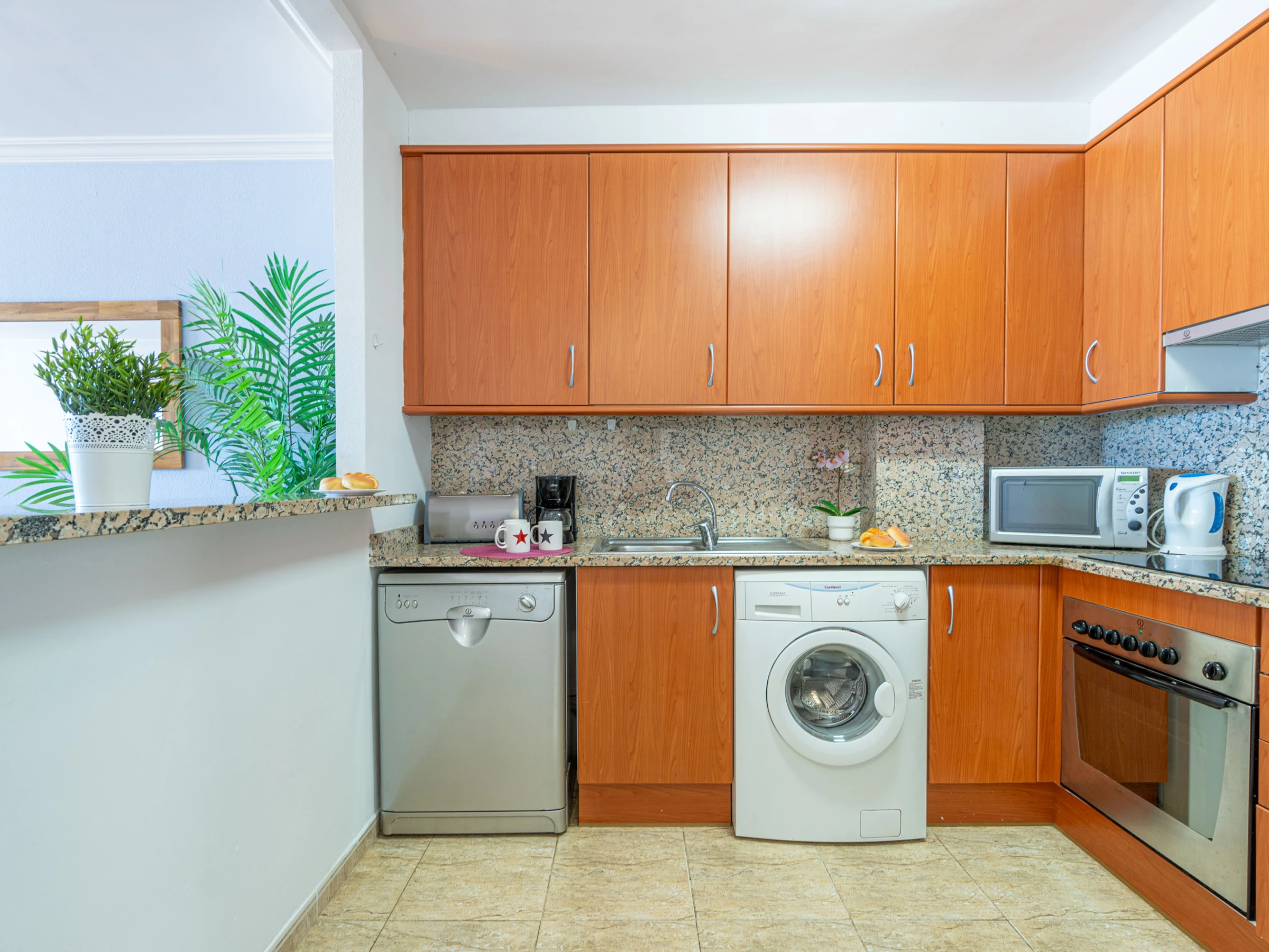 La cocina americana, de vitrocerámica, está equipada con nevera, microondas, horno, congelador, lavadora, lavavajillas, vajilla, cubertería, utensilios de cocina, cafetera, tostadora y hervidor de agua.