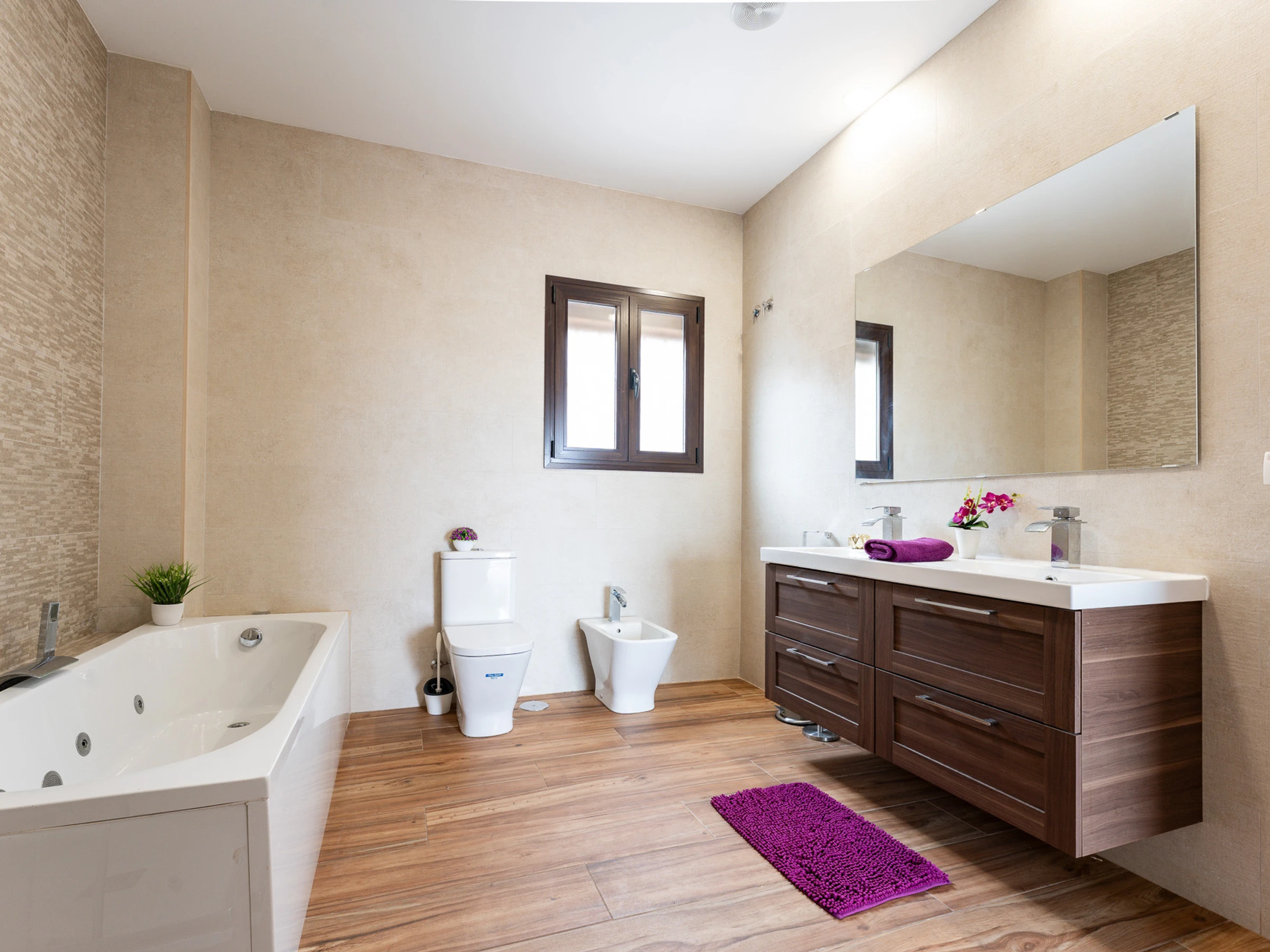 La vivienda cuenta con 5 dormitorios y 11 camas distribuidas estratégicamente: 3 camas dobles, 1 sofá cama doble y 7 camas individuales. Dispone de 4 baños, 3 con ducha y 1 con bañera, garantizando comodidad y privacidad para todos los huéspedes.