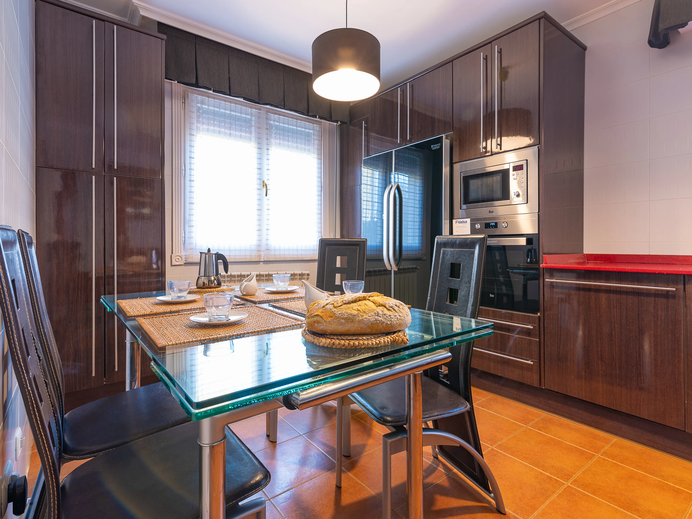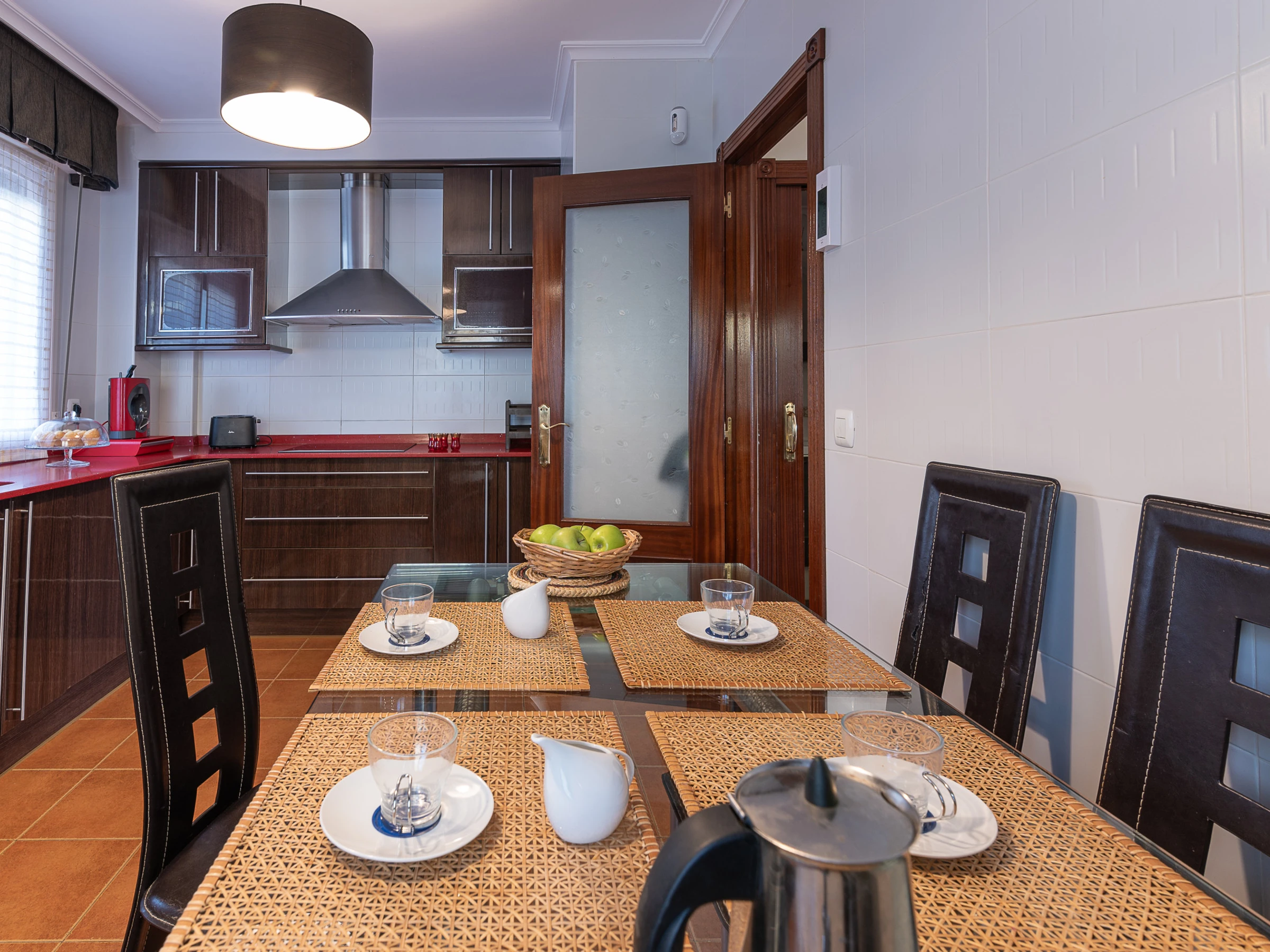 La cocina está equipada con todos los electrodomésticos necesarios: nevera, horno, microondas, lavavajillas, lavadora, cafetera, hervidor de agua, etc. Además, cuenta con una pequeña mesa de desayuno y se encuentra adyacente al comedor.
