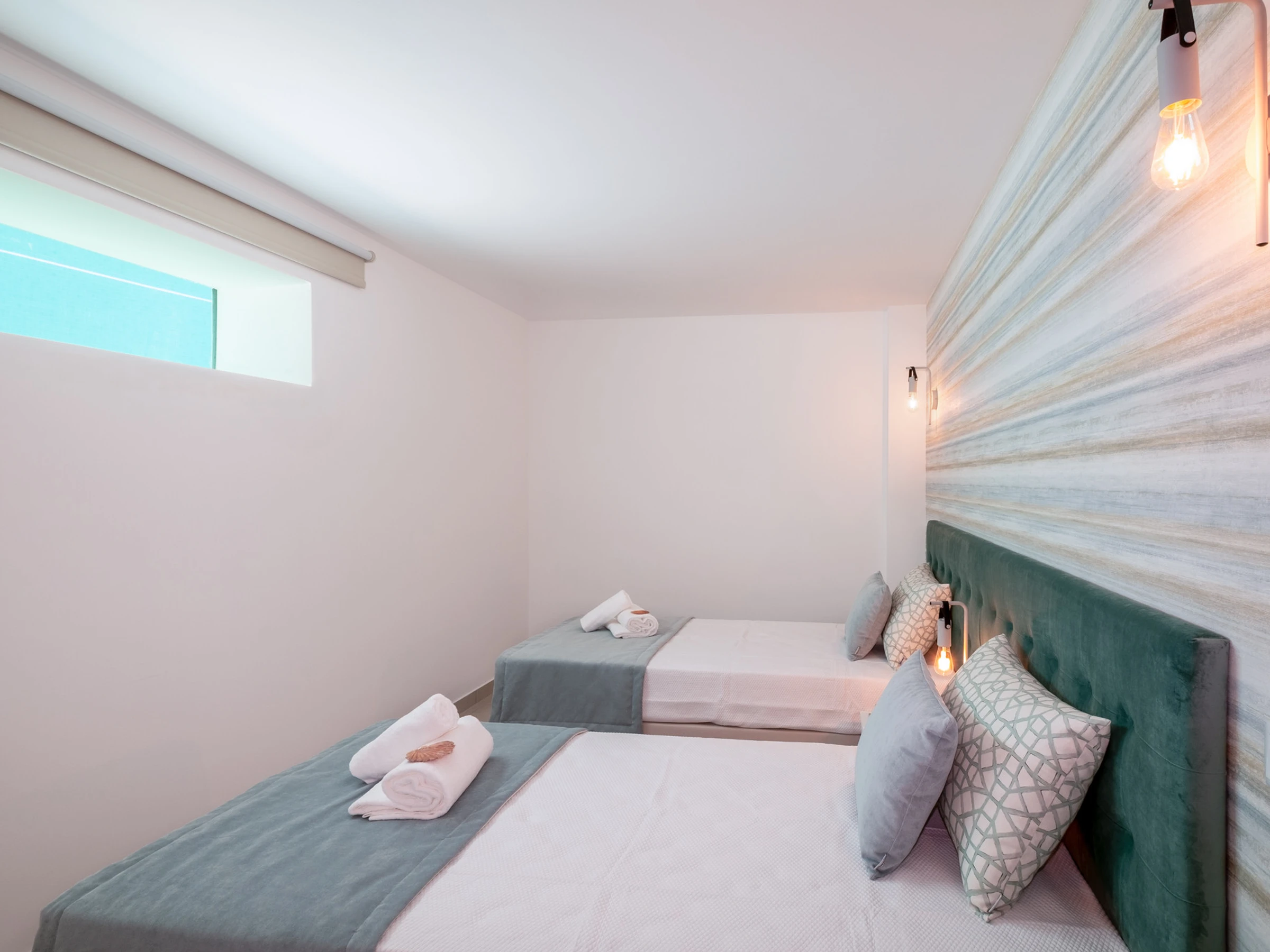 En la planta inferior, hay cuatro habitaciones diseñadas para acomodar diferentes necesidades: una habitación con cuatro literas, otra con cama de matrimonio, una con dos camas individuales y una habitación con cuatro camas individuales. Esta planta también cuenta con dos baños y una sala de juegos con billar, ping pong y futbolín.