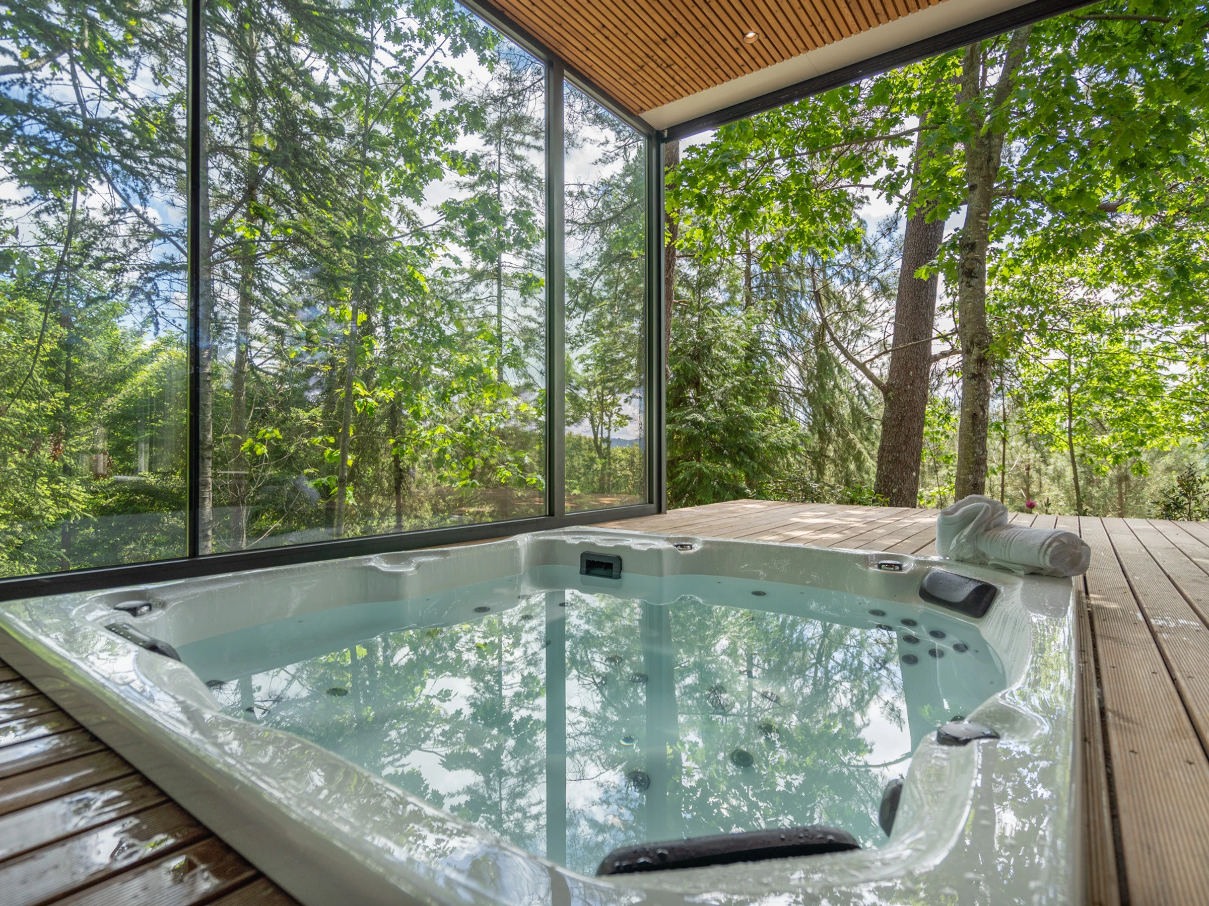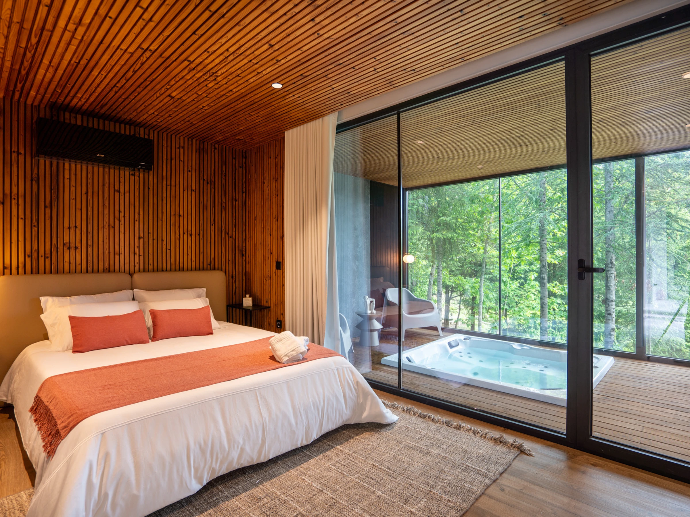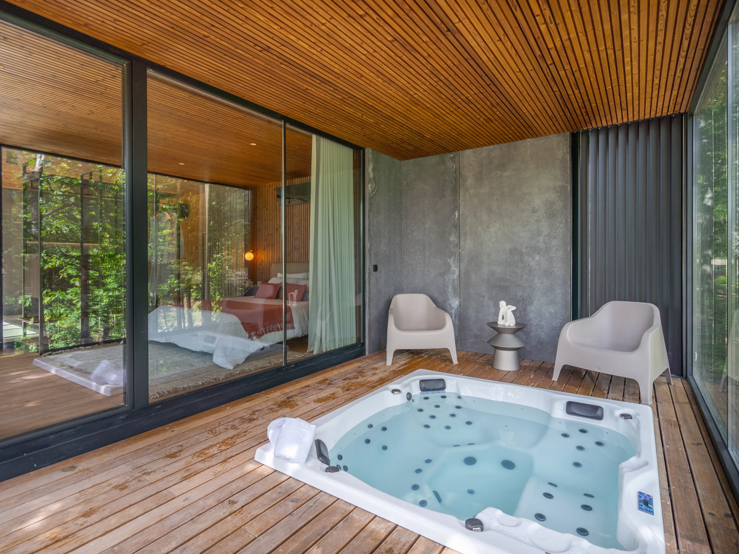 En la zona exterior encontrará nuestro jacuzzi privativo y en la terraza sillas para su descanso. También hay disponibles colchonetas de exterior para que puedan descansar a la sombra de nuestro Pino Manso.