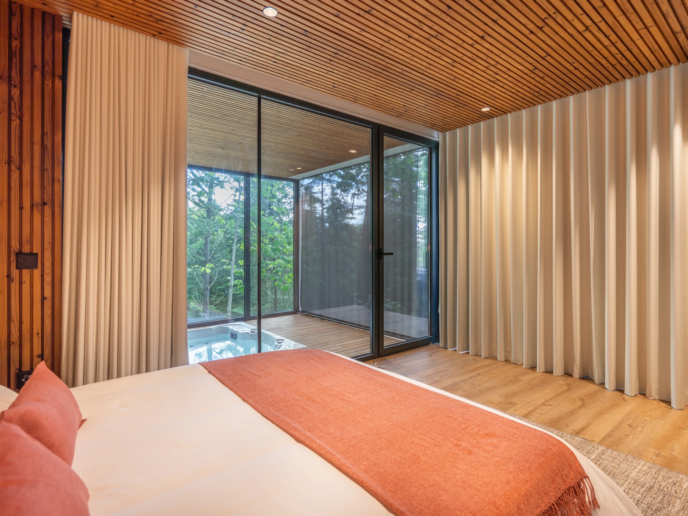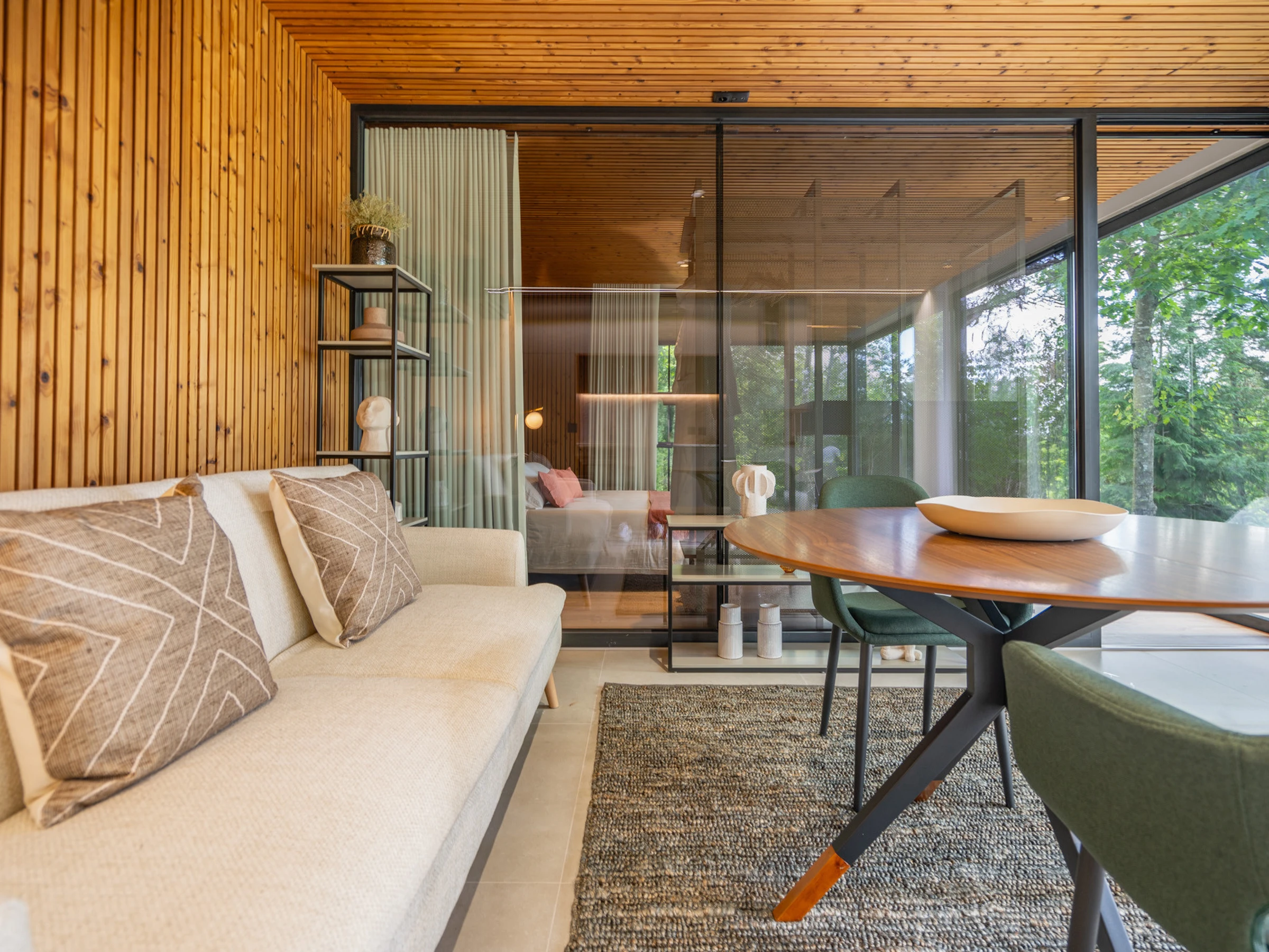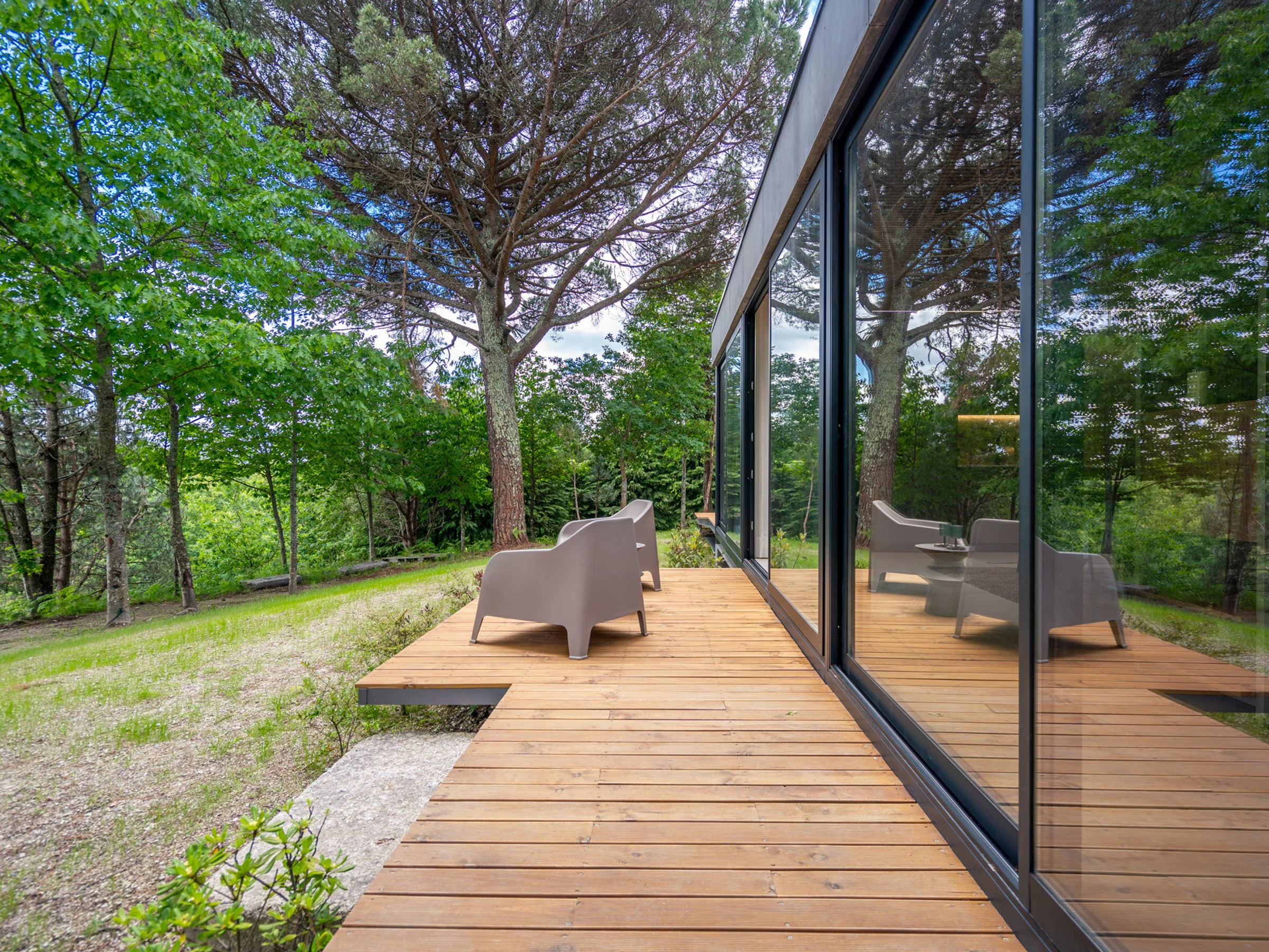 En la zona exterior encontrará nuestro jacuzzi privativo y en la terraza sillas para su descanso. También hay disponibles colchonetas de exterior para que puedan descansar a la sombra de nuestro Pino Manso.