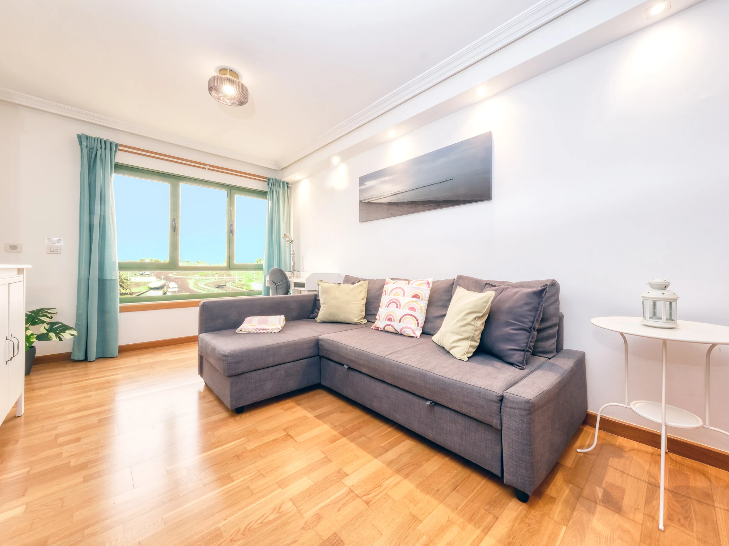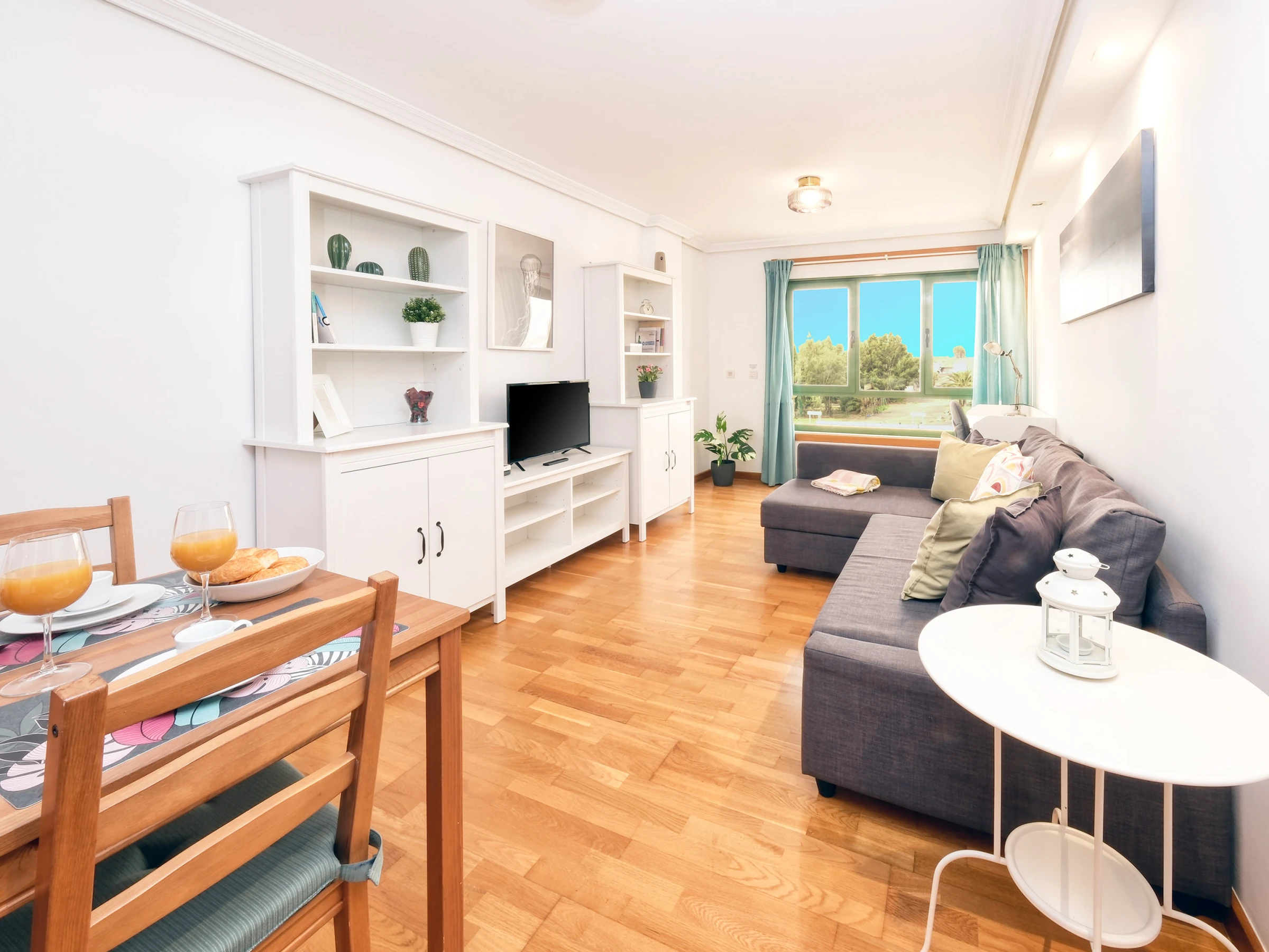 Relájate en el luminoso salón, desde donde podrás apreciar una vista lateral al mar. Este espacio está equipado con una Smart TV, un gran sofá cama doble, un escritorio de trabajo y una mesa de comedor para disfrutar de tus comidas. Además, la zona de cocina, contigua al salón, está totalmente equipada con todos los electrodomésticos necesarios, incluyendo una cocina de 4 fuegos, nevera, microondas, horno, cafetera, hervidor de agua y tostadora.