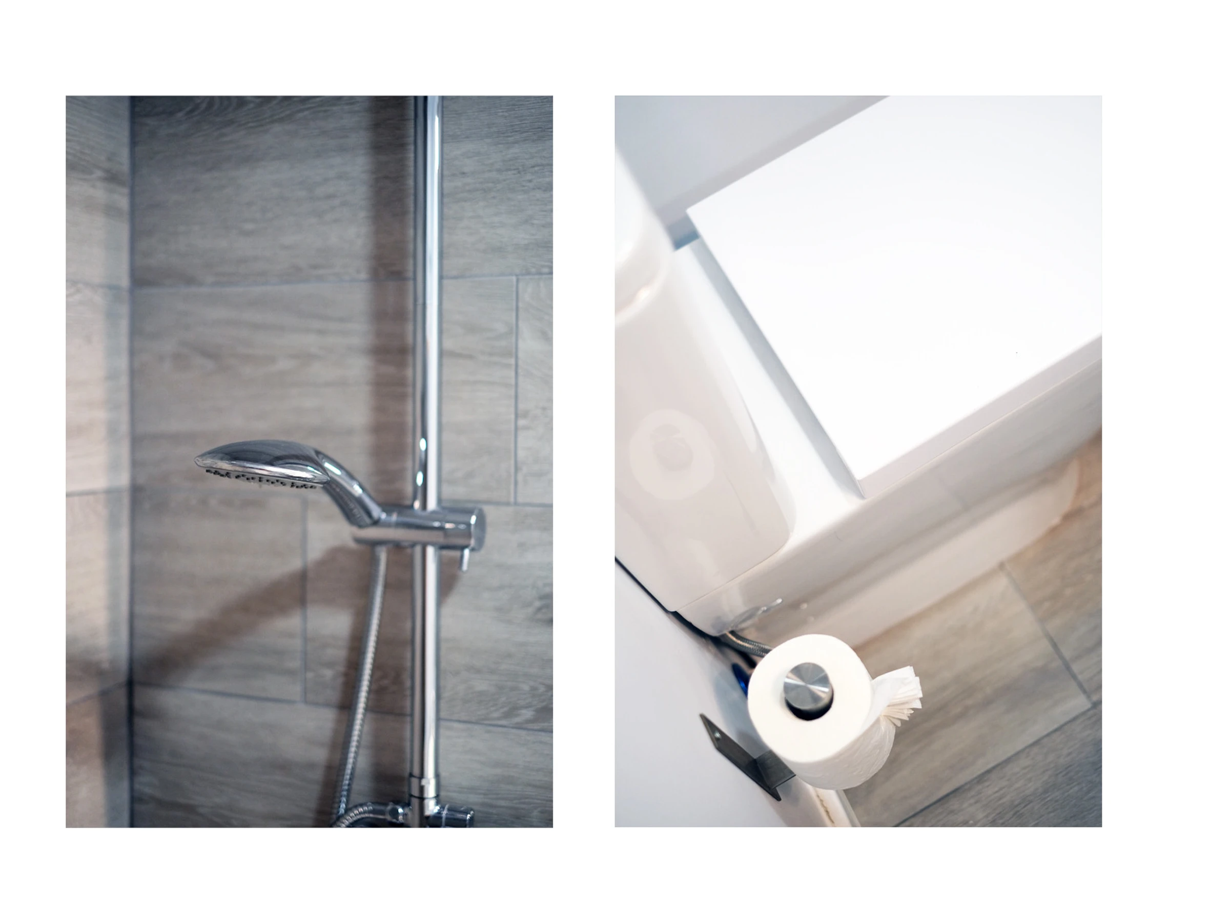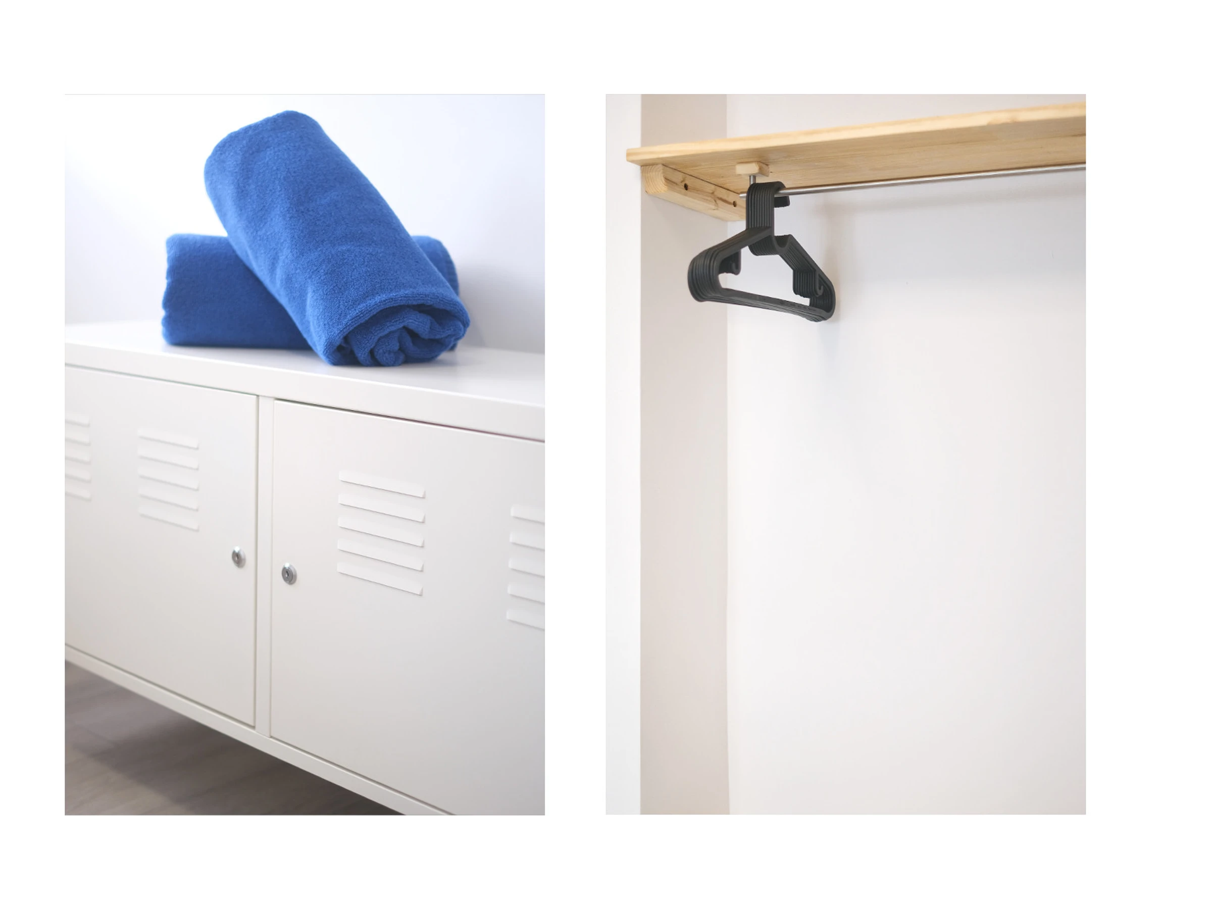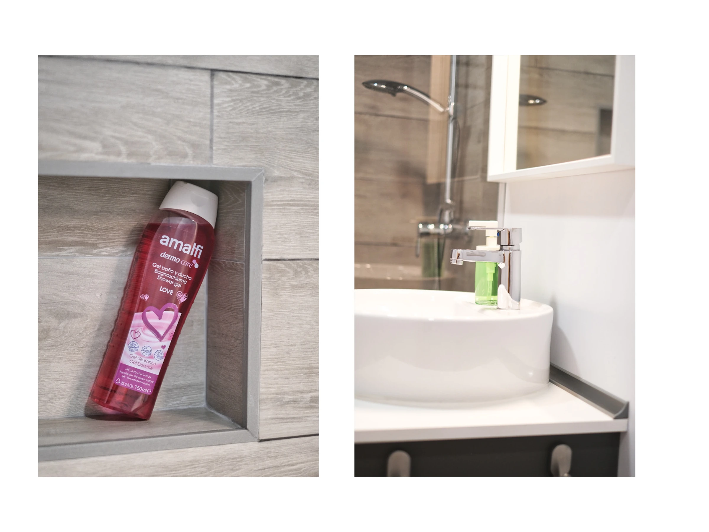 El salón tiene una mesa de comedor, dos sillones individuales y una ventana al exterior. Separado del salón-cocina por una mampara corredera se encuentra el dormitorio, que tiene una cama doble de 160 cm. El baño tiene una ducha con mampara de ducha y secador de pelo y plancha para la ropa.