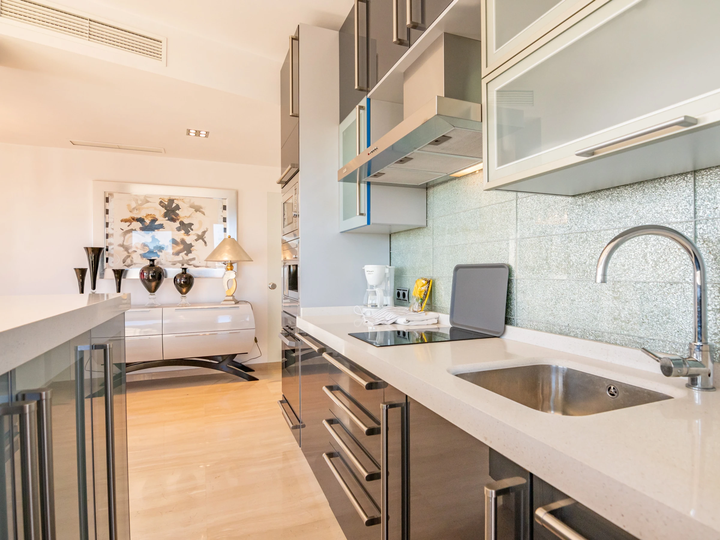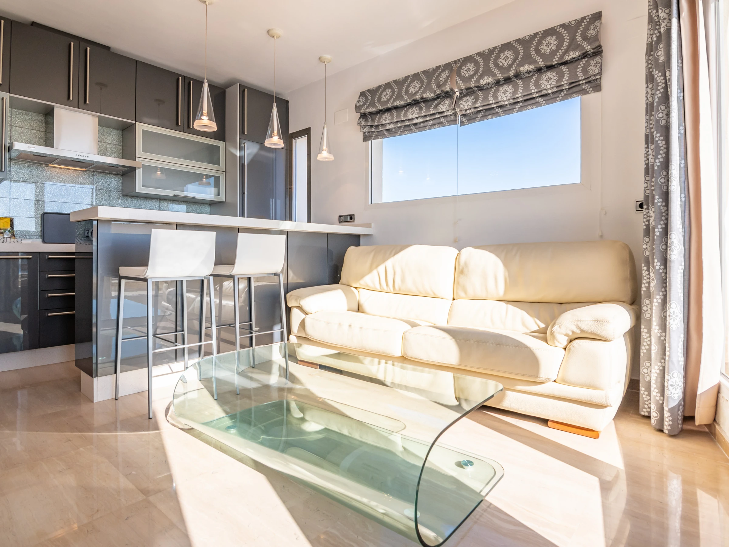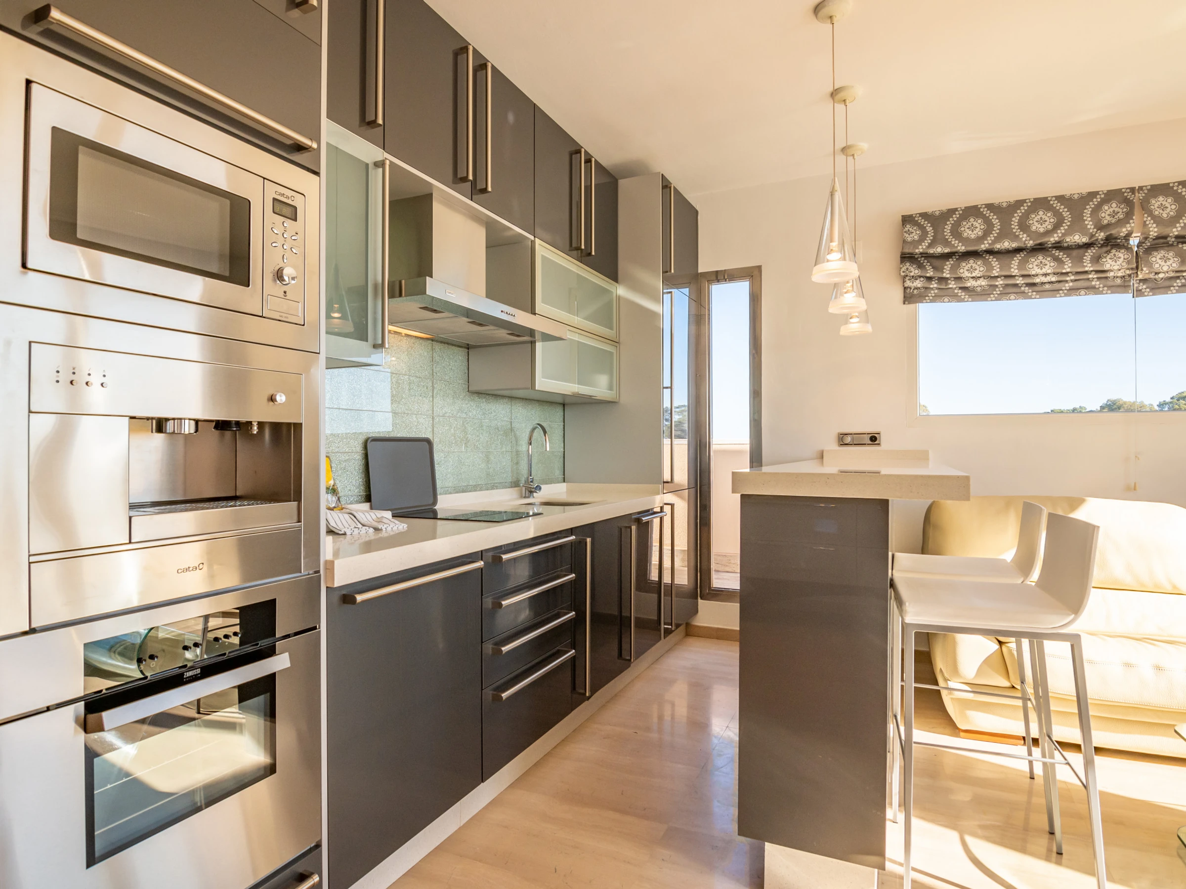 La cocina americana, de vitrocerámica, está equipada con nevera, microondas, horno, congelador, lavadora, lavavajillas, vajilla/cubertería, utensilios/cocina, cafetera, tostadora y exprimidor.