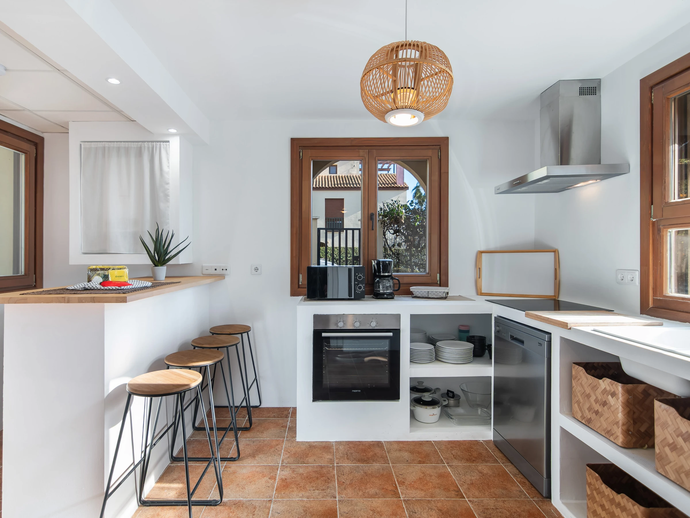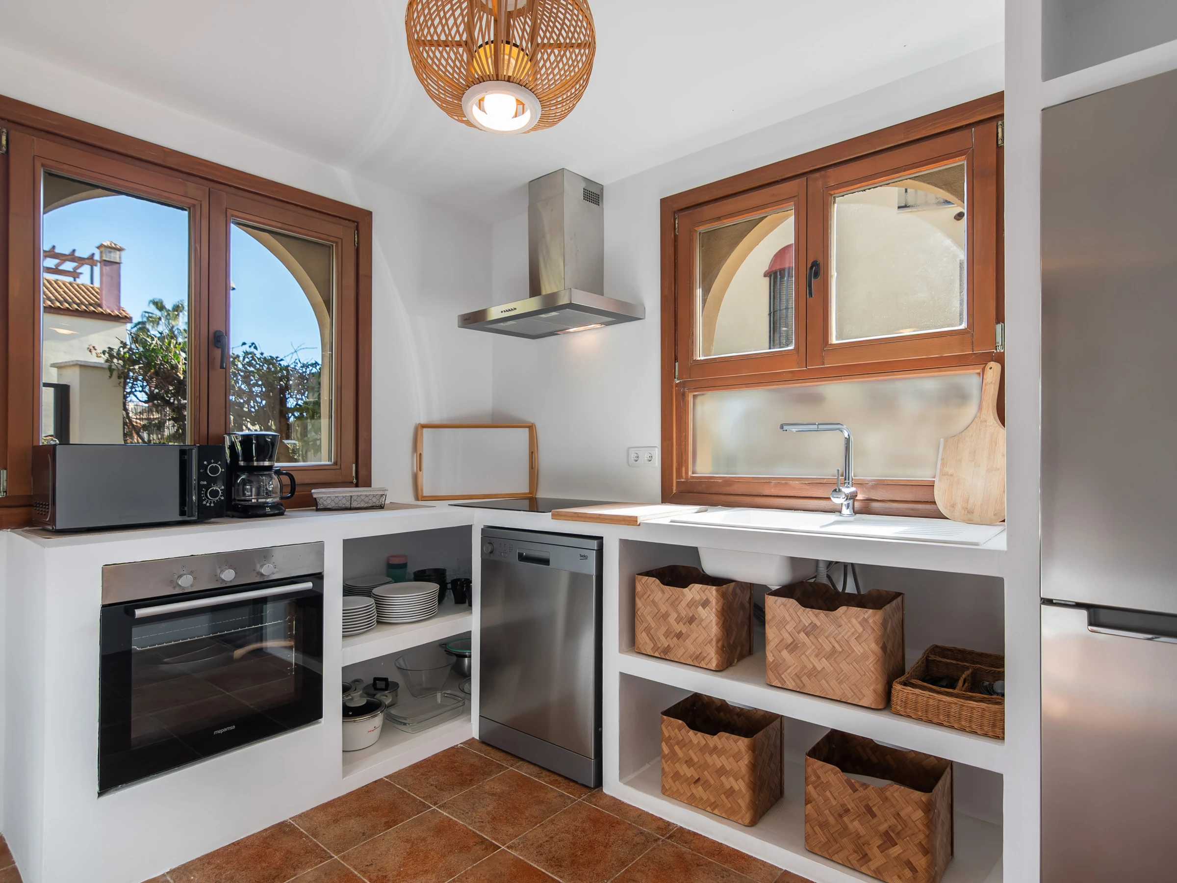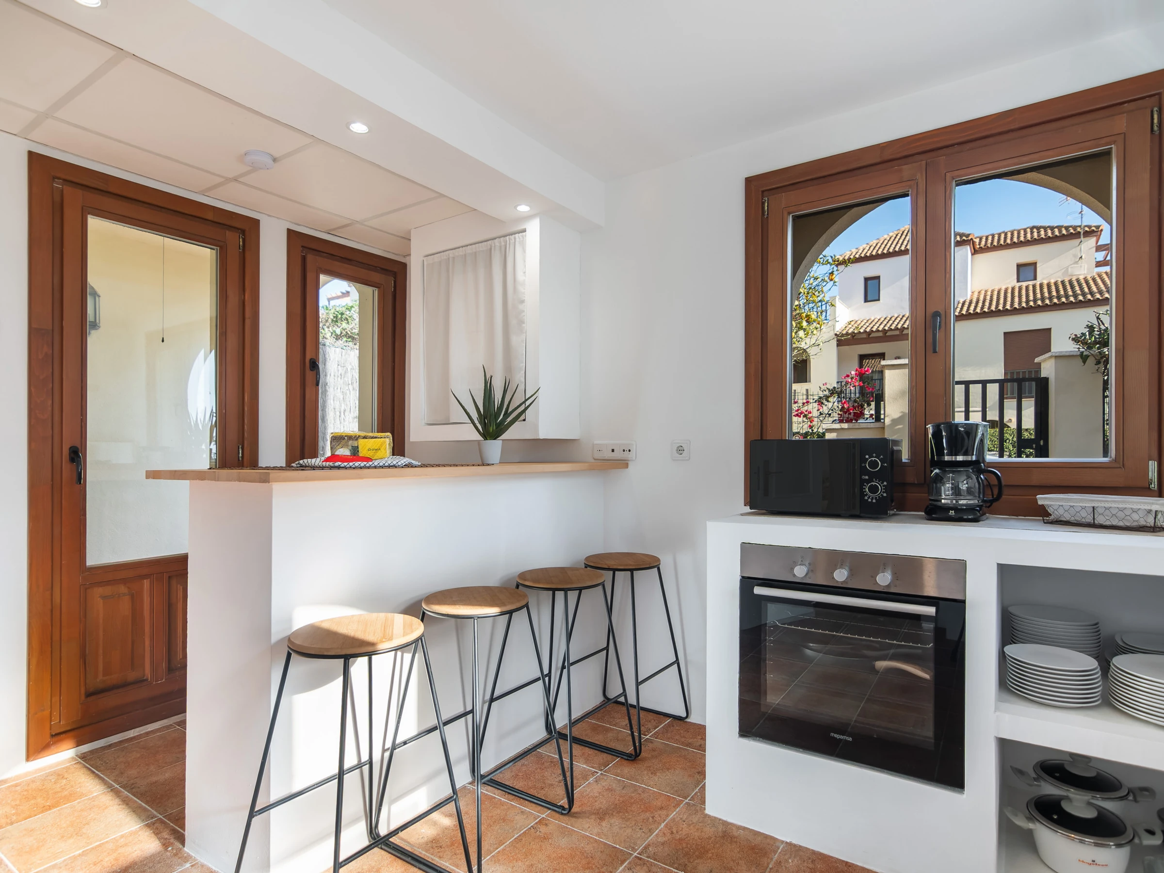 La cocina independiente está completamente equipada con electrodomésticos de última generación, incluyendo nevera, congelador, lavadora, horno, microondas, cafetera, tostadora, exprimidor y menaje completo. Además, cuenta con conexión WiFi y televisión para mantenerte entretenido durante tu tiempo de descanso.