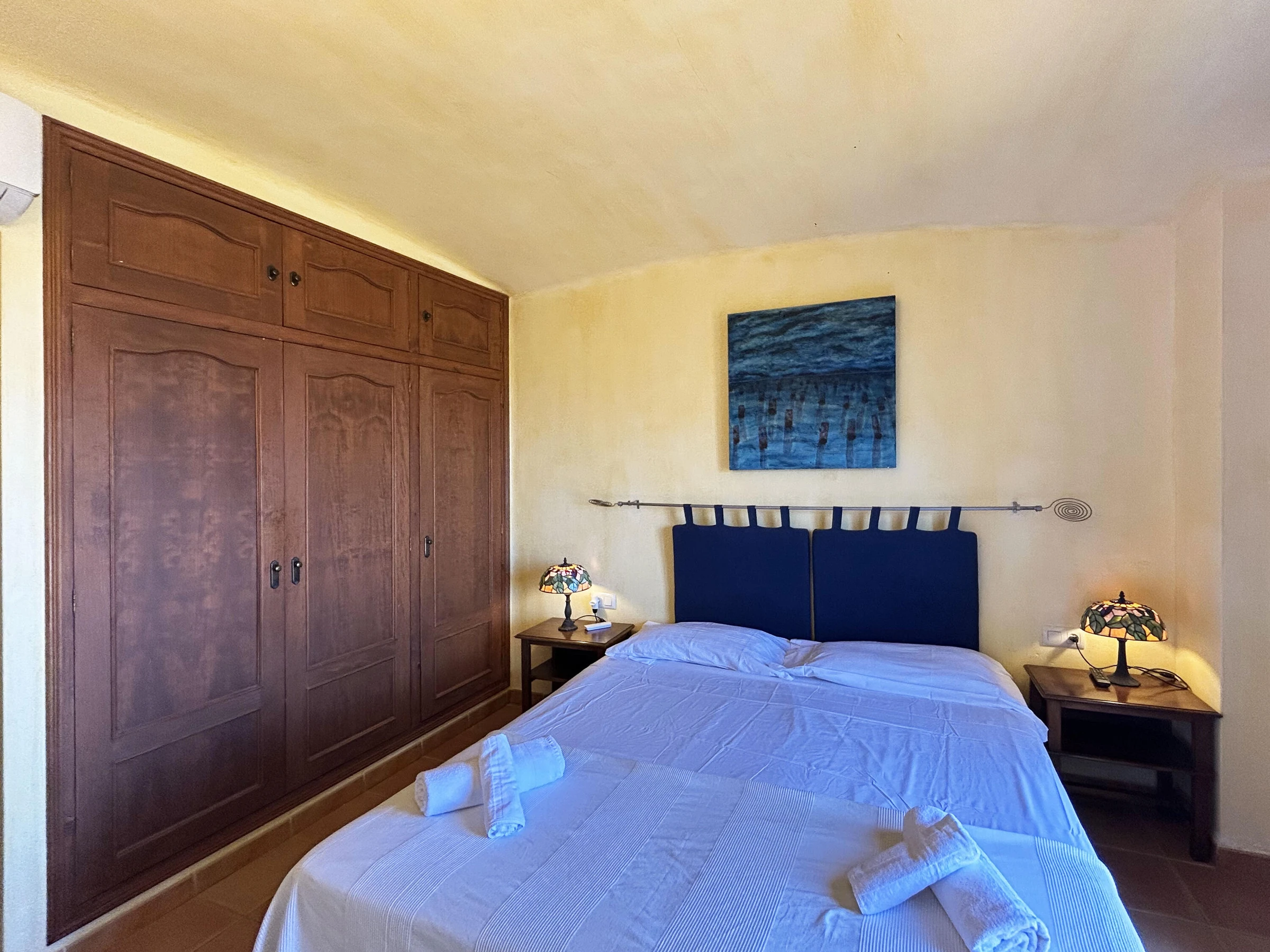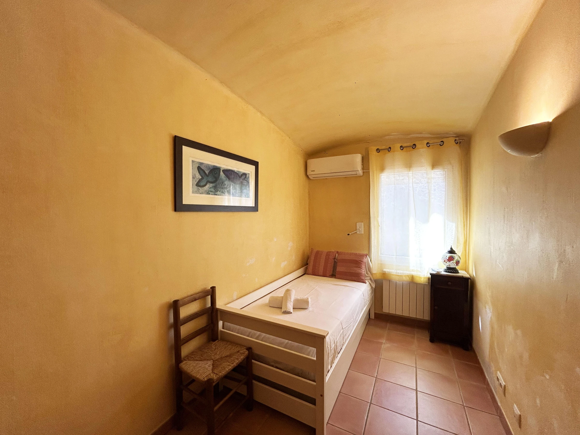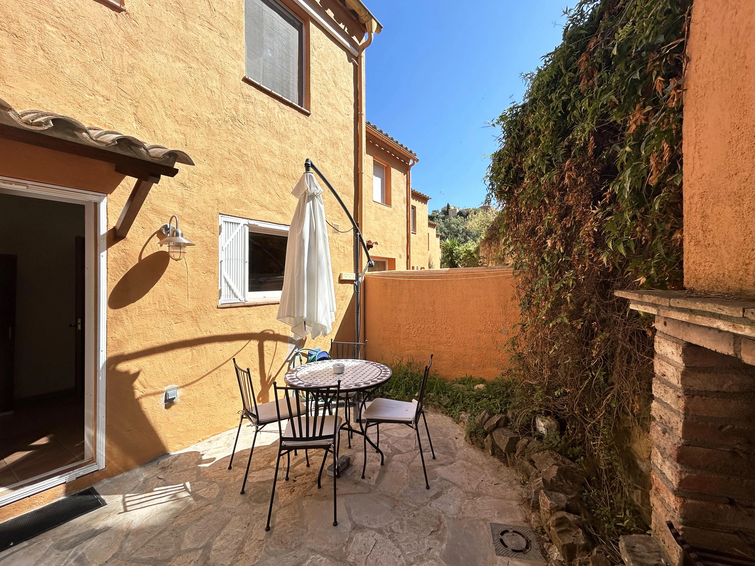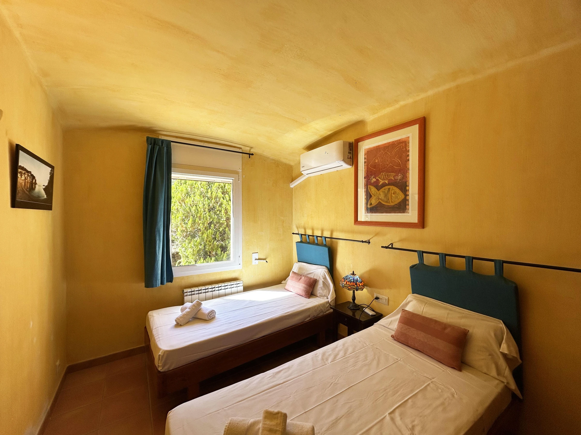 Acogedora casa adosada situada a 2 kilómetros de la playa de Sa Riera y a 3 minutos del centro de Begur. Distribuida en dos niveles consta de salón-comedor con salida a terraza cubierta, un aseo, cocina abierta equipada y con salida a patio trasero. Planta superior con dos dormitorios dobles, un baño con ducha, un dormitorio tipo suite con baño y terraza. Garaje. (1 cama doble, 4 camas individuales) Jardín comunitario con piscina (10 x 6 metros ) para 14 casas. Vistas fantásticas al mar y a las Islas Medes.