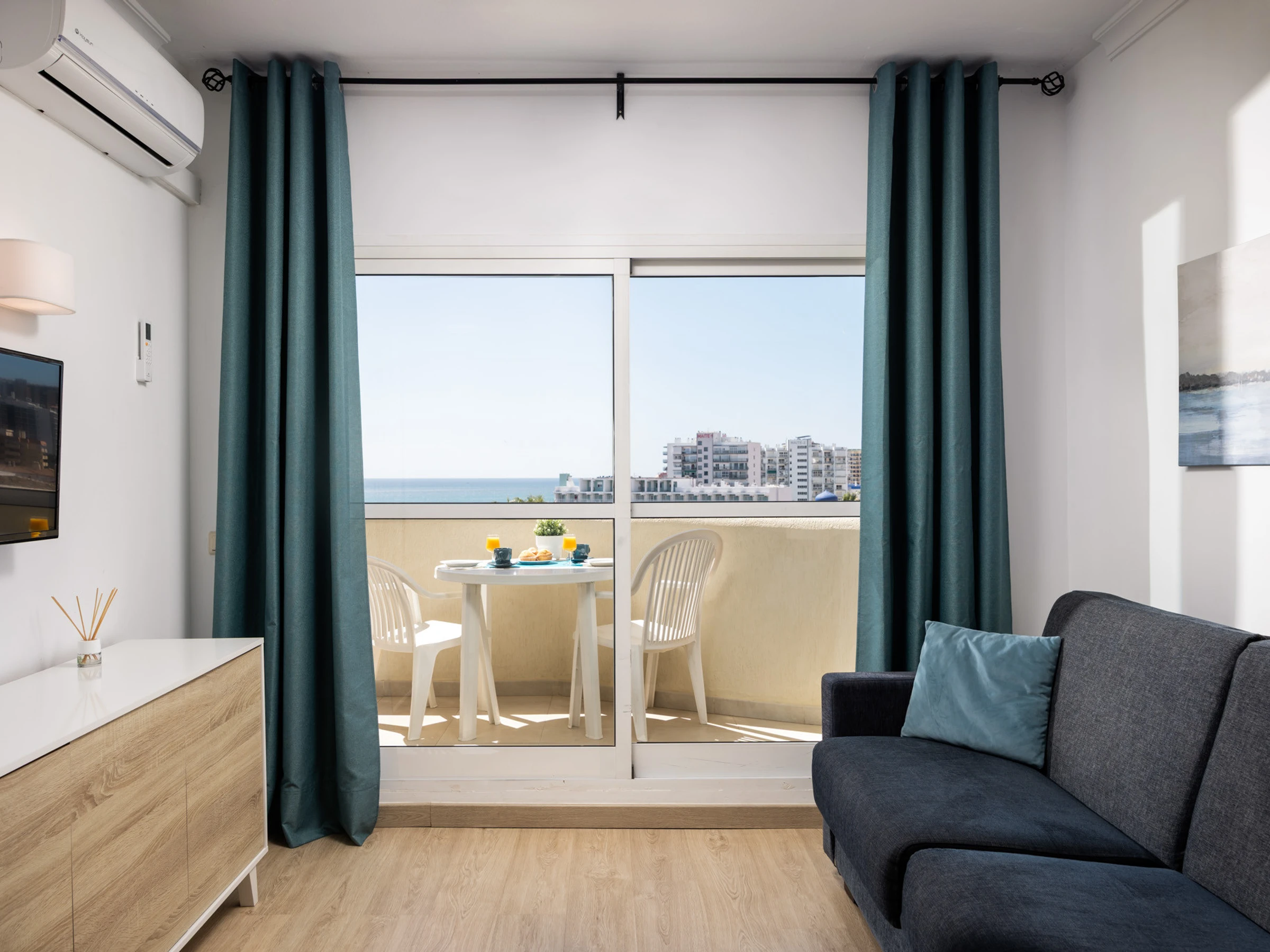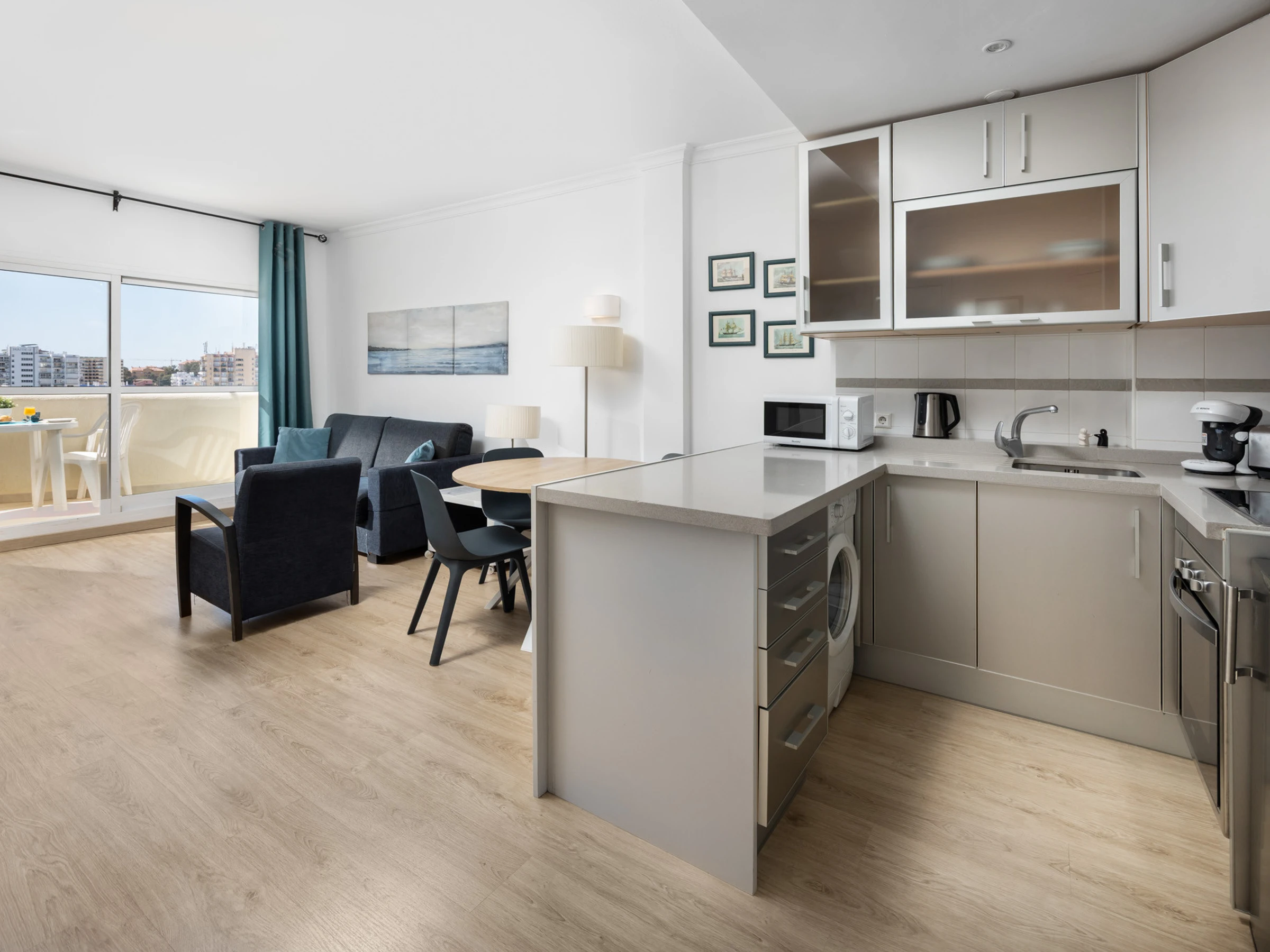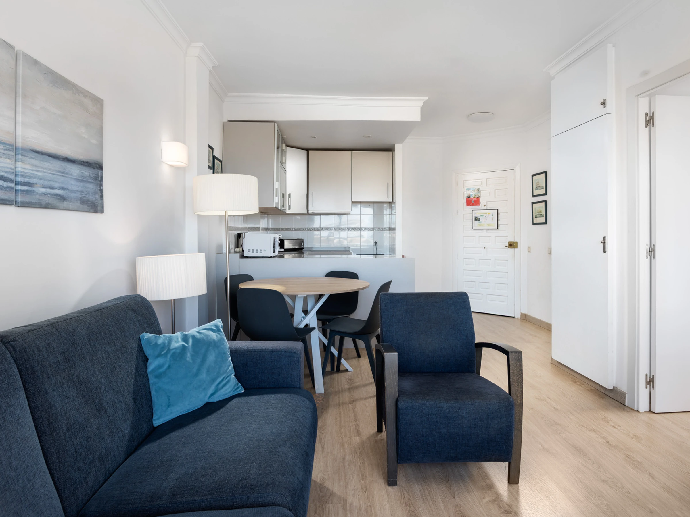 El apartamento cuenta con un dormitorio con cama de matrimonio, sofá cama doble, cocina completamente equipada, baño completo, aire acondicionado, Wi-Fi gratuito y televisión. Una opción cómoda, funcional y bien ubicada para quienes desean combinar descanso, playa y diversión en un mismo lugar.