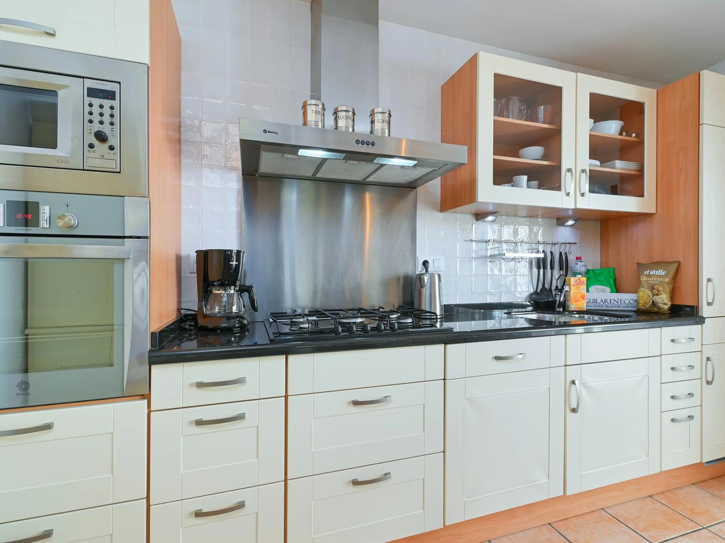 Cocinacocina americana con cocina de gas, horno eléctrico, microondas, lavavajillas, refrigerador-congelador, cafetera, calentador de agua, batidor, tostador y exprimidor