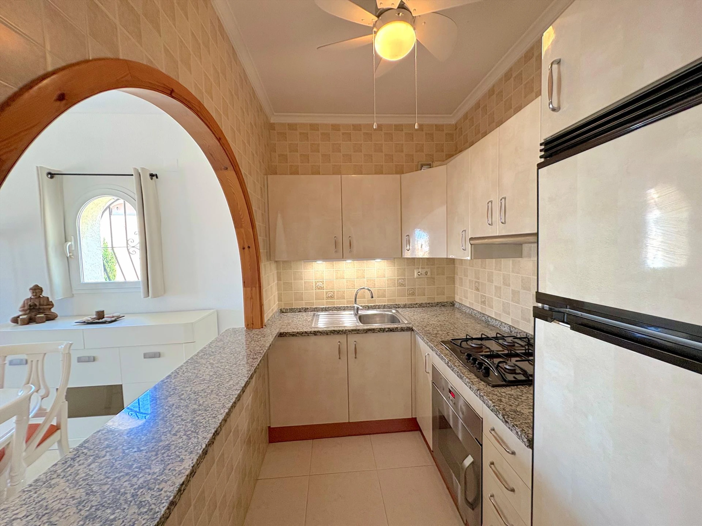 * cocina abierta con placa de gas, horno eléctrico, microondas,