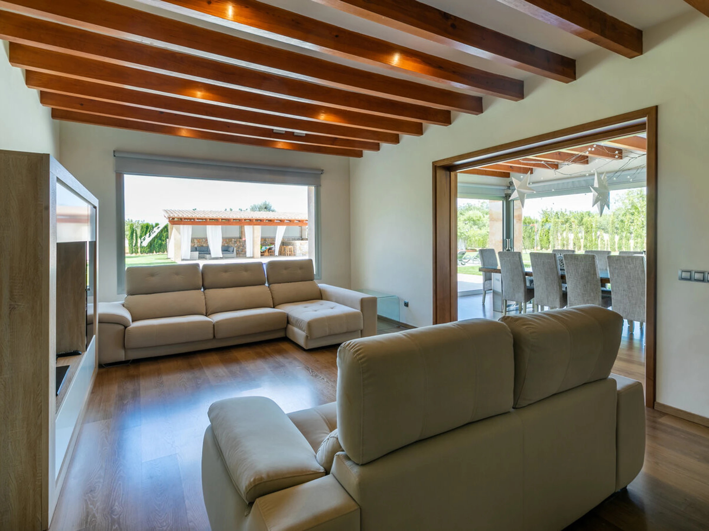 Villa Es Velar Only Families rezuma lujo por cada grieta, mientras que la arquitectura fresca y simple de esta casa construida por el propietario todavía cultiva las tradiciones mallorquinas. Cipreses recién plantados, junto con olivos y pinos, y exuberantes prados verdes conforman el paisaje de este jardín vallado. Esta villa es muy recomendable para familias, sobre todo por el trampolín, la portería de fútbol y otros equipos de juego en el jardín. Naturalmente, la finca de esta villa orientada al sur ofrece una piscina de tamaño adecuado con profundidad graduada, rodeada por una gran terraza que llega hasta la casa. Después de nadar, puede hacer uso de la ducha al aire libre con paredes y luego relajarse en una de las ocho tumbonas: cuatro sombrillas ofrecen una amplia sombra cuando sea necesario. La casa tiene una terraza cubierta con iluminación y un comedor. Este es el lugar para disfrutar de una barbacoa, deleitando su paladar con los deliciosos e intensos aromas de los productos frescos caseros de Mallorca. También hay otra zona de estar al aire libre en el balcón de la planta superior de la villa, que ofrece unas vistas espectaculares de las montañas de Tramuntana.