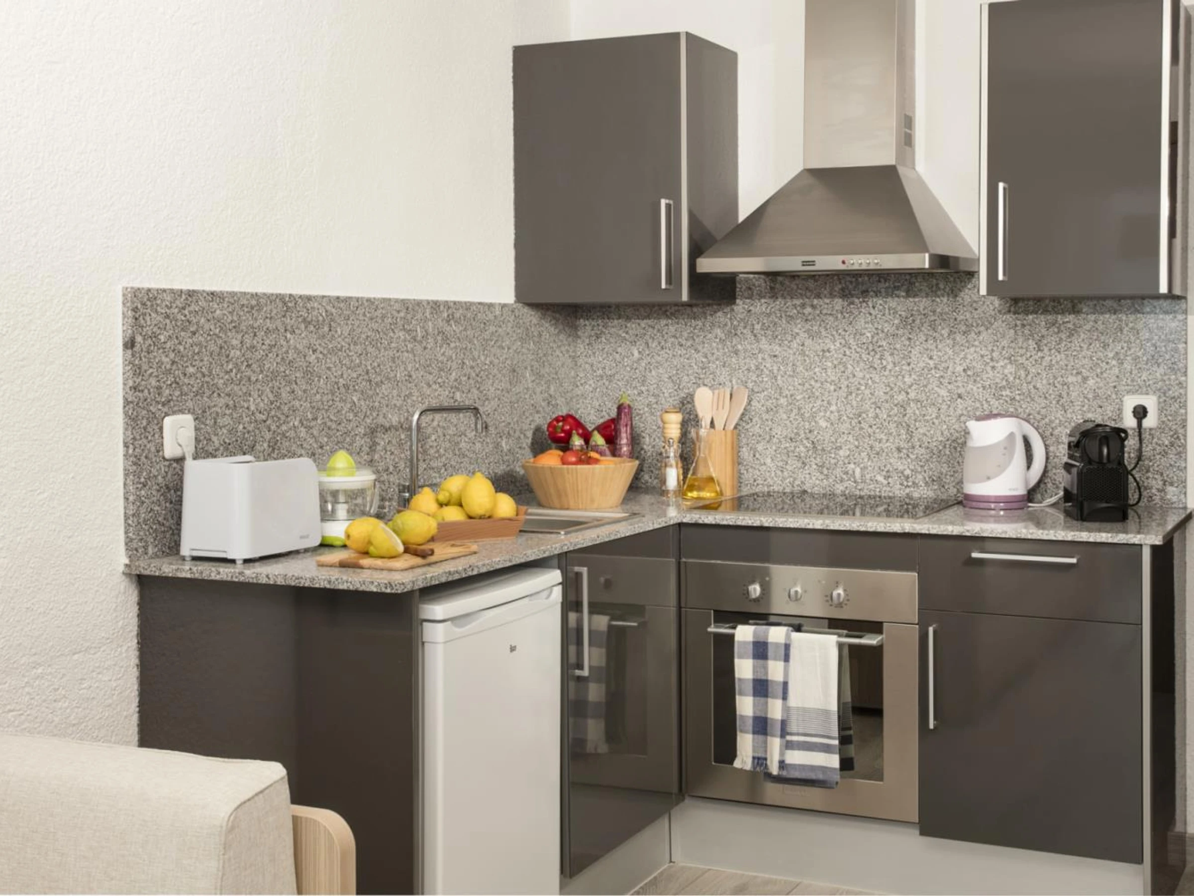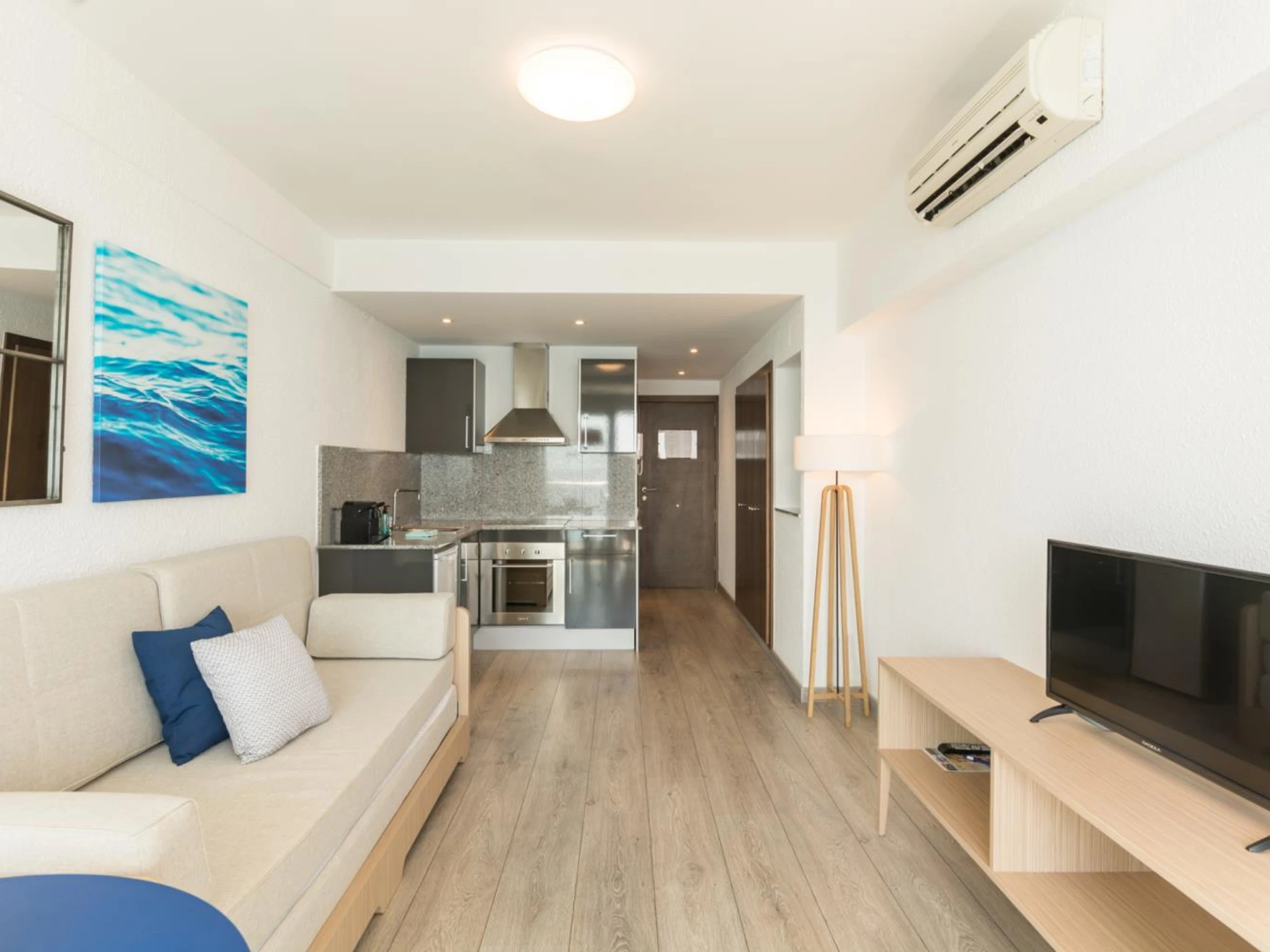 Cocina americana equipada y sala de estar.