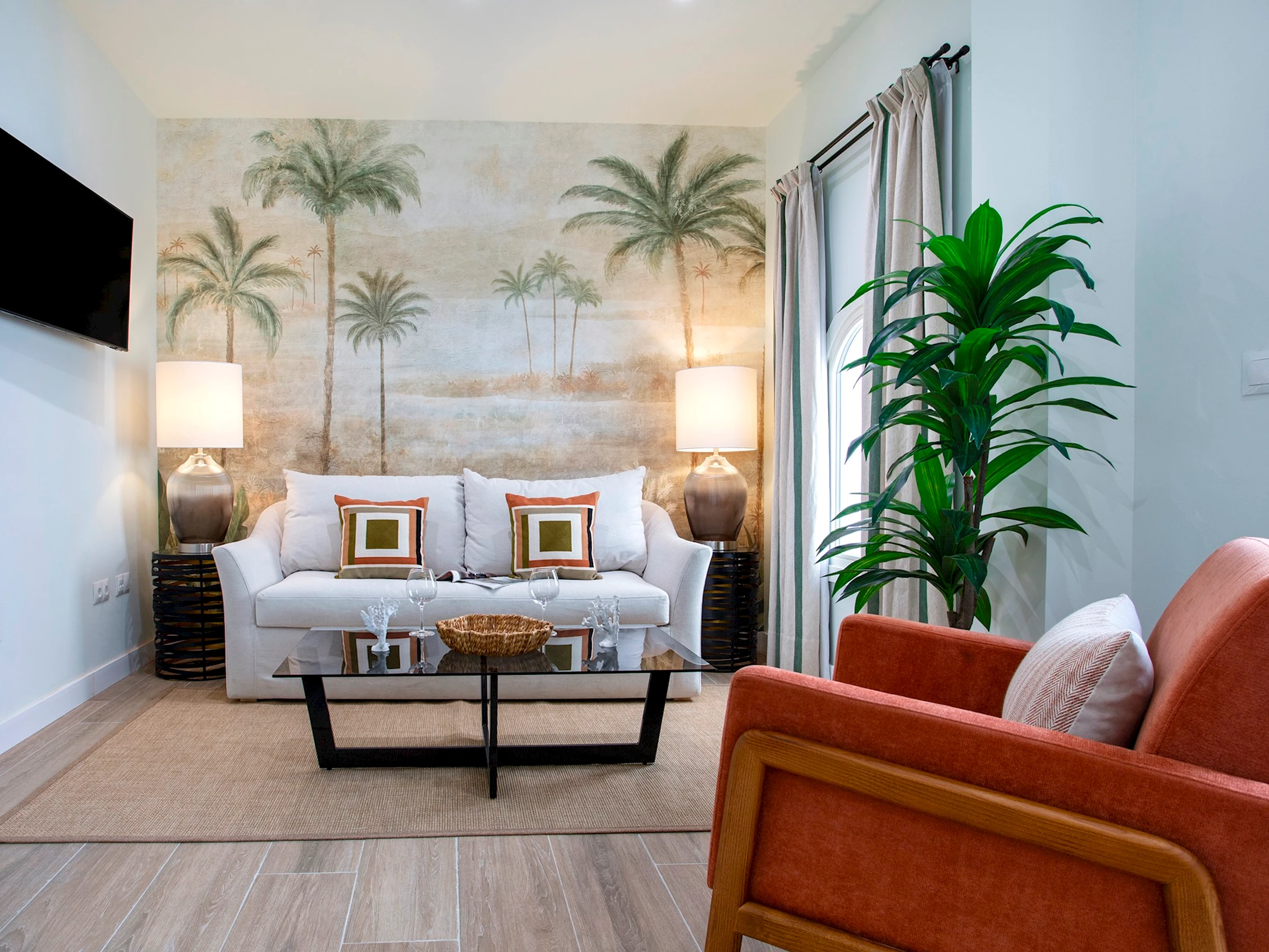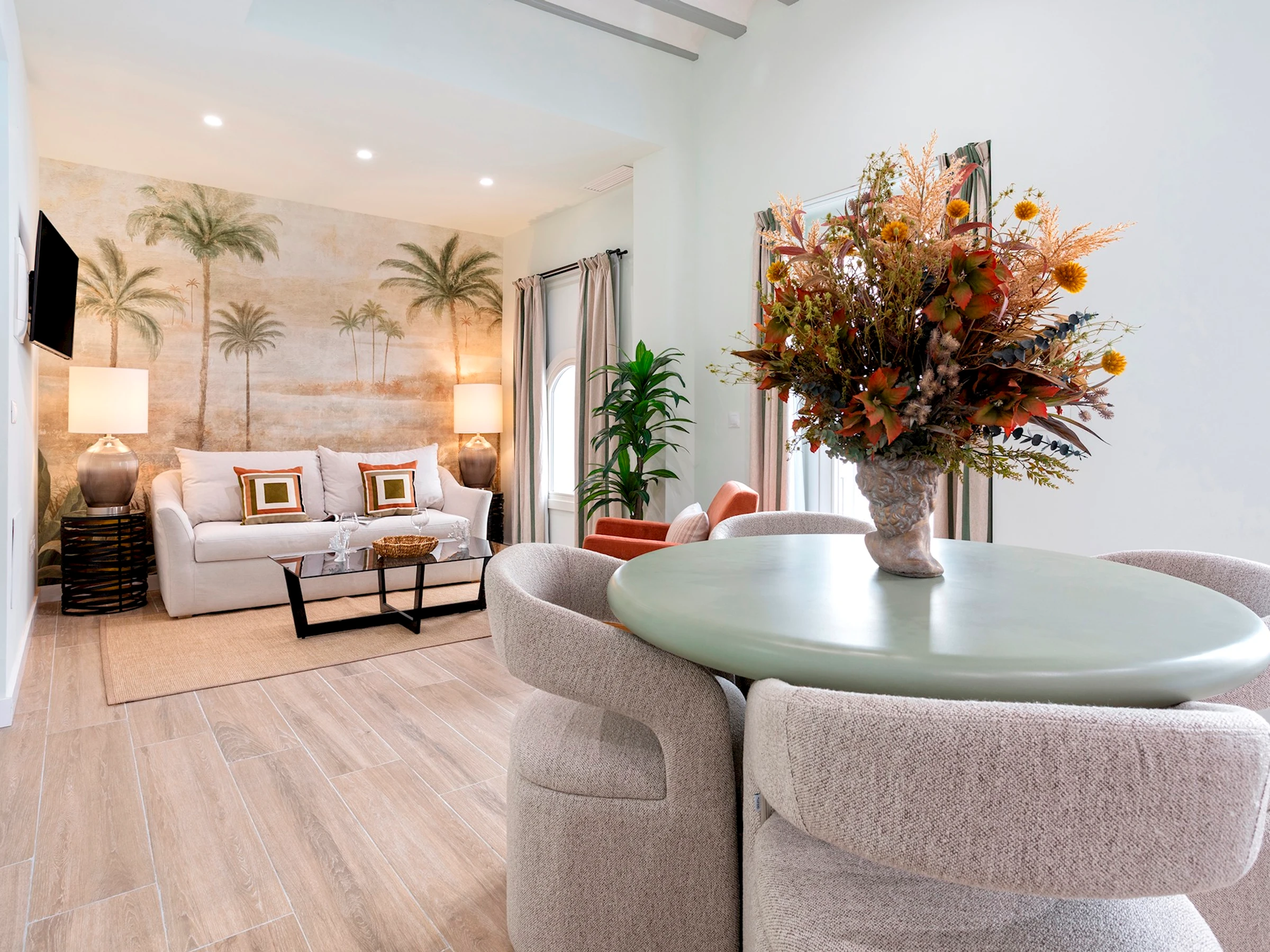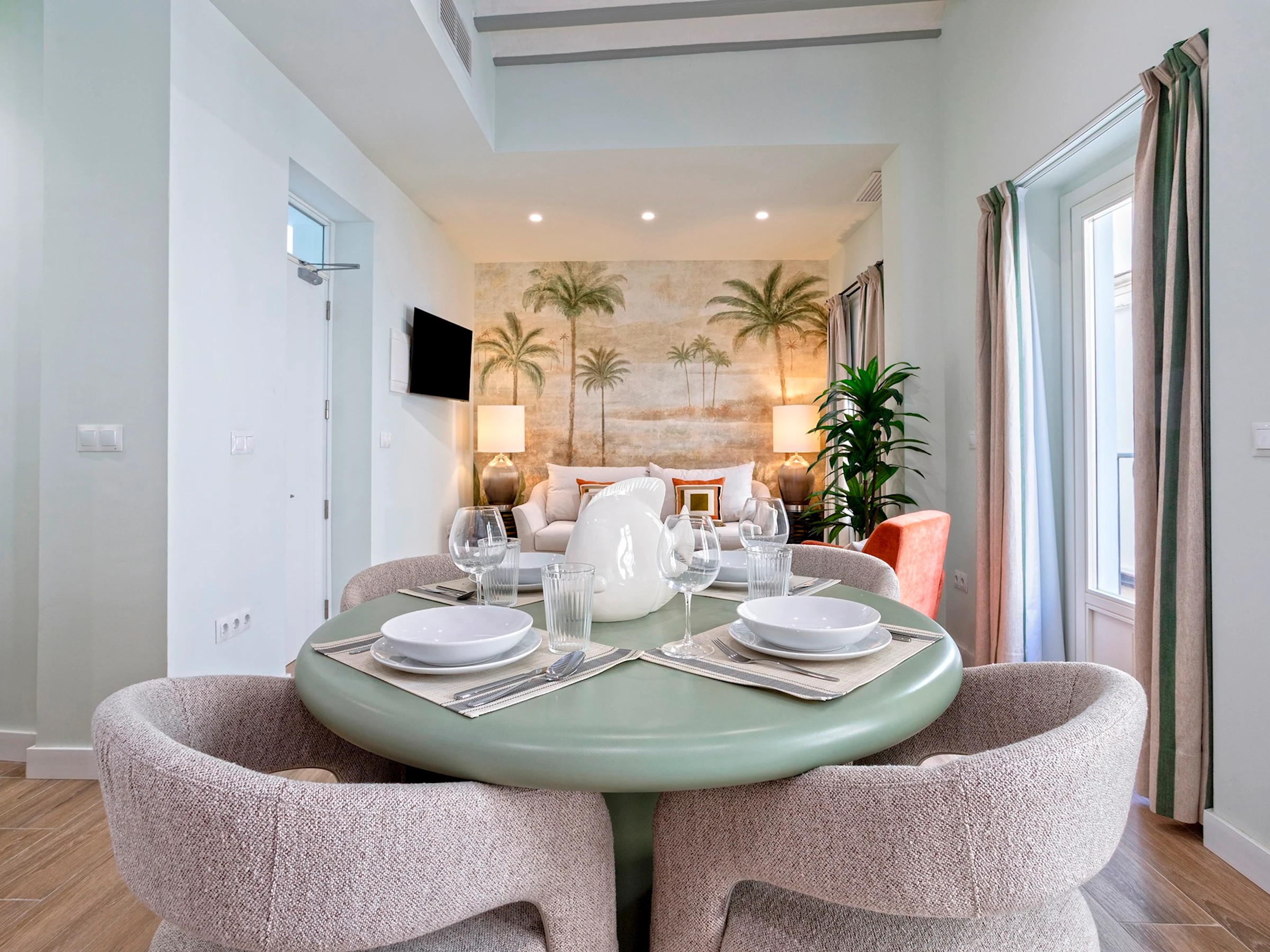 Apartamento situado en la primera planta de una preciosa finca gaditana, con orientación exterior e interior, que combina confort y estilo. El salón exterior es amplio y luminoso, con dos balcones que dan a la calle Patrocinio, un cómodo sofá cama, butaca, mesa baja y Smart TV, ideal para relajarse después de un día explorando Cádiz.