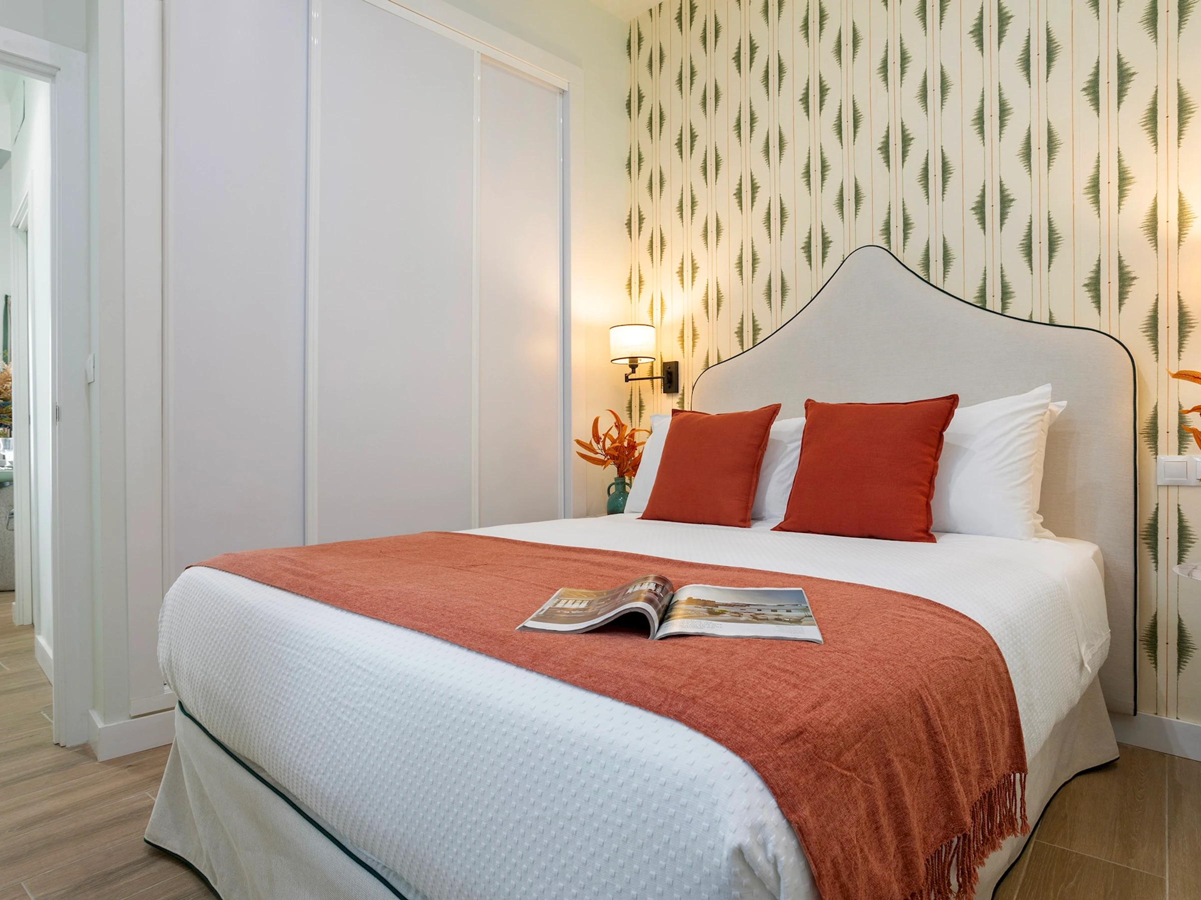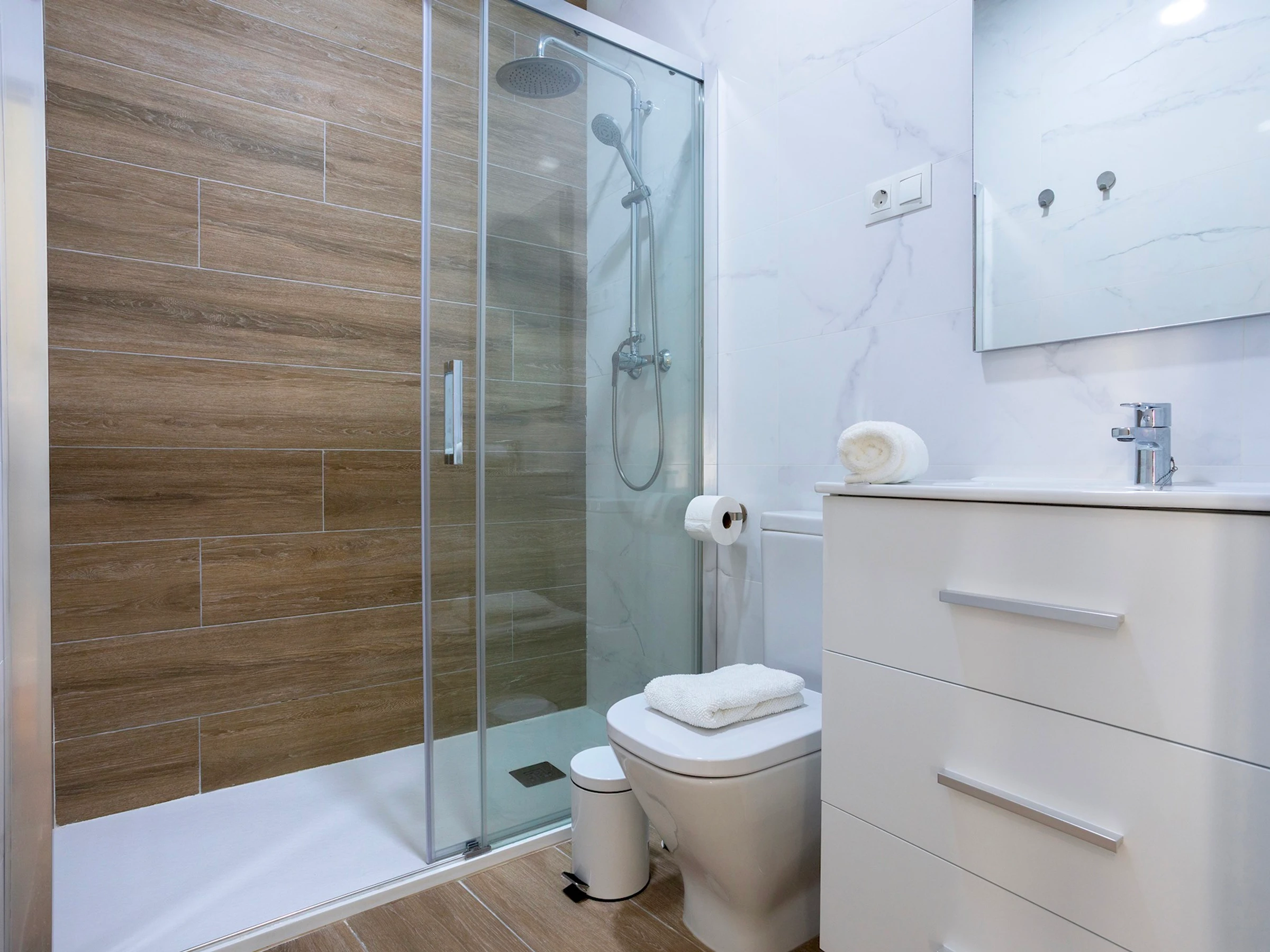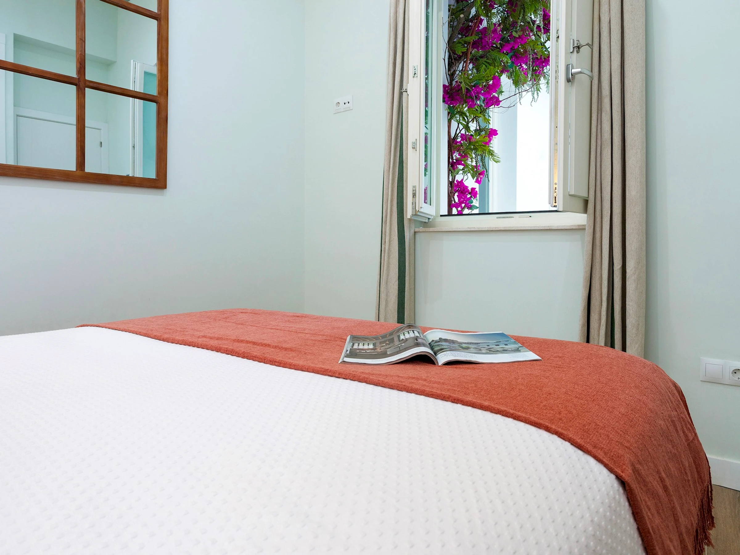 El dormitorio interior es tranquilo y confortable, con cama de matrimonio (1,50 x 2 m), armario empotrado, mesitas de noche y cómoda, con ventilación al patio interior comunitario. El baño moderno, con ducha y mampara, ofrece funcionalidad y estilo.