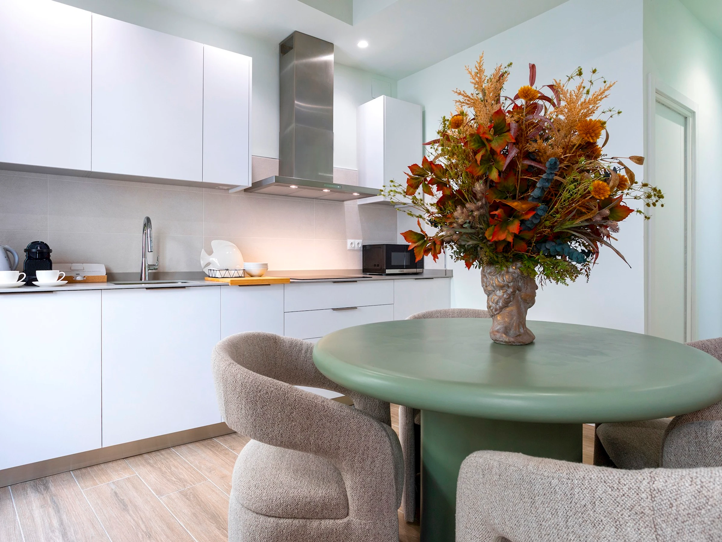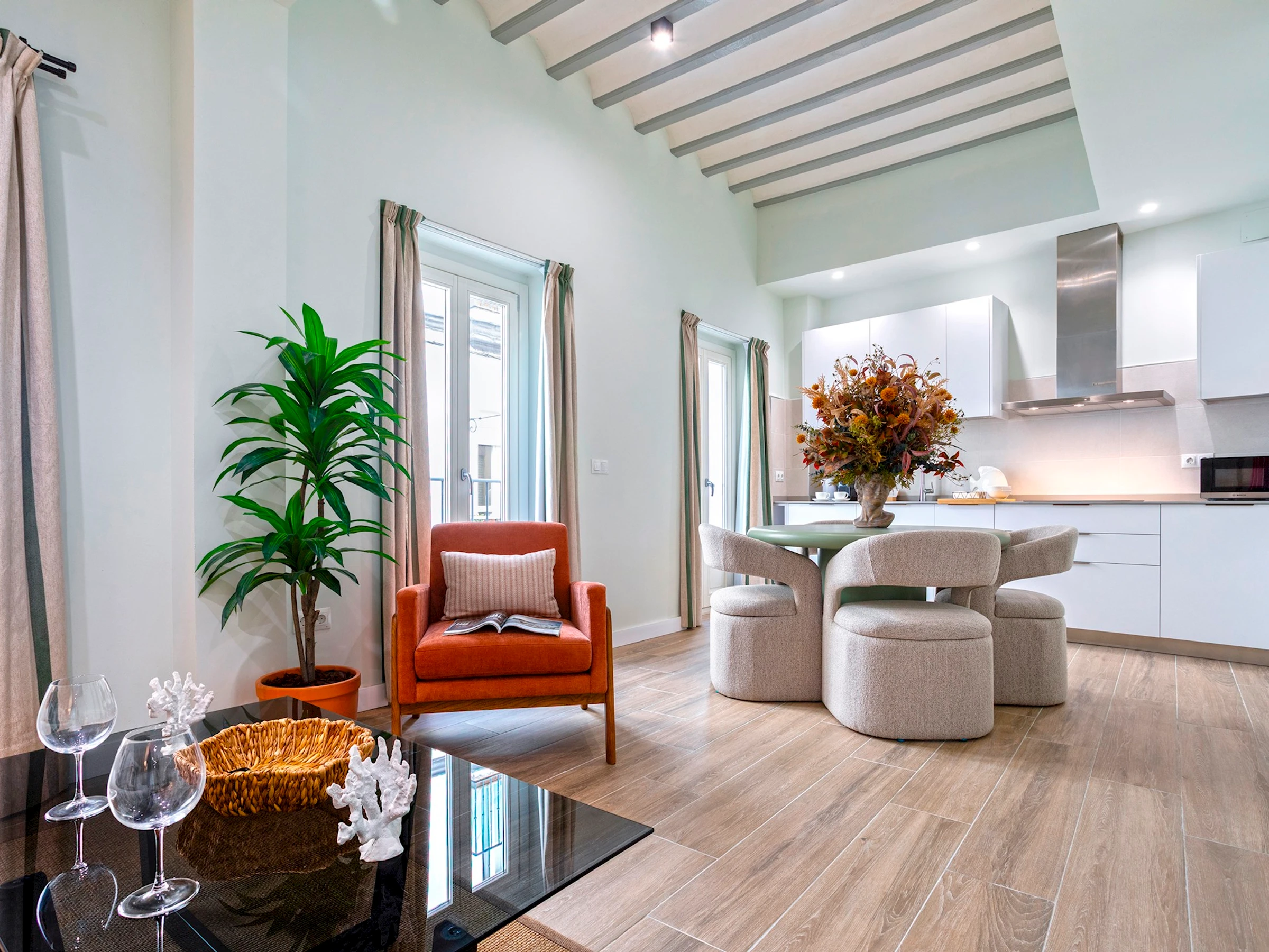 La cocina abierta, totalmente equipada, se complementa con un acogedor comedor con capacidad para 4 personas, perfecto para compartir tus comidas en familia o con amigos.